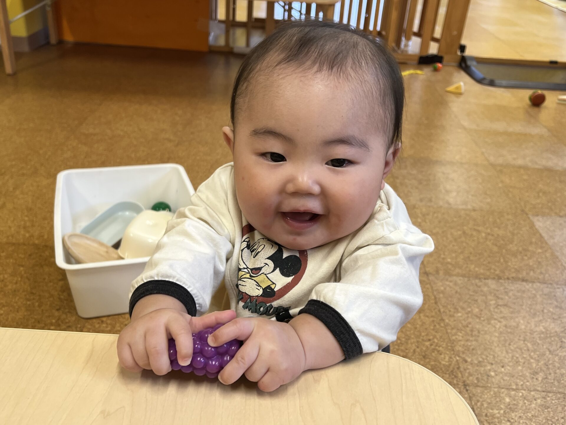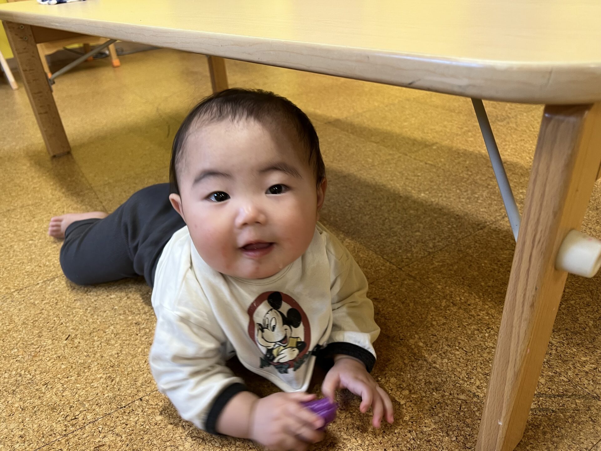 おやつの時間に、0歳児・うみチームを覗いてみると、癒しのNくんが、机の下からひょっこり顔を出していました😄