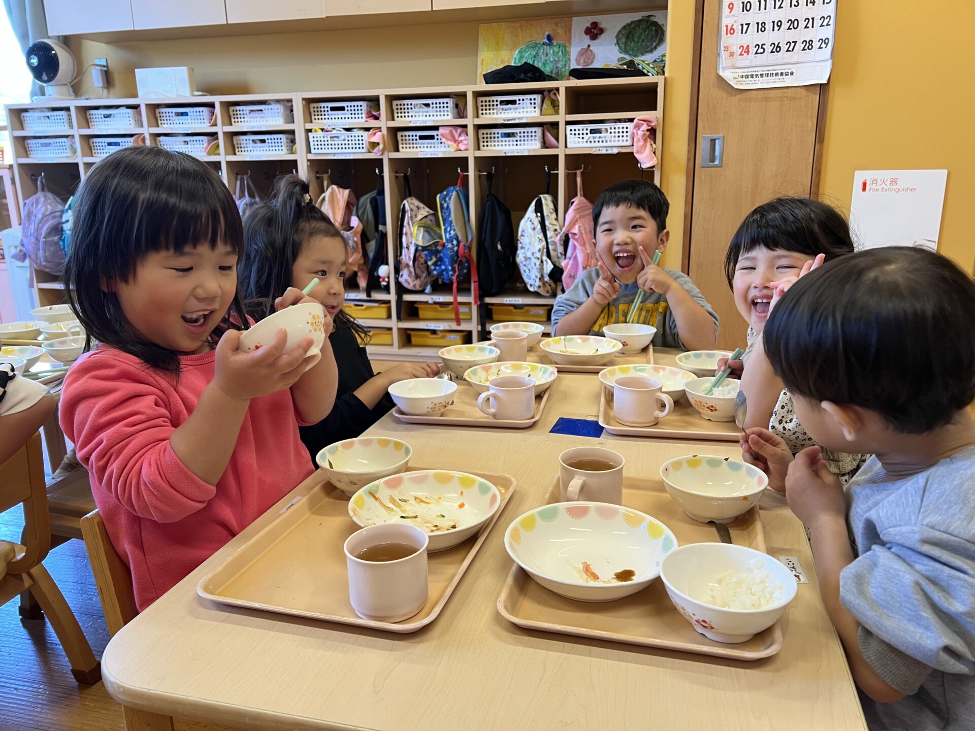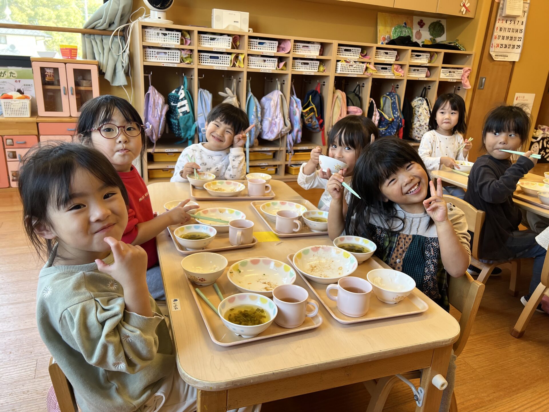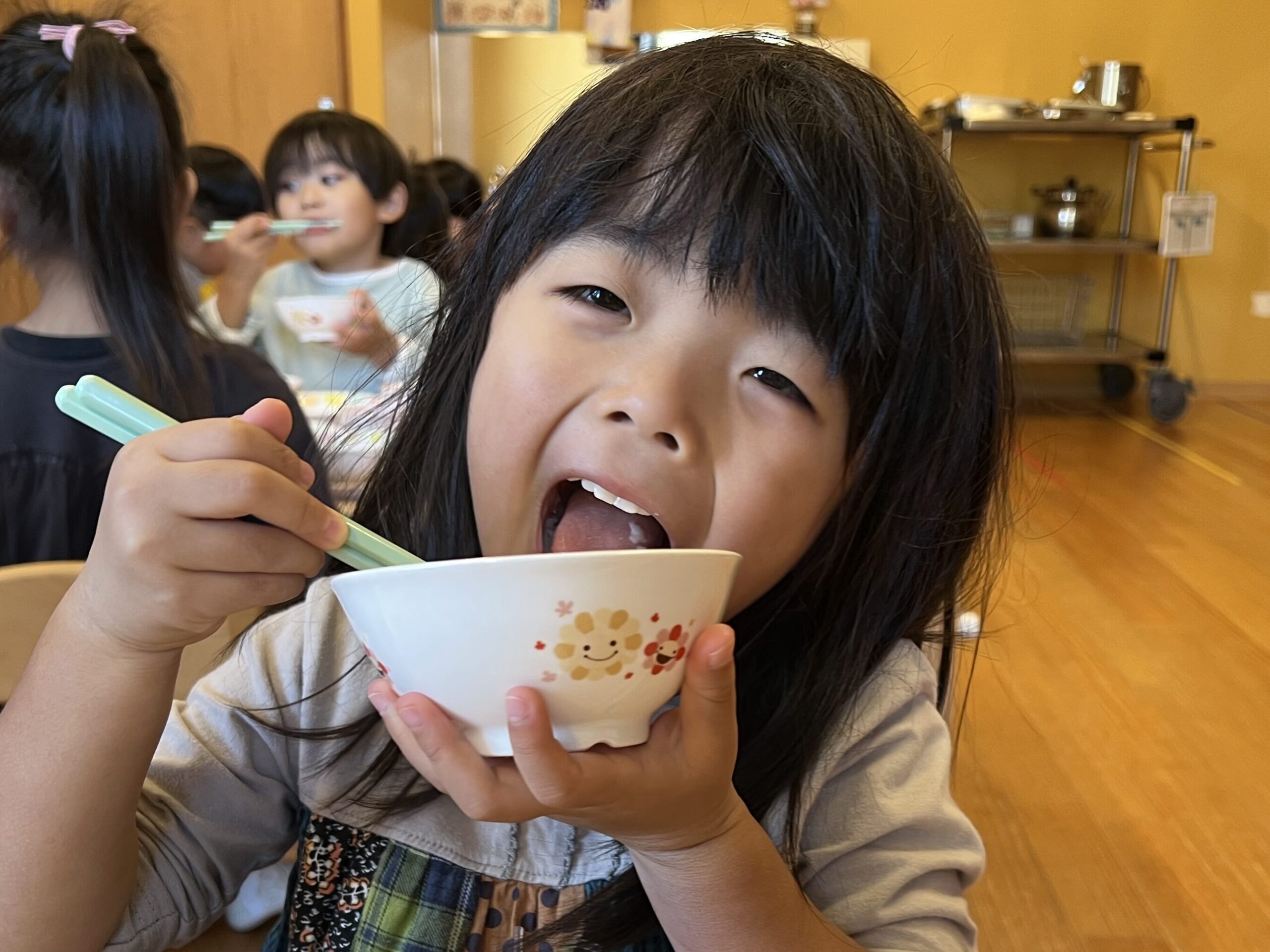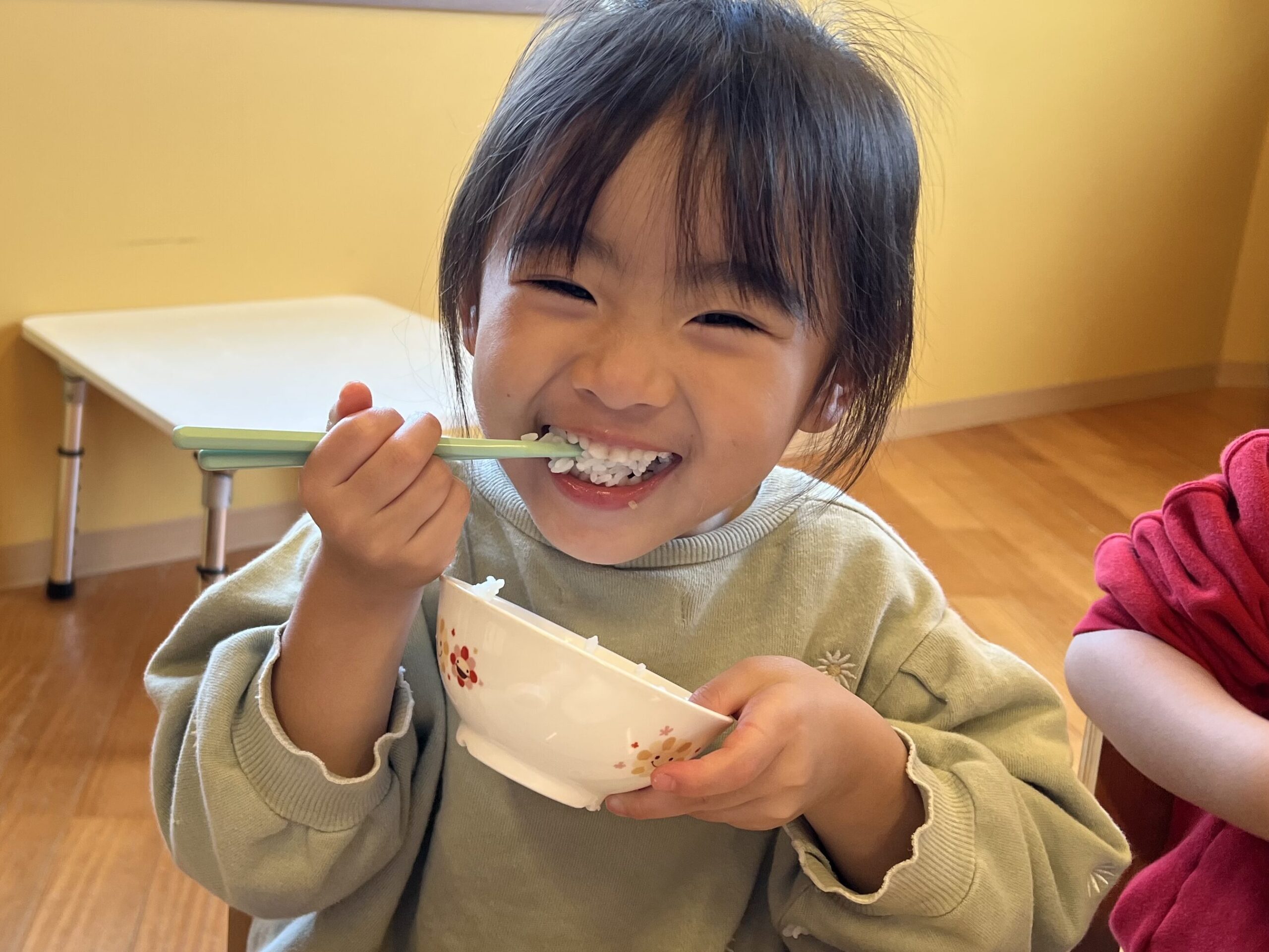 「せんせー見てて!」と頑張ってご飯をモリモリ食べるKちゃん😊昨日、くじらチームさんが『おむすび岩登山🍙』に出かけていたのを知り、「Kがくじらチームになったら、おむすび岩登るんだ😊」と今から楽しみにしているようです。