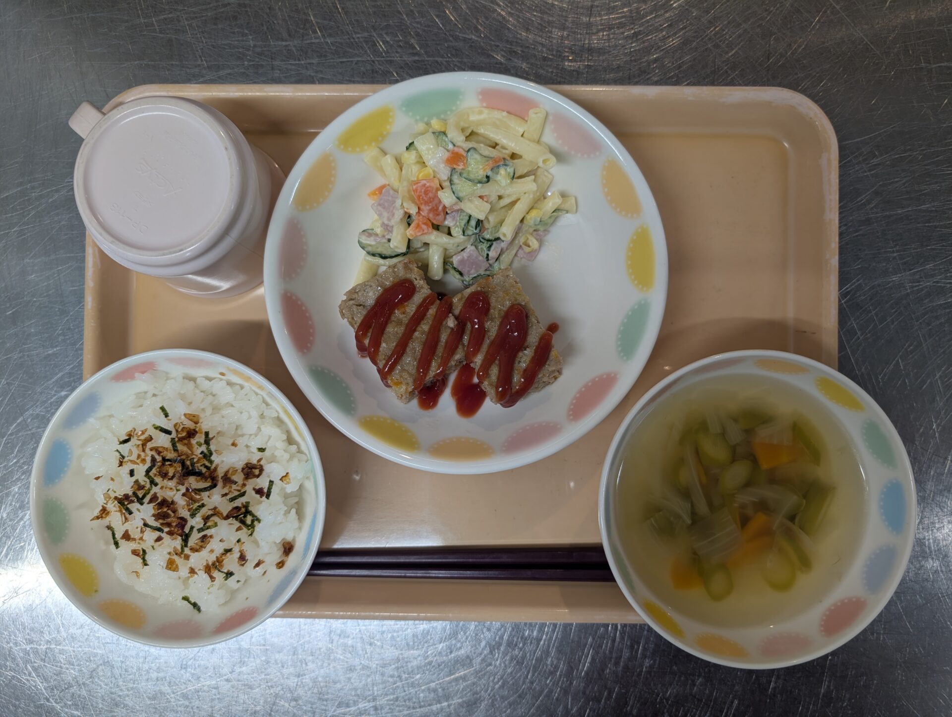 お誕生日給食のメニューは、ふりかけご飯(おかか)、ミートローフ、マカロニサラダ、コンソメスープです😊