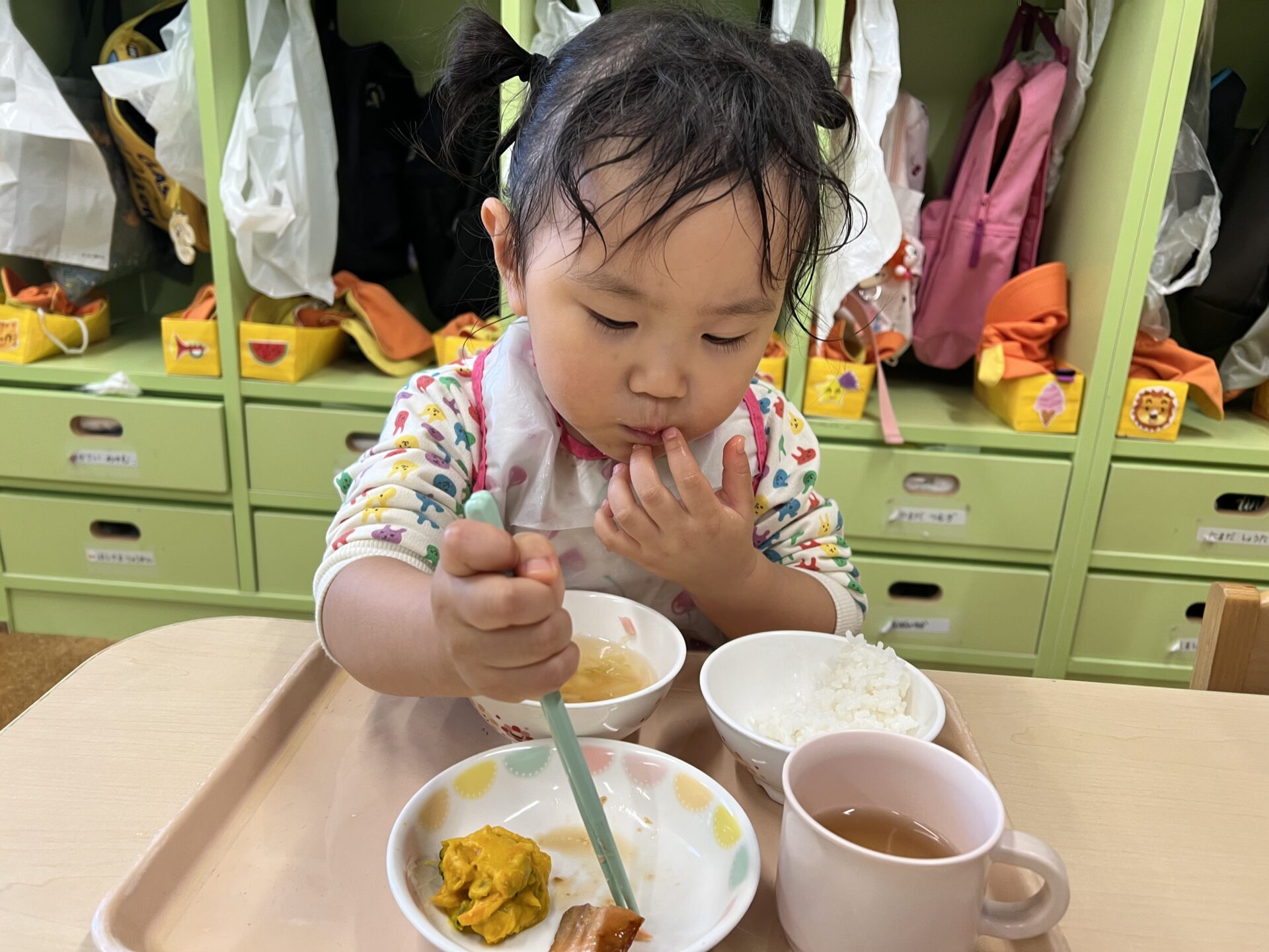 本当に絵にかいたような2歳児・あめチームさんで、笑ってしまいました(笑)Mちゃんは、まさに葛藤中。色んなことを「自分で!」と挑戦中です😊