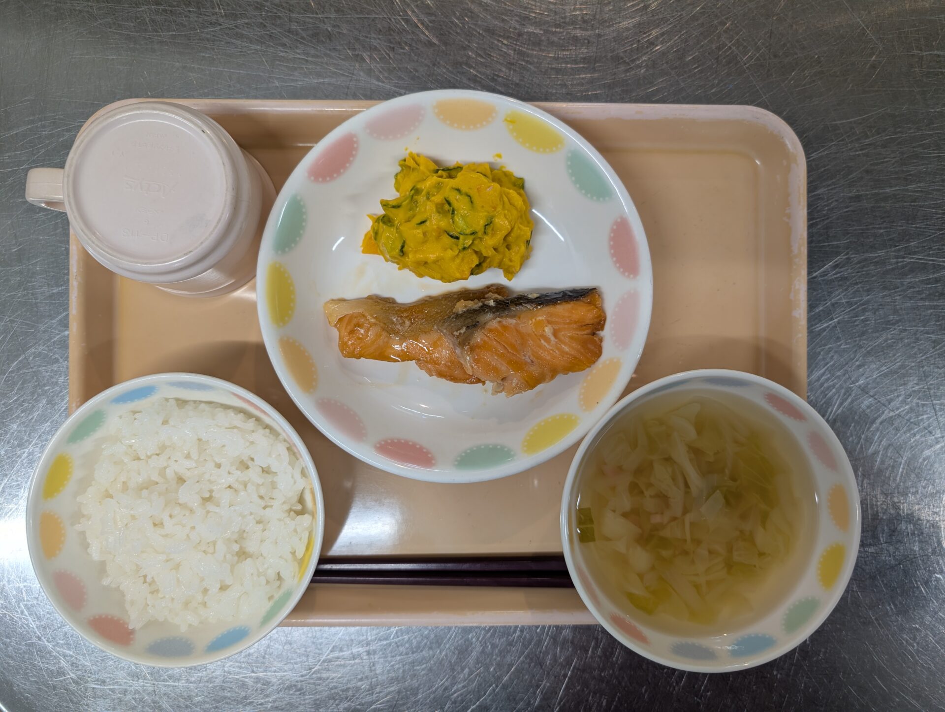 今日のメニューは、ご飯、鮭の照り焼き、かぼちゃのサラダ、キャベツのすまし汁です😊