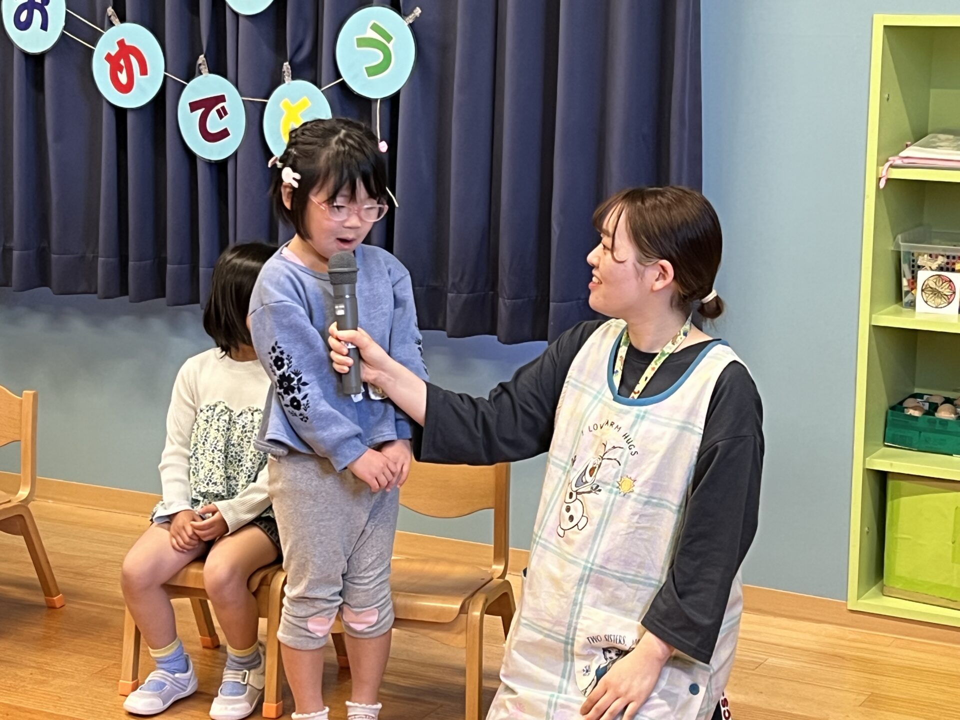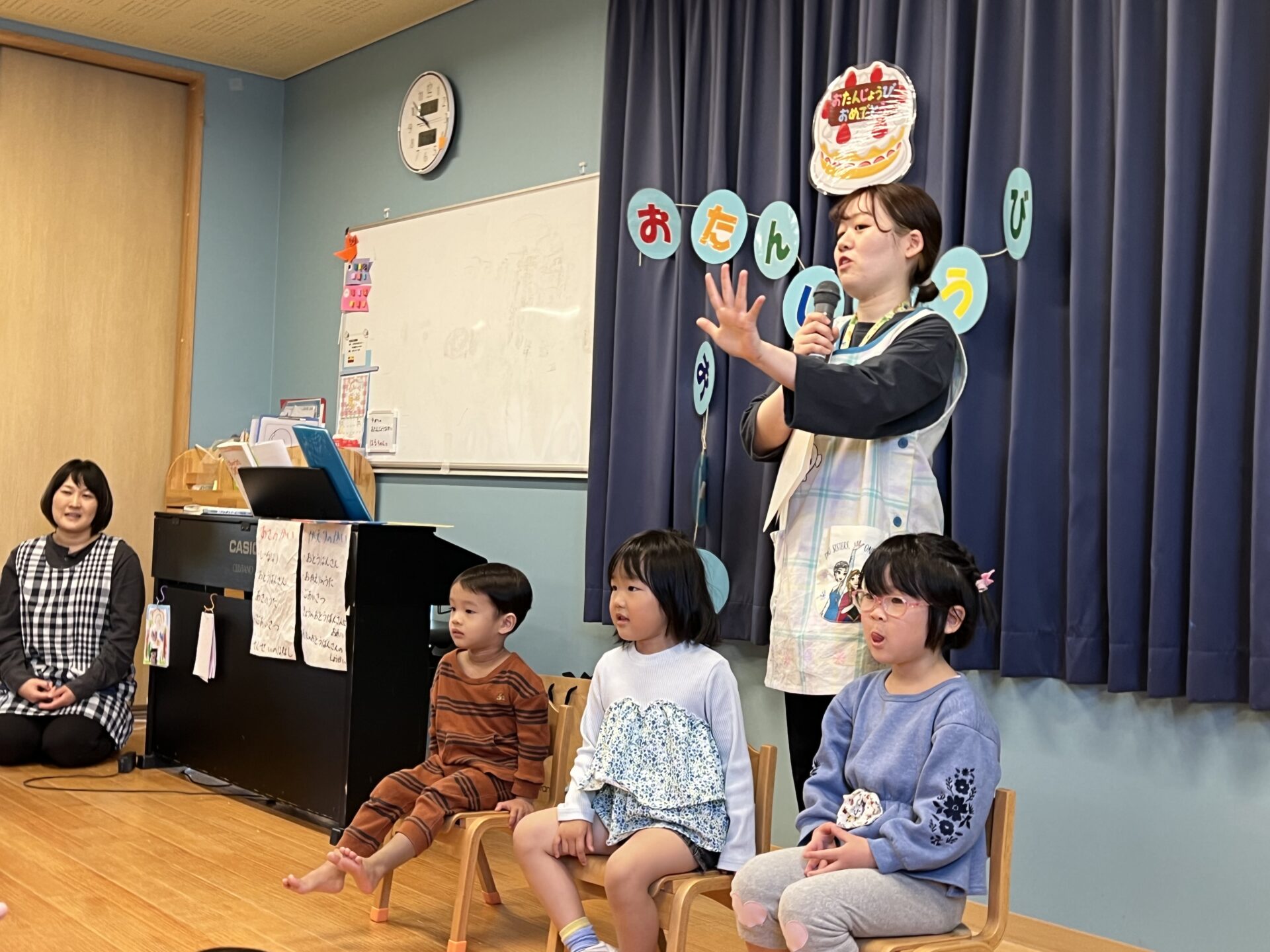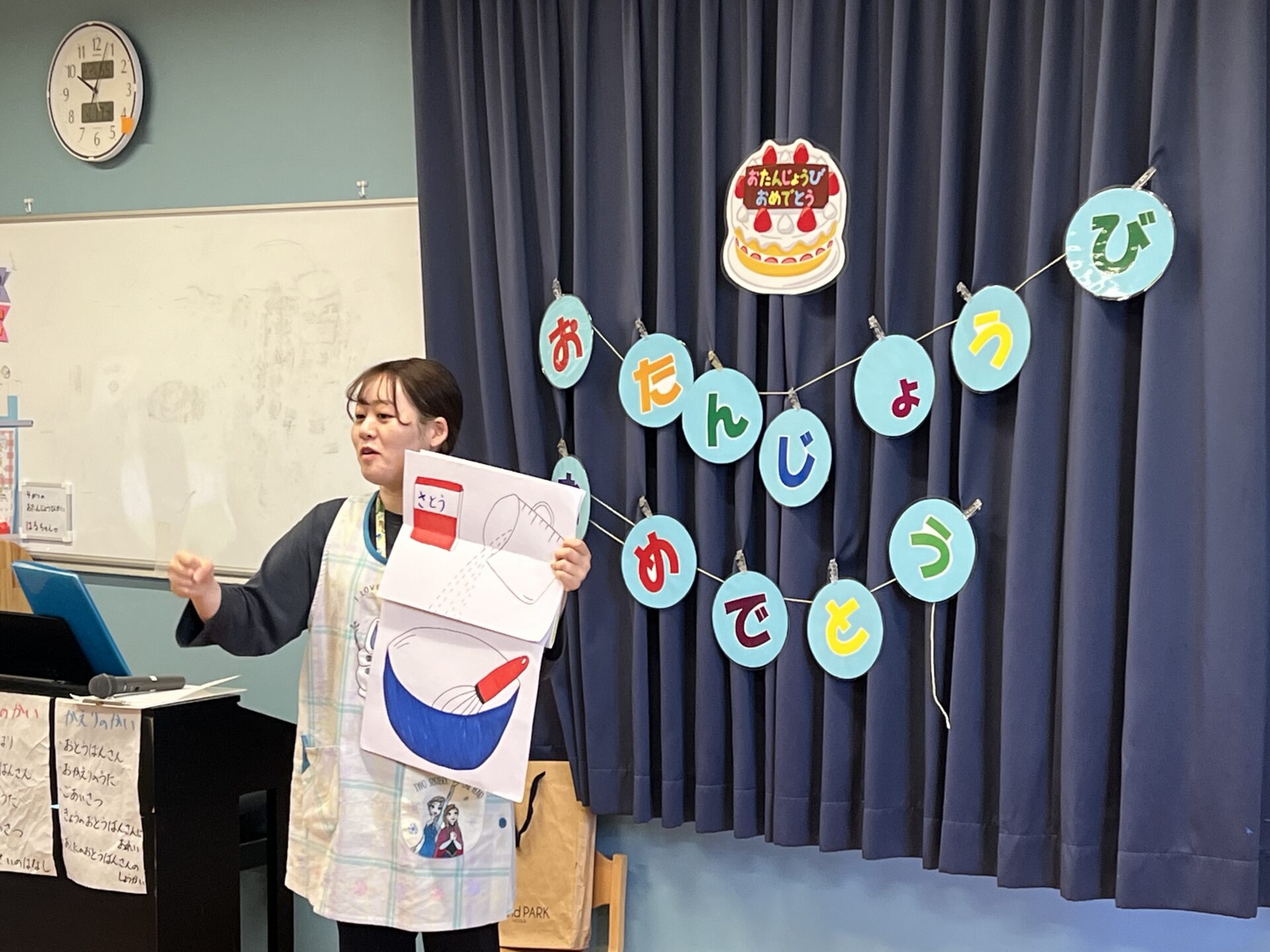 誕生会では、名前と年、好きな食べ物など、インタビューをしていきます。