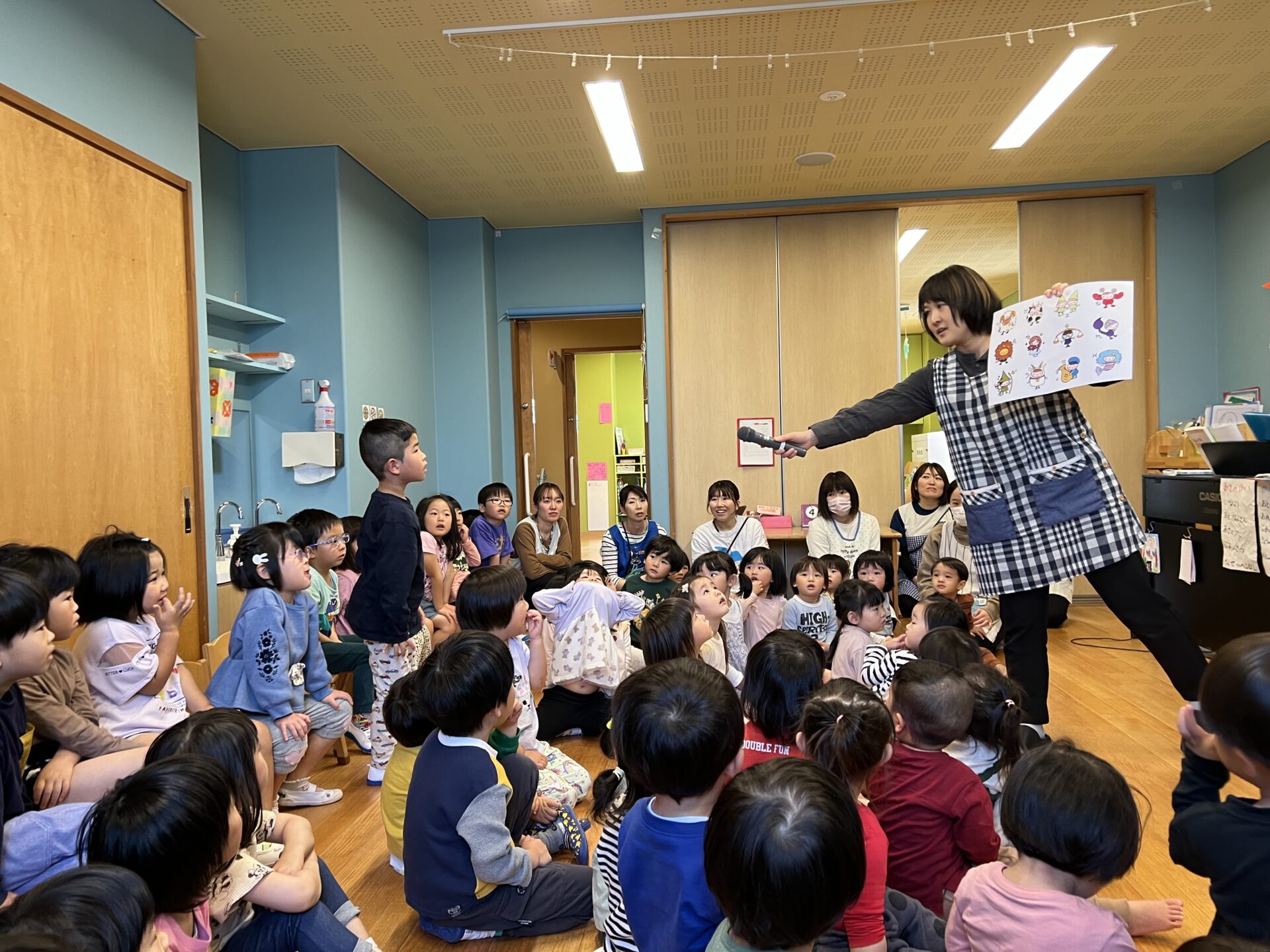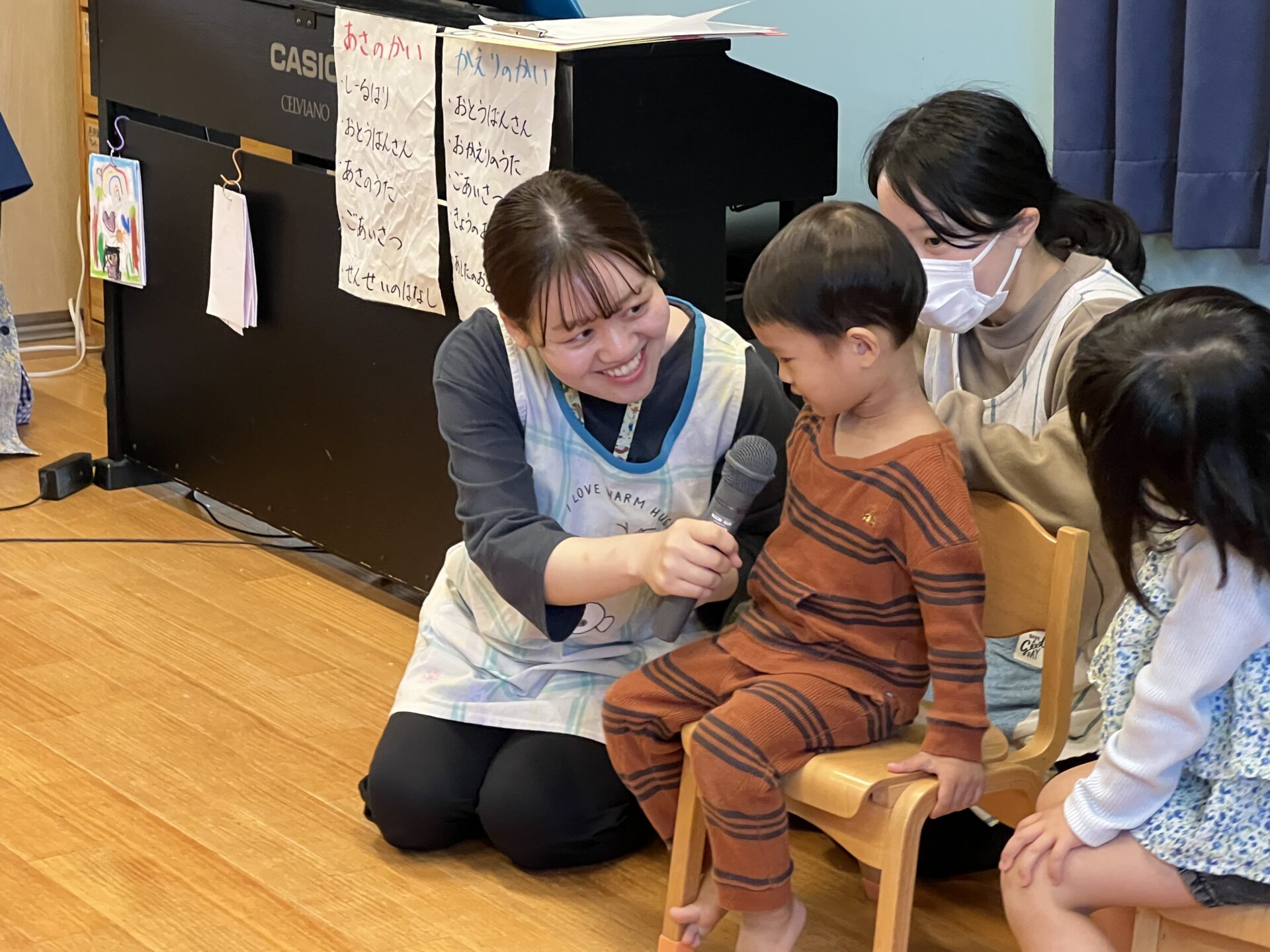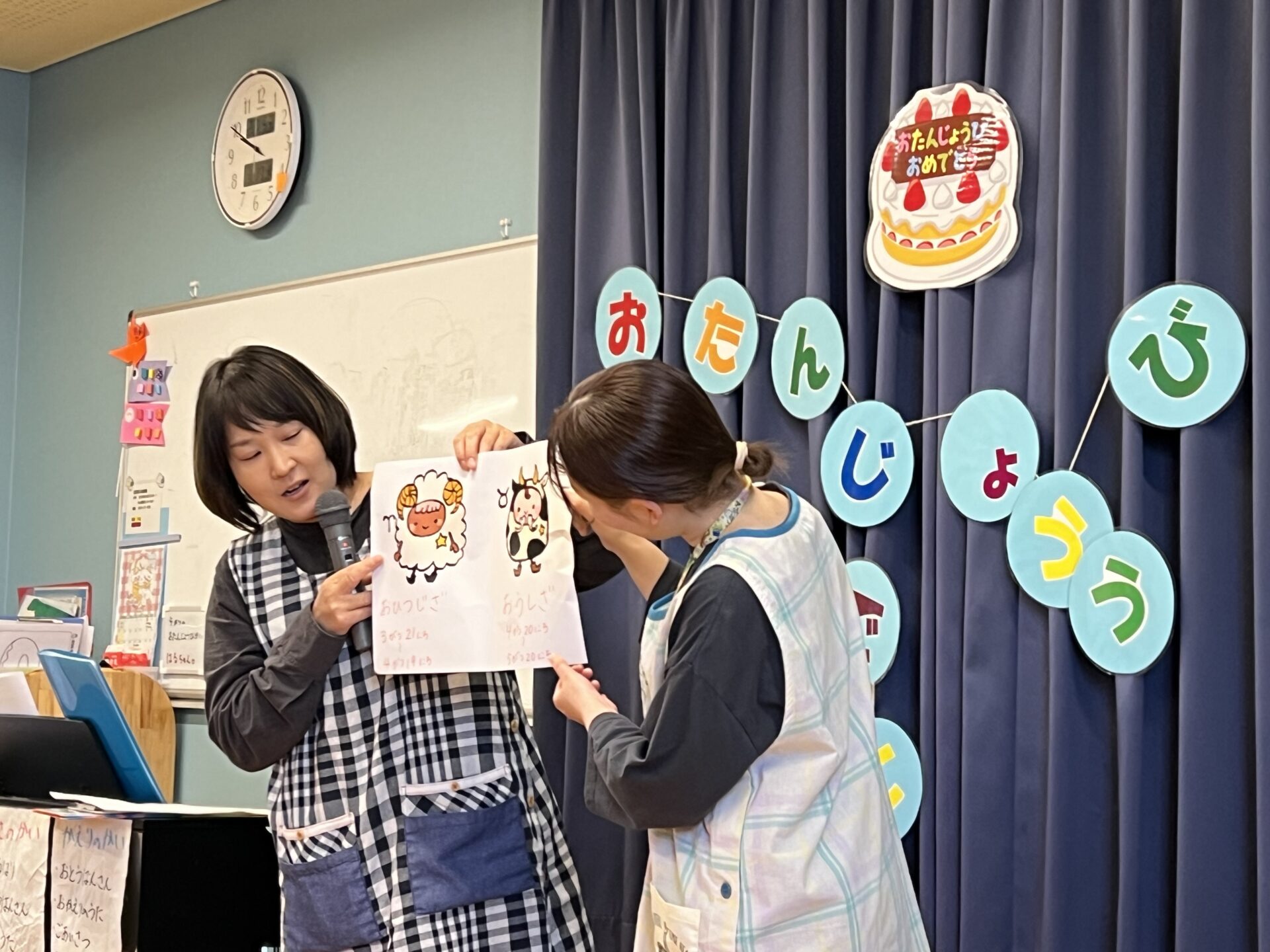 誕生会では、名前と年、好きな食べ物など、インタビューをしていきます。