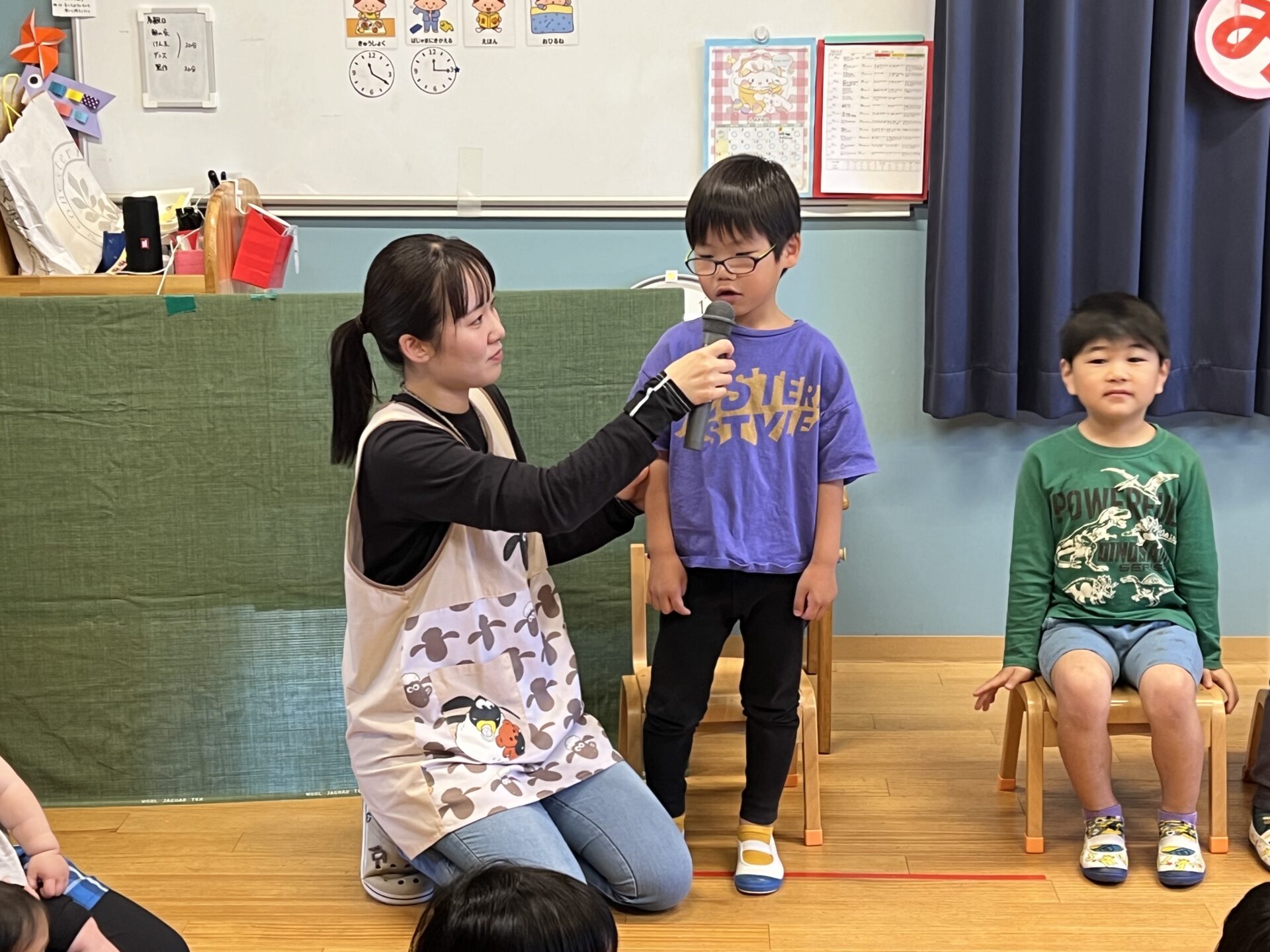 誕生会の恒例インタビューも、年長さんになると、しっかり答えられます。