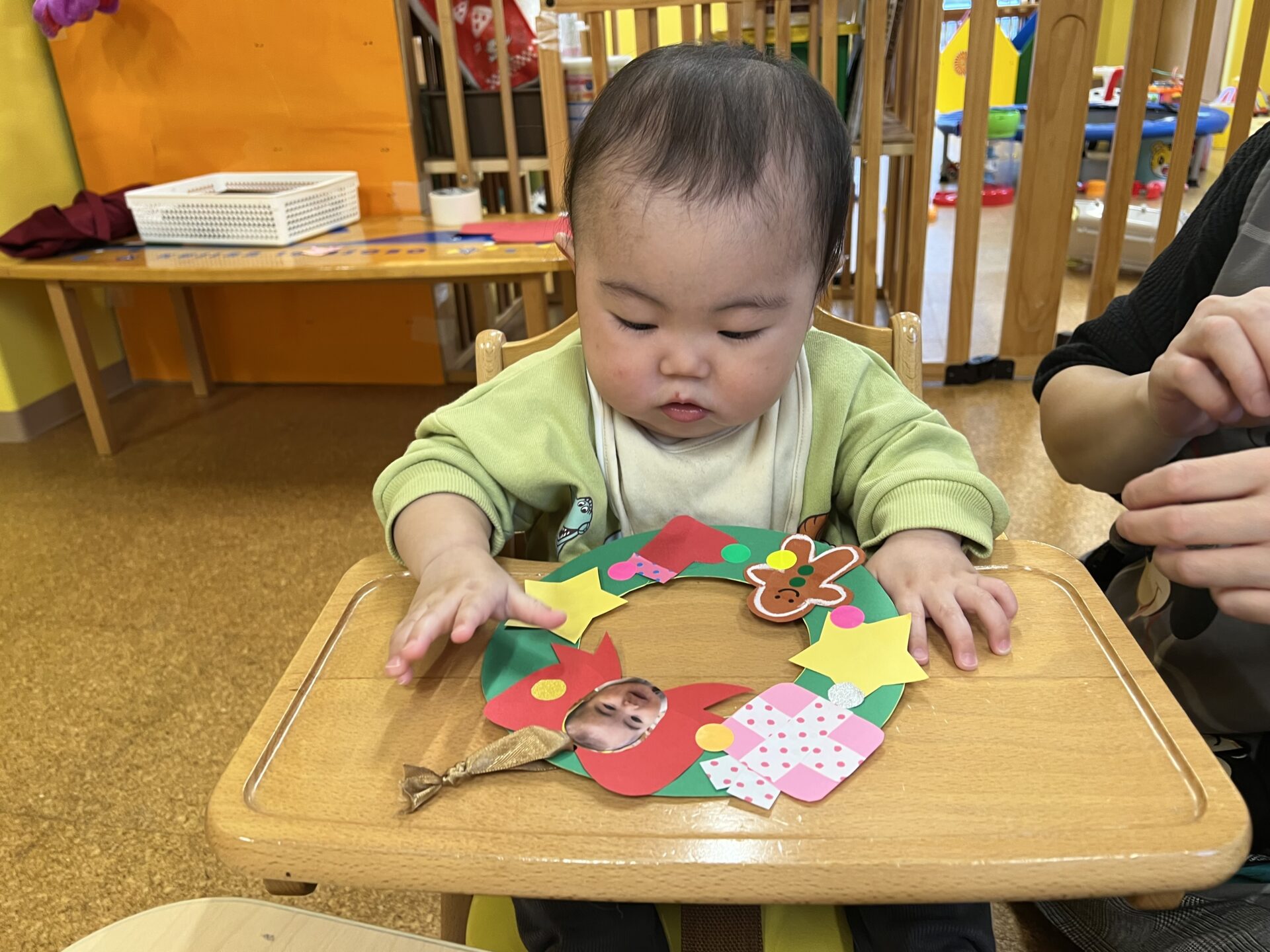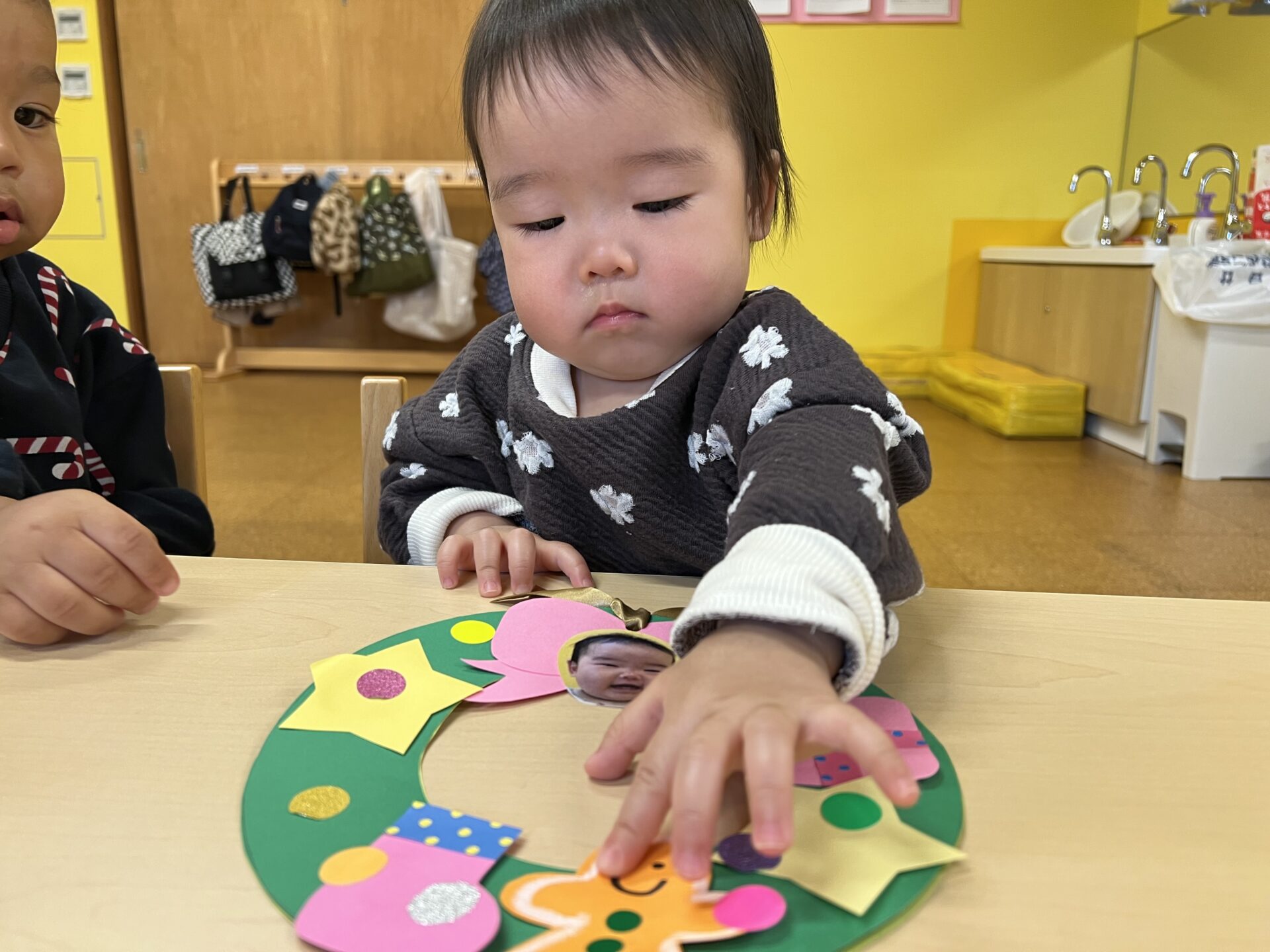 0歳児・うみチームのTくんとKくんは、保育士と一緒に、クリスマスリースづくりをしました😊