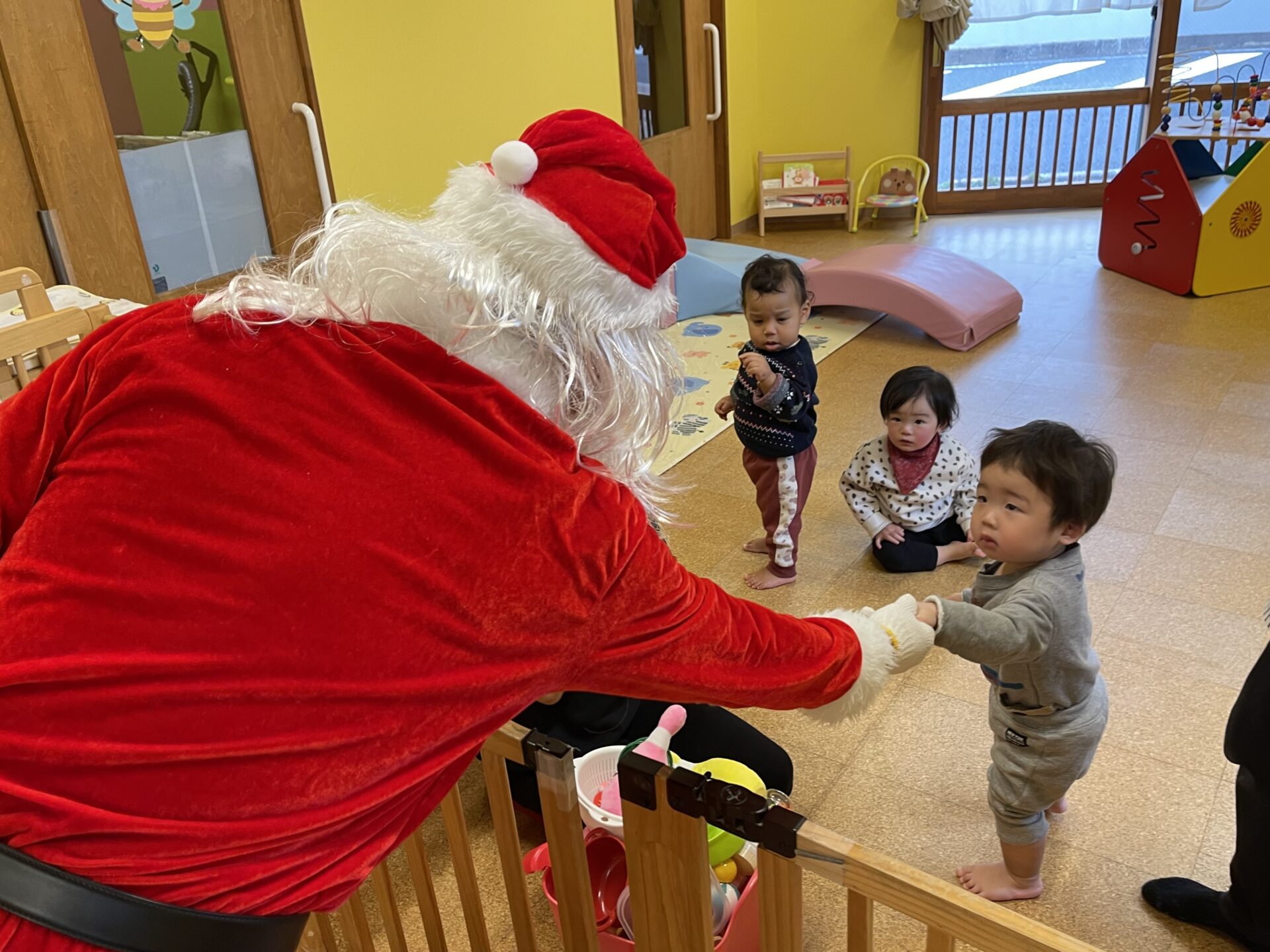 今年の0歳児・うみチームさんは、少し緊張していましたが、泣いたりする子がほとんどいなかったので、特別にサンタさんと握手してもらったり、頭を撫でてもらいました😊