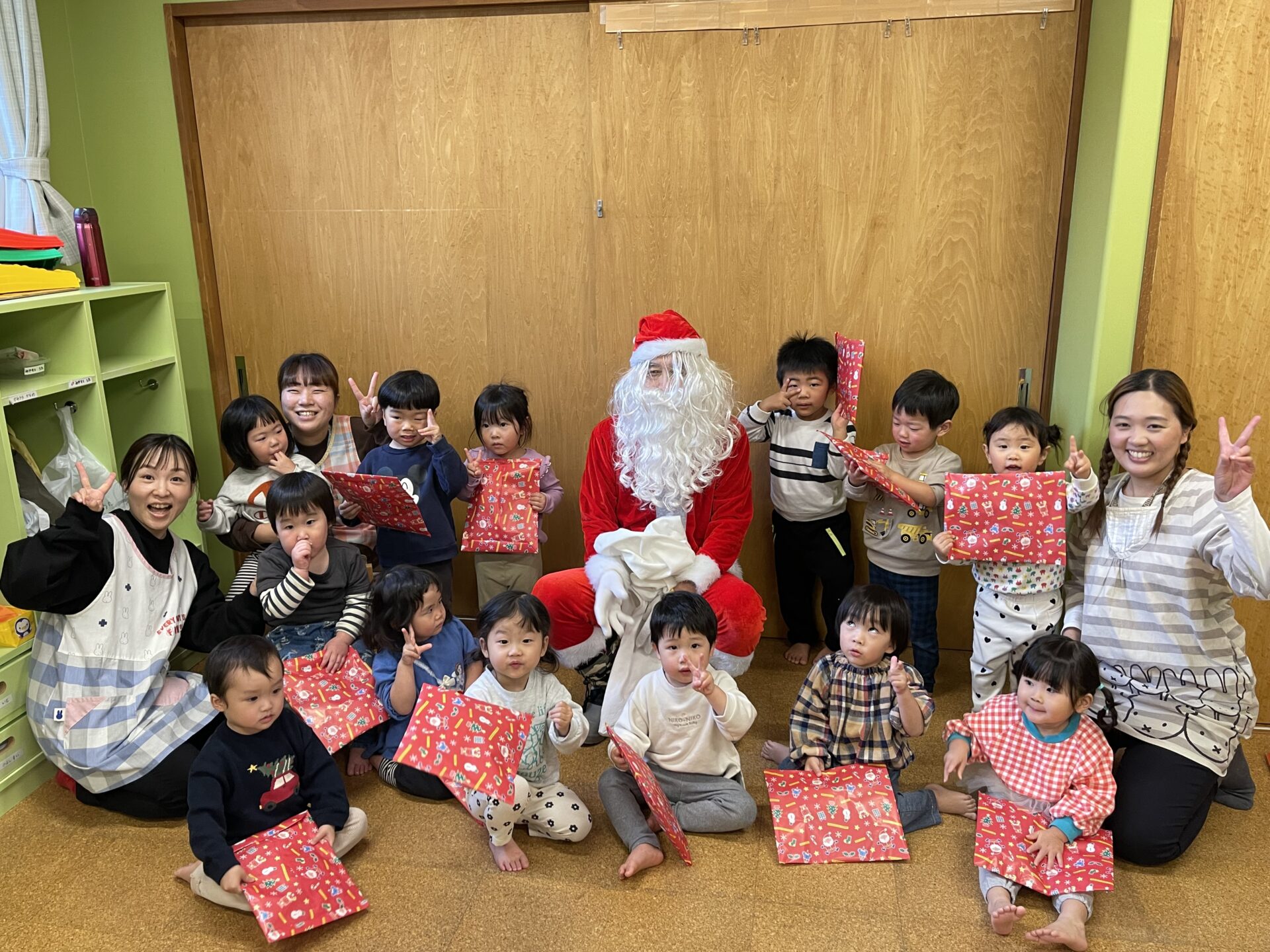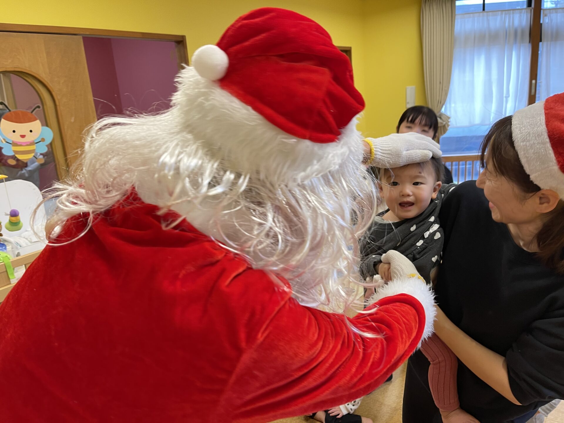 実は、乳児さんは毎年、怖くて大泣き💦の子も多いため、今年は0歳児と1歳児クラスには、【可愛い園長先生サンタ🎅】がプレゼントを届けにいきました😊