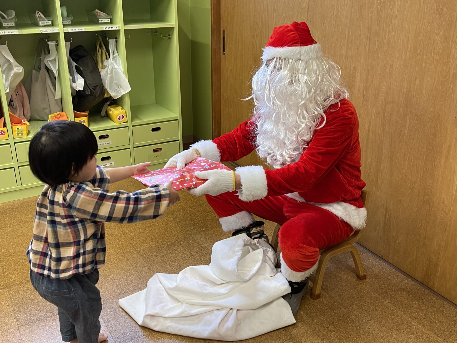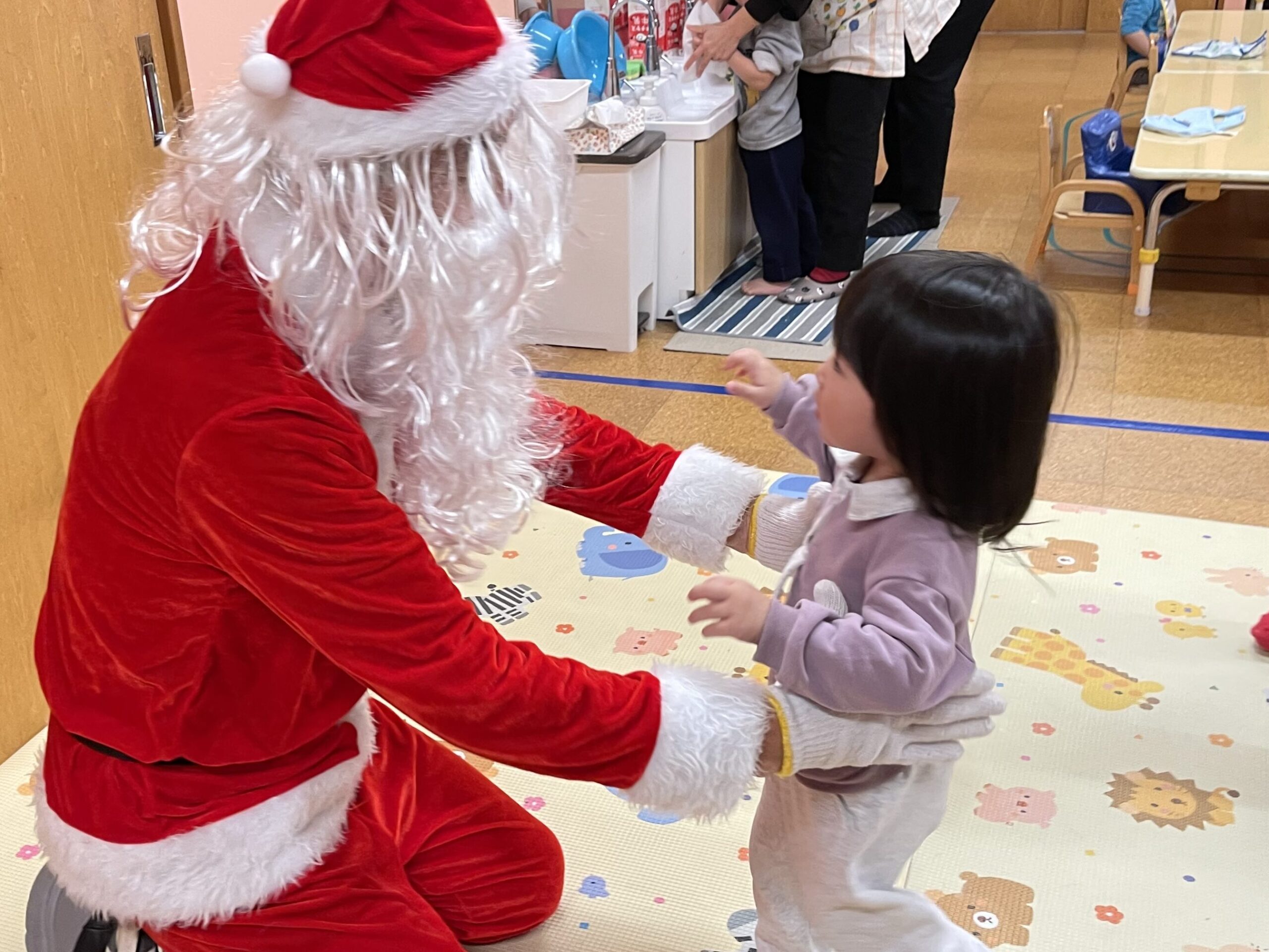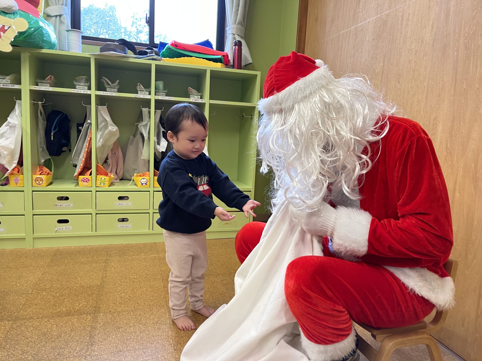 2歳児・あめチームさんは、先日からクラスにサンタクロースの帽子やおひげが落ちていたこともあり、『良い子にしているか、見に来たんじゃない?』と盛り上がっていたので、ぜひ会いに来て欲しい!!とのことでした😊Sくんは、サンタさんが登場すると、『プレゼント🎁下さい!』と積極的にアピールしていました。