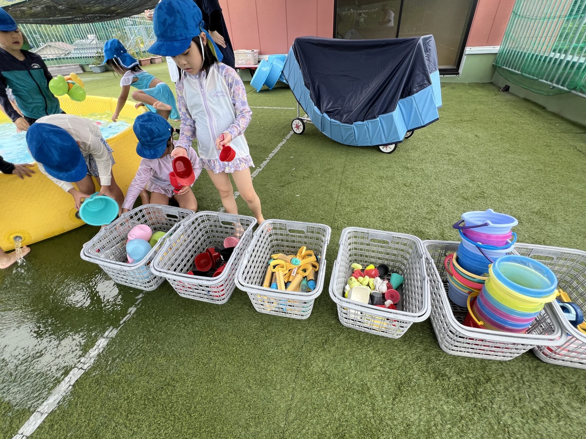 今日1日みんなで使った『水遊びのおもちゃ』をきれいに仕分けしてお片付けです😊