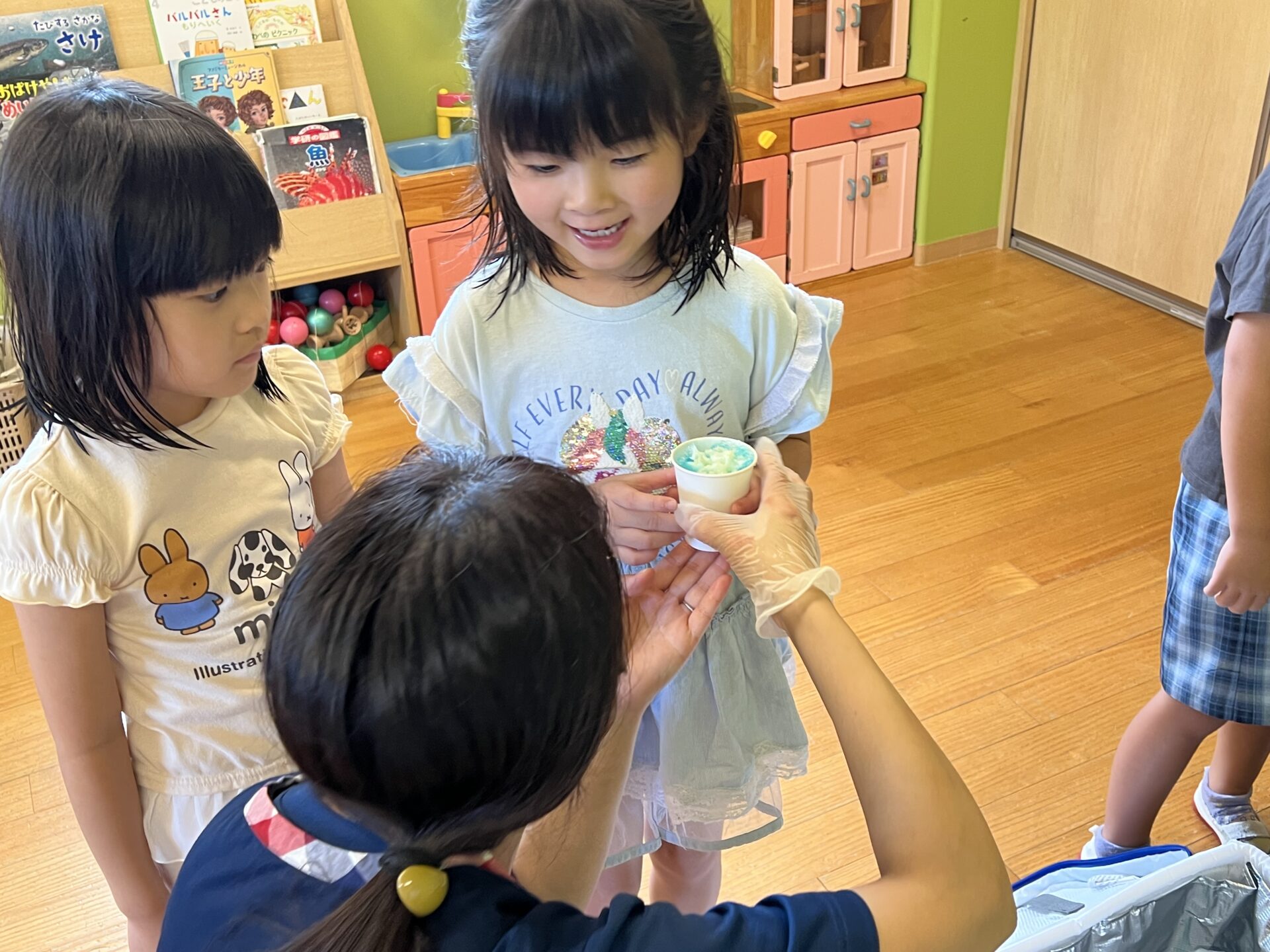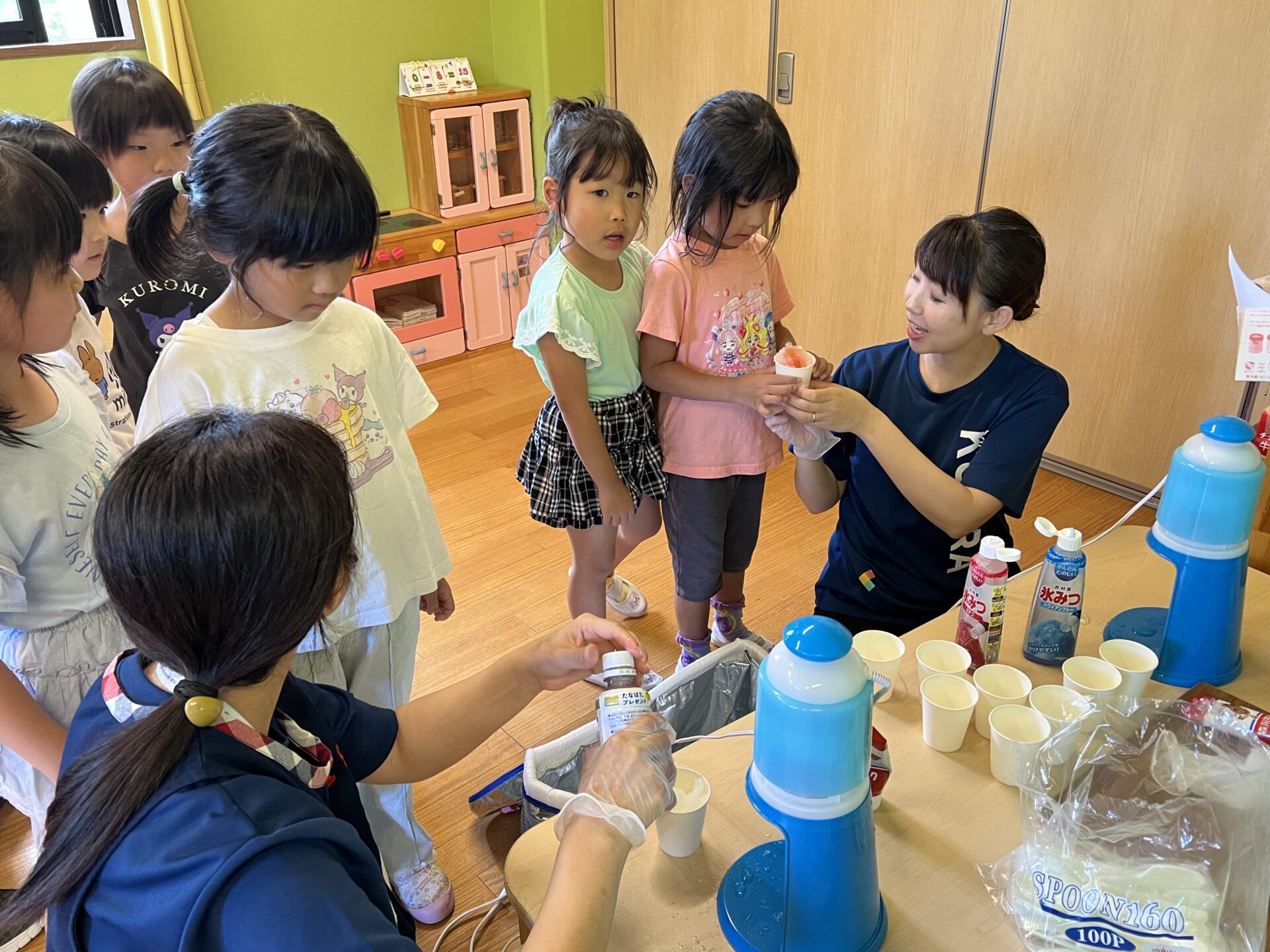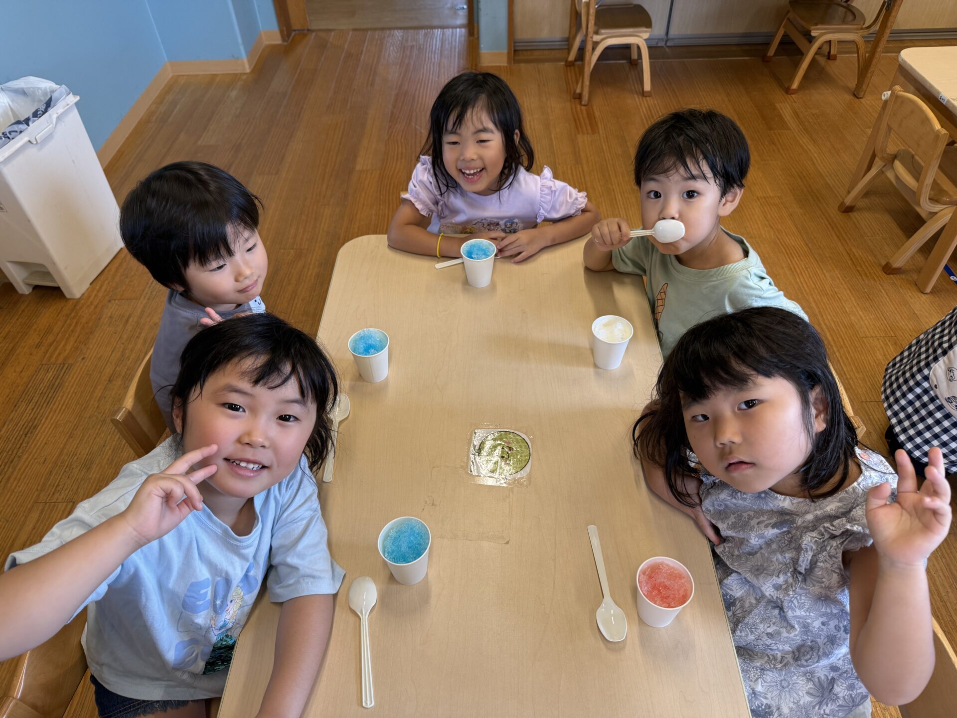 今日は、もう一つ楽しみにしていた『かき氷パーティ🍧』プール遊びを楽しんだ後、みんなで冷たくて美味しいかき氷🍧を食べようと、「くじら🐳かき氷屋さん」がオープン😊