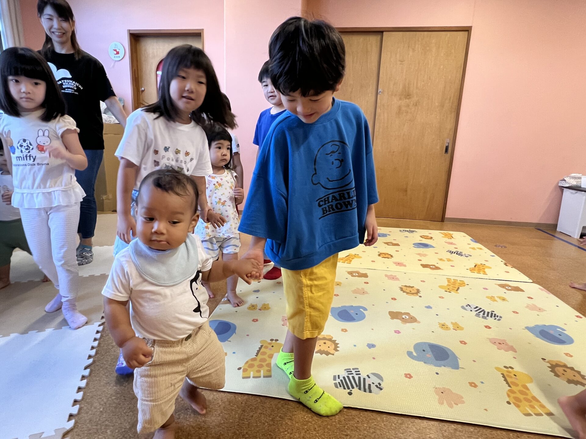 そのあと、【さんぽ】の曲に合わせて、くじらチームさんと手を繋いで歩きます😊くじらチームのYちゃんが、こんなに優しい顔でサポートする姿に感動です✨