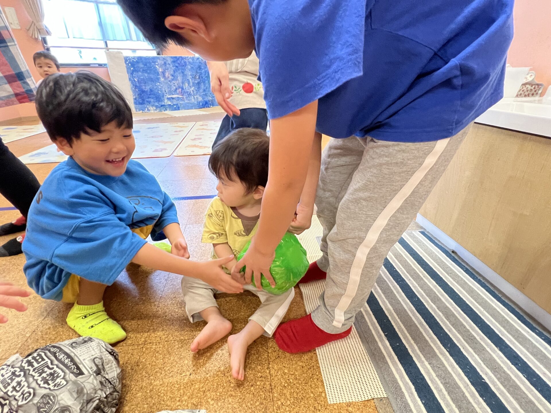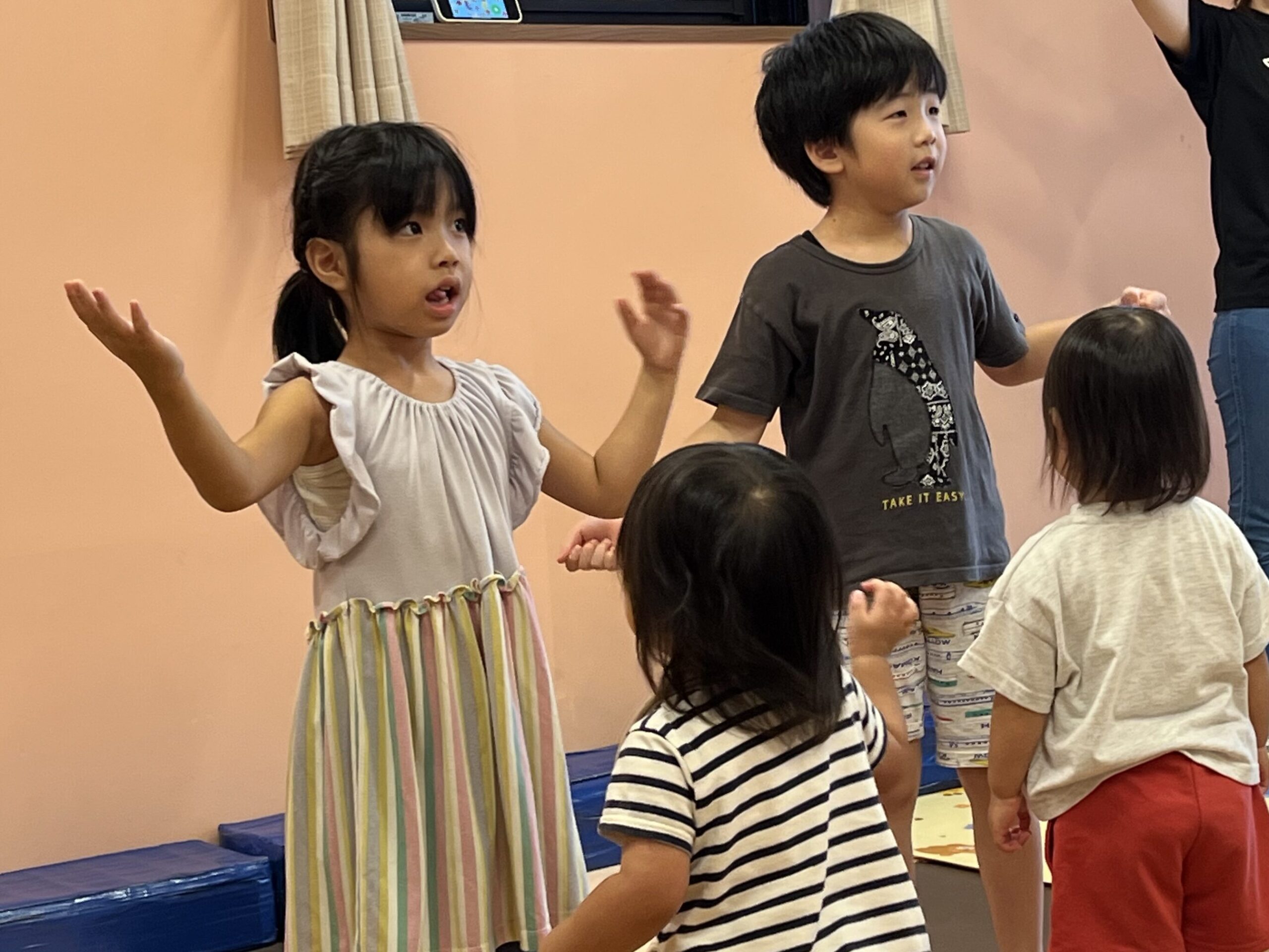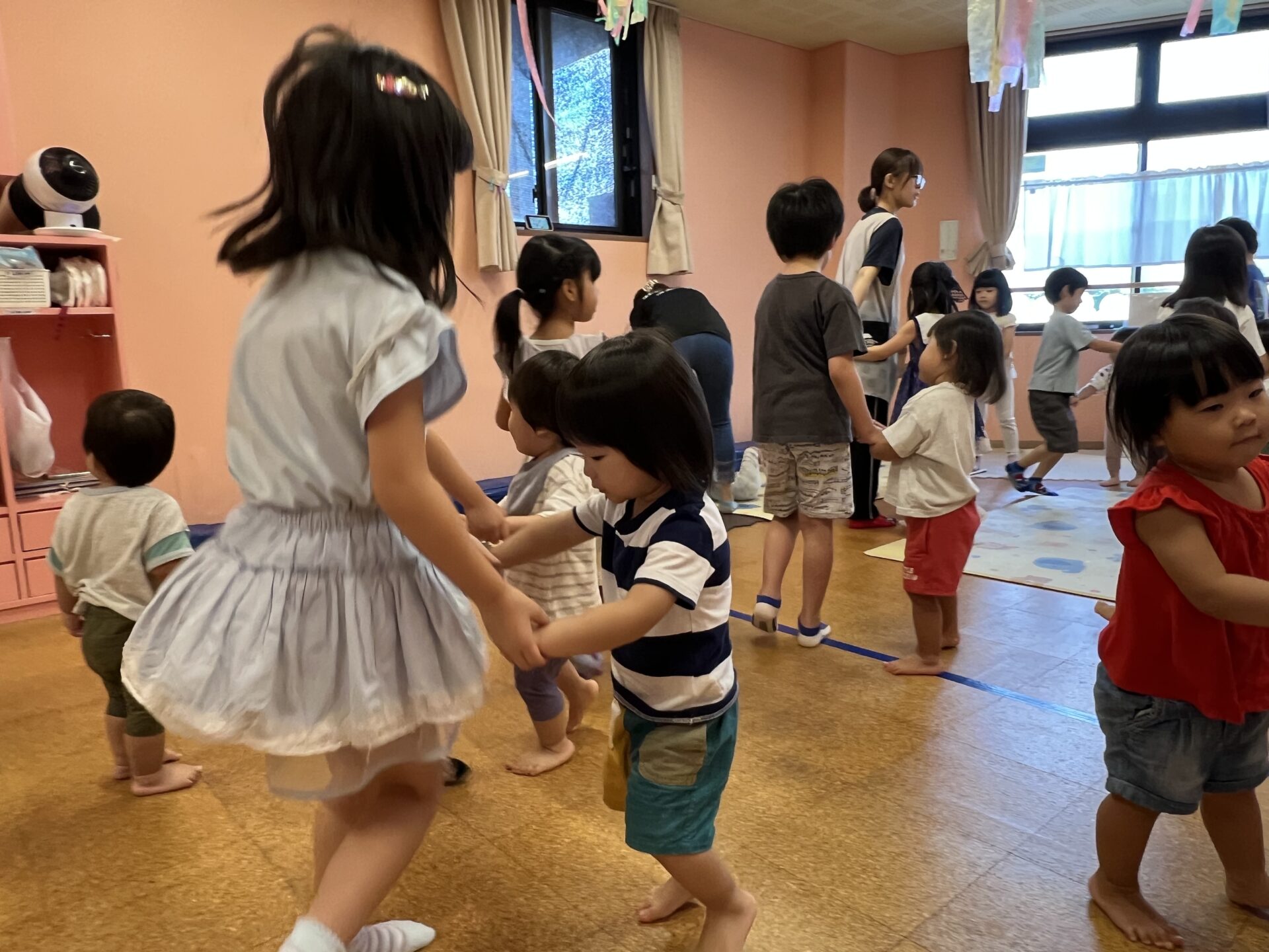 今日は、0歳児・うみチーム、1歳児・だいちチーム、5歳児・くじらチーム合同で、異年齢の交流を深めながら、一緒にダンスをして遊びました😊