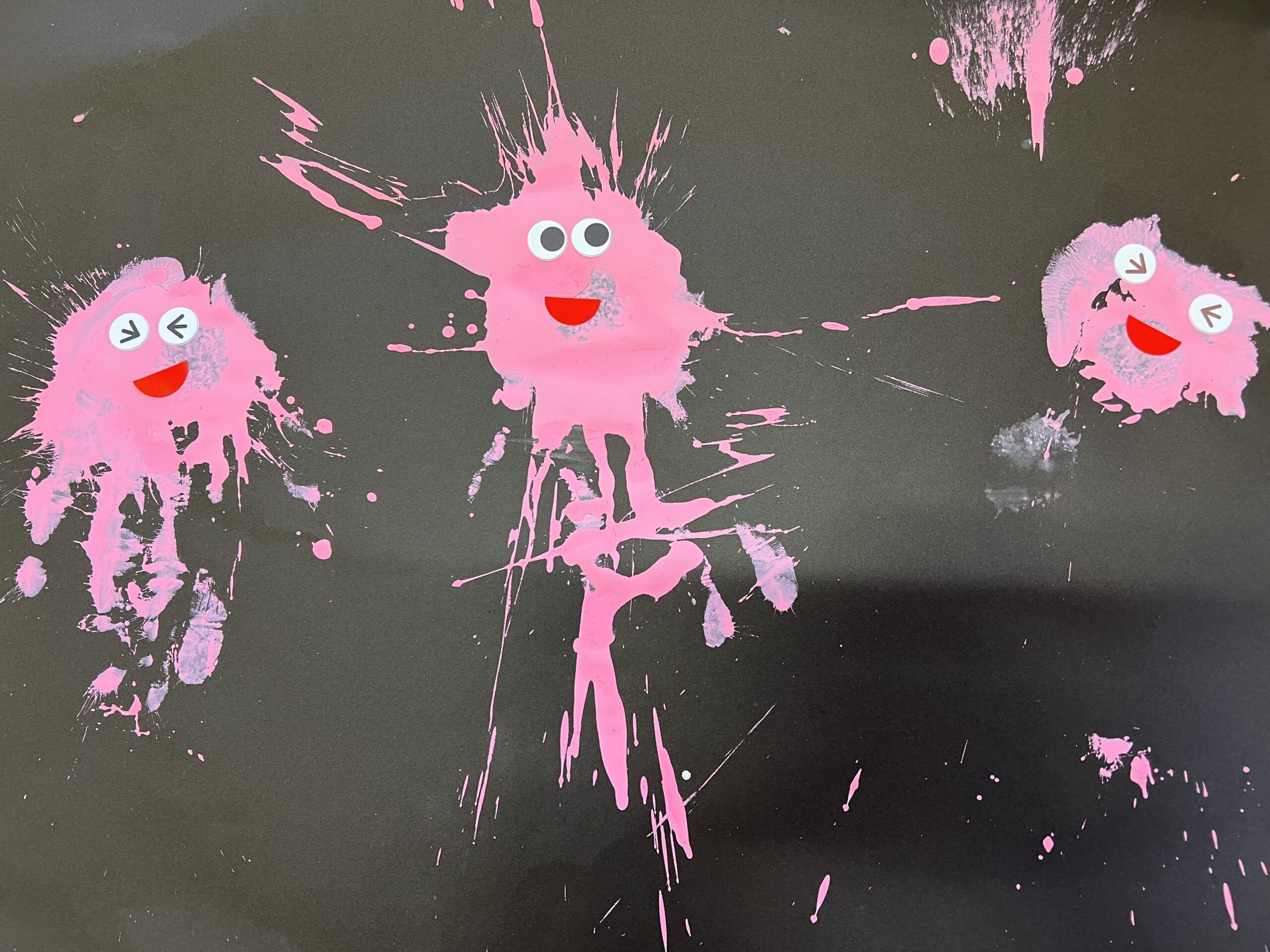黒い画用紙に100均などで売っている毛糸の玉(ポンポン)を手のひらで『えい!!』っと押しつけると、こんなにおもしろい形になりました😊