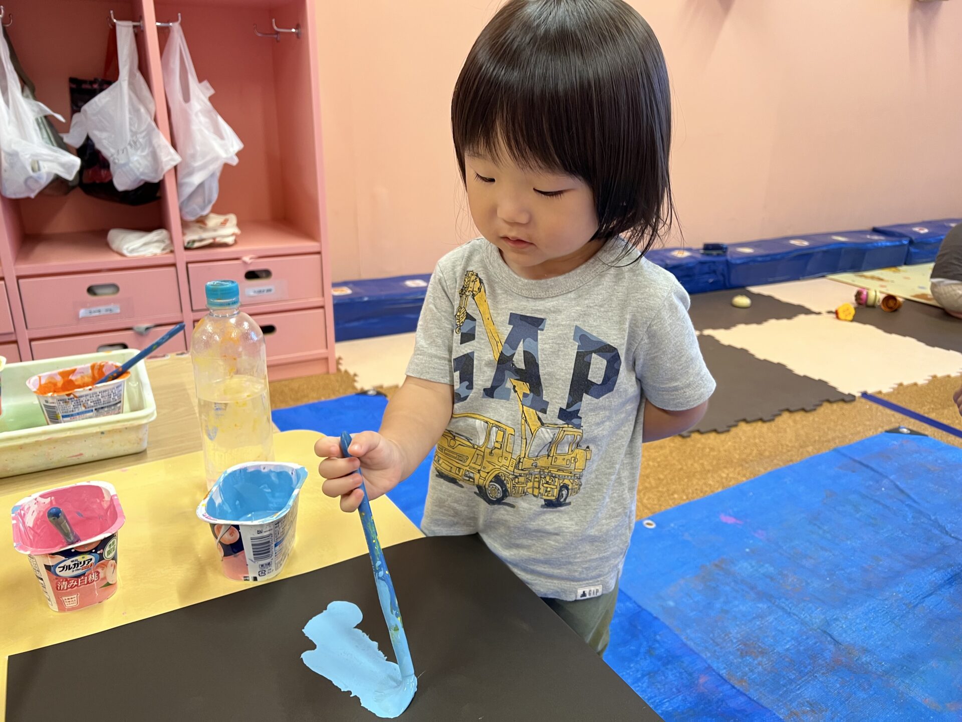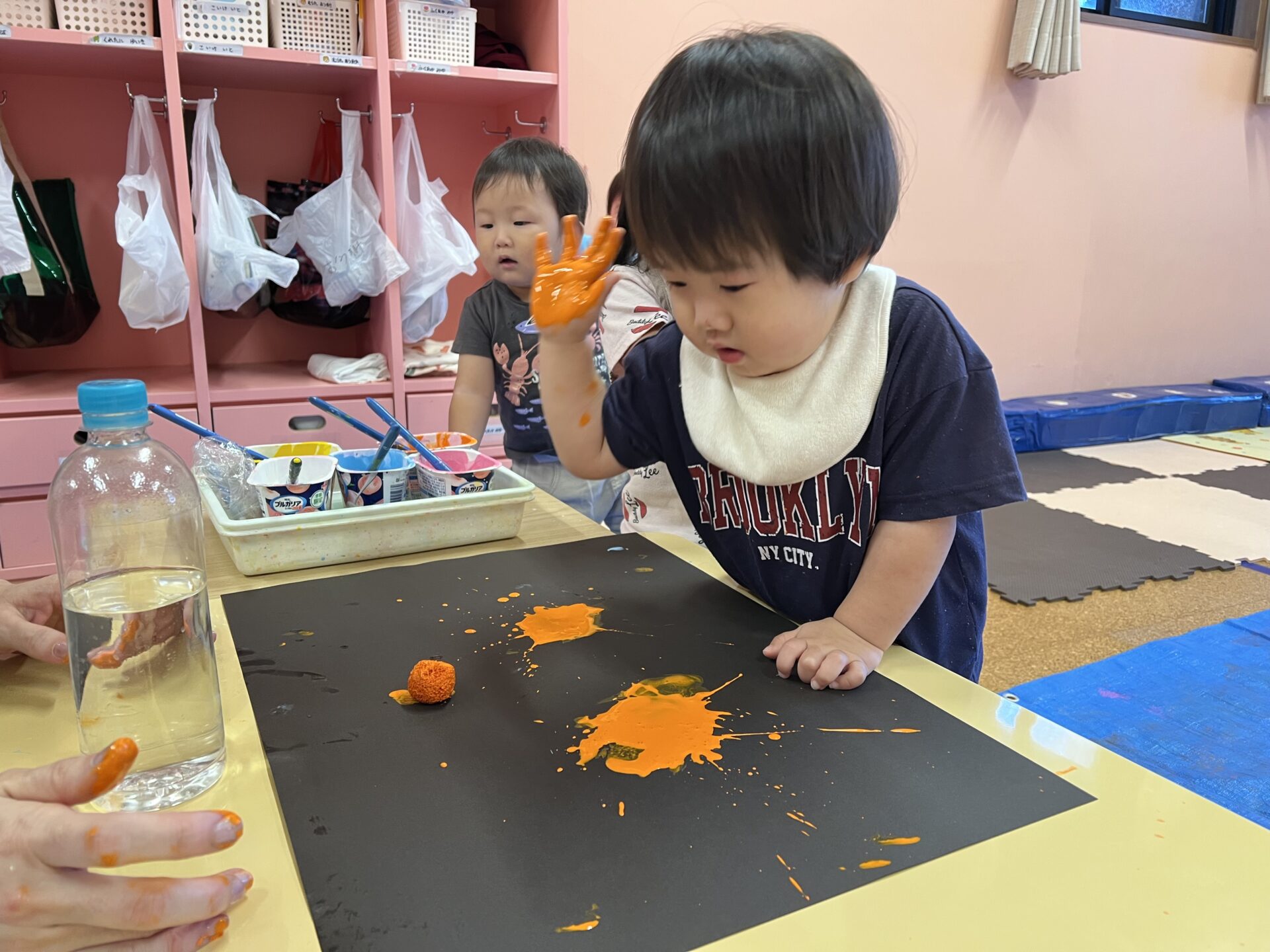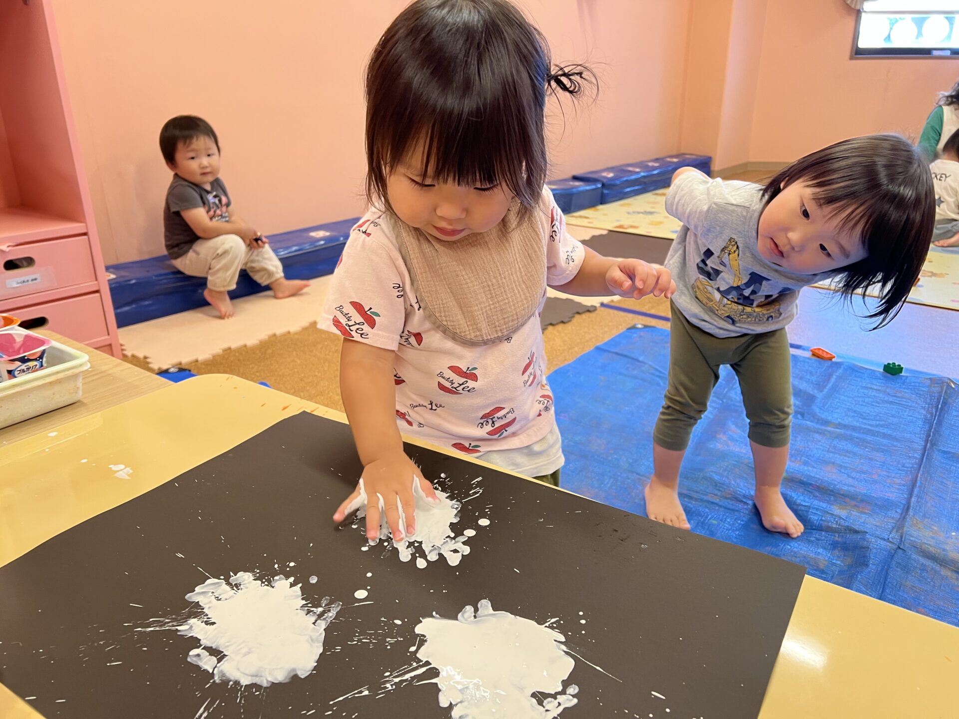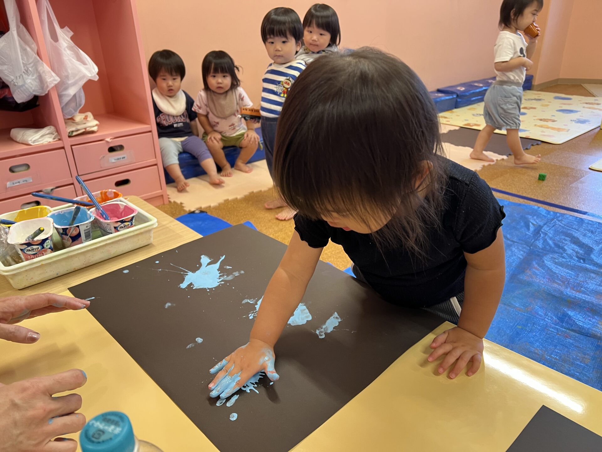 とっても力強く「えい!!」と保育士が言うので、Yちゃんも「えい!!」と言いながら、絵の具あそびを楽しんでいて可愛かったです😄みんなが楽しんでいる後ろで、ずっと見学していたIくん。何度か誘ってみたんですが、やってみたいけど…手が汚れるのが苦手なようです💦