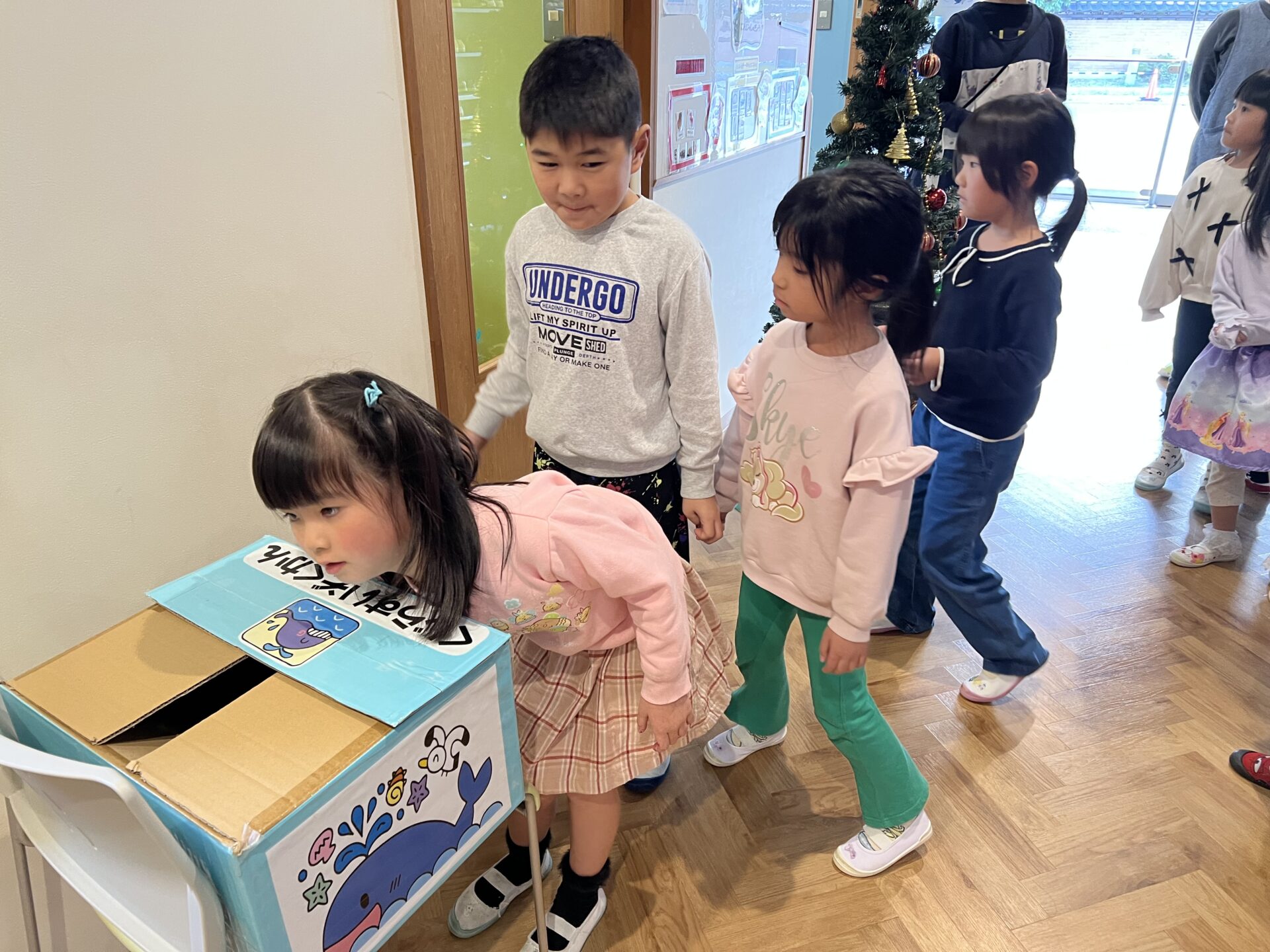 今年は、くじ引き方式でクリスマスツリーの飾りつけを選んでもらい、順番に飾りつけをしてもらいました😊※くじ引きの箱は、以前くじらすいぞくかんで使用した物です😁色々な所で大活躍中✨