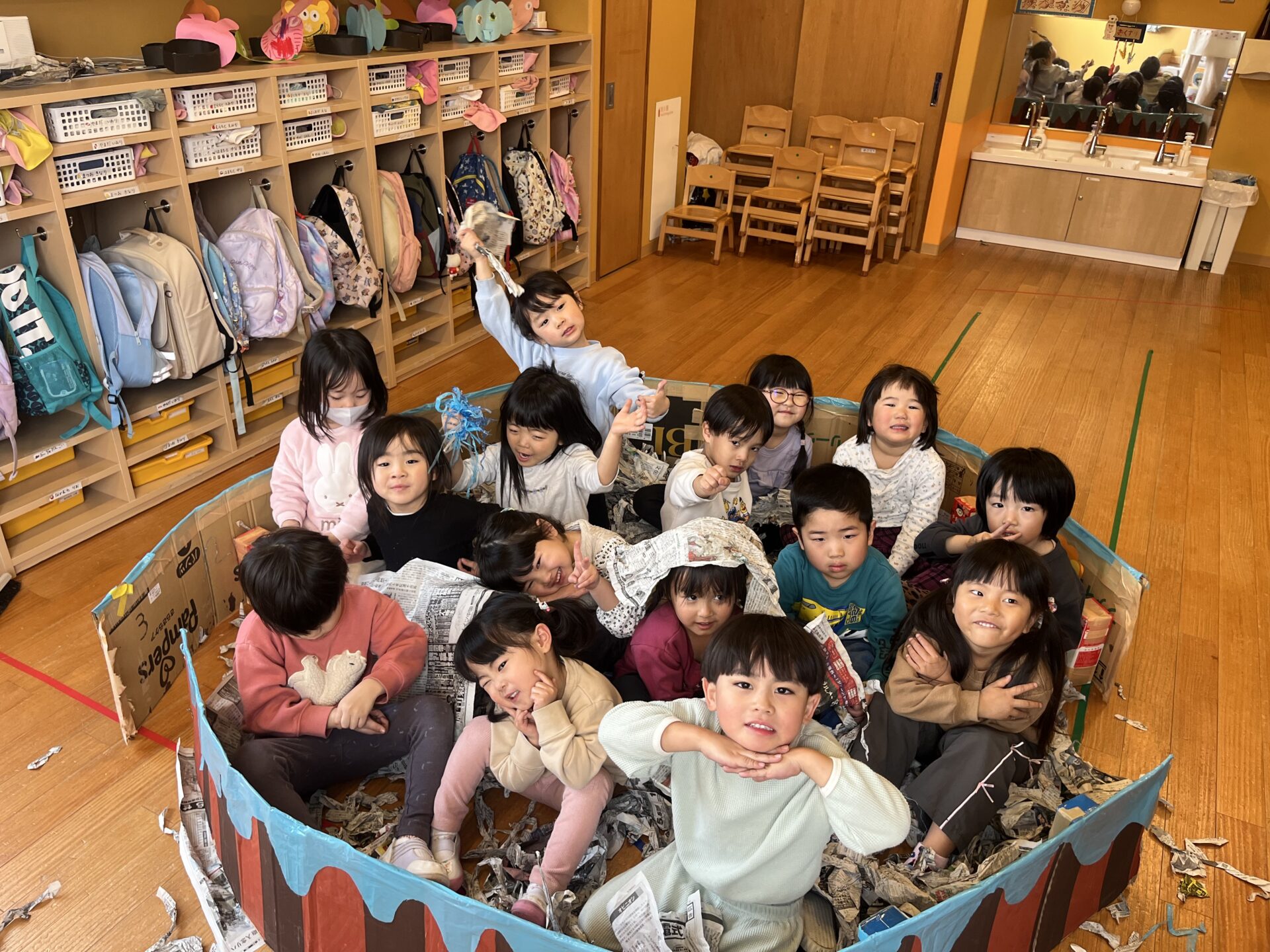 発表会後の月曜日には、新聞紙遊びをしました!劇で使ったお風呂を持ってくると、大喜びで新聞紙をお風呂に入れて、ふかふかのお風呂にみんなで入りました♪