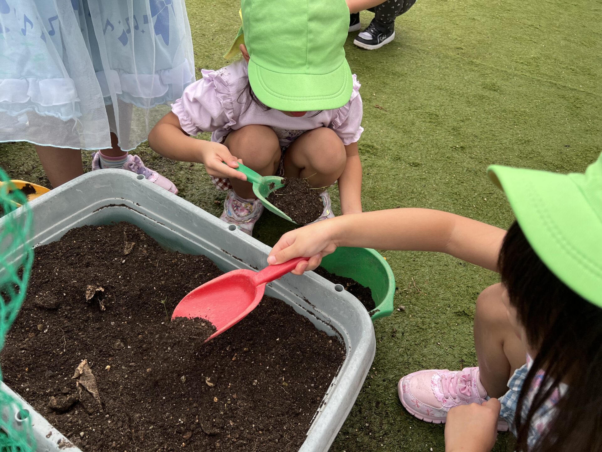 すると、、、プランターの中から、みんなの大好きな幼虫がたくさん出てきました🐛