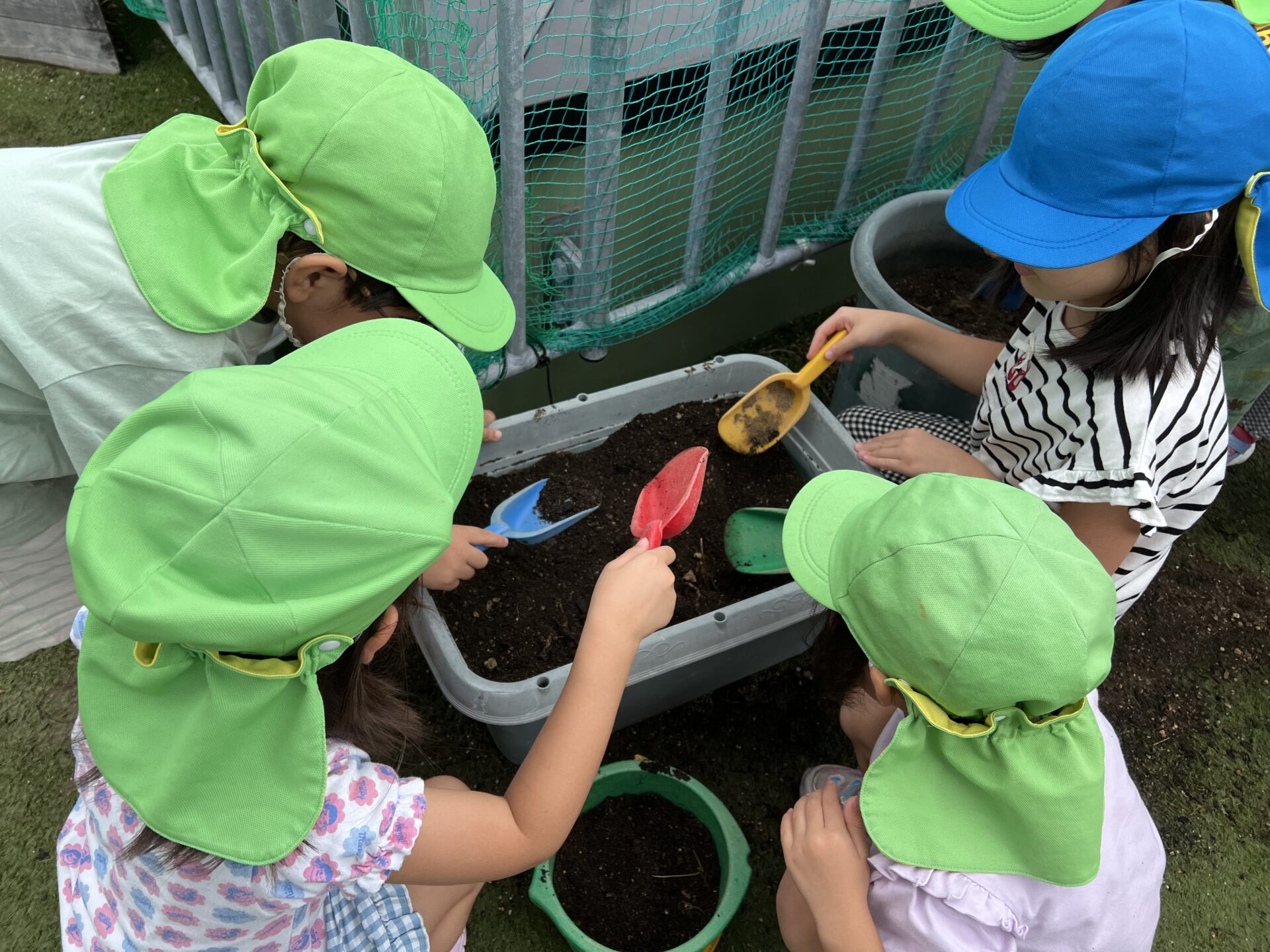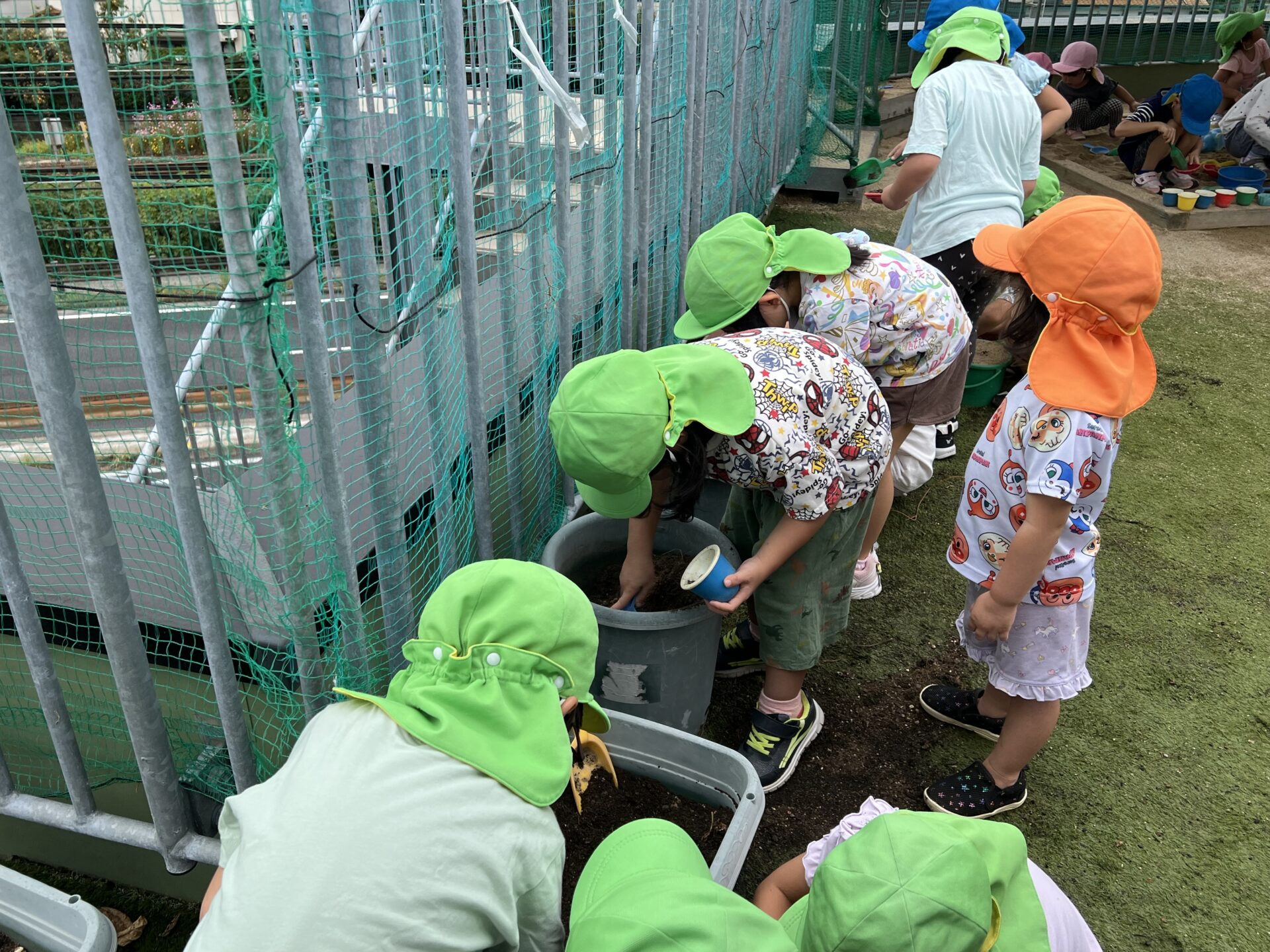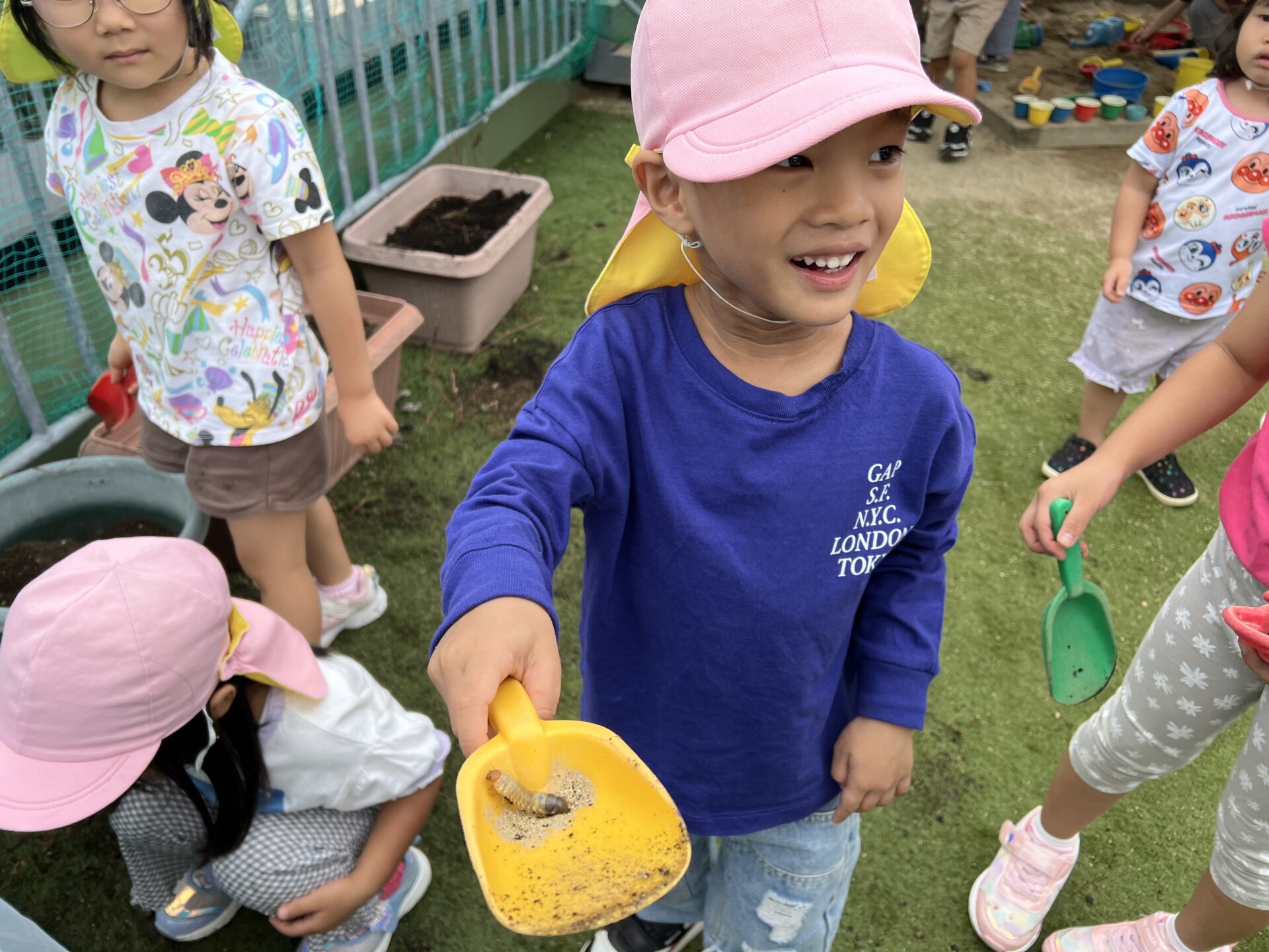 そこから、プランターの土の中の大捜索✨が始まりました😊今年は、サツマイモ🍠も大豊作で、芋ほりを楽しんだばかり。その時も、畑に幼虫🐛を見つけ、4歳児・そらチームさんは、お芋より幼虫に夢中だったそうです。