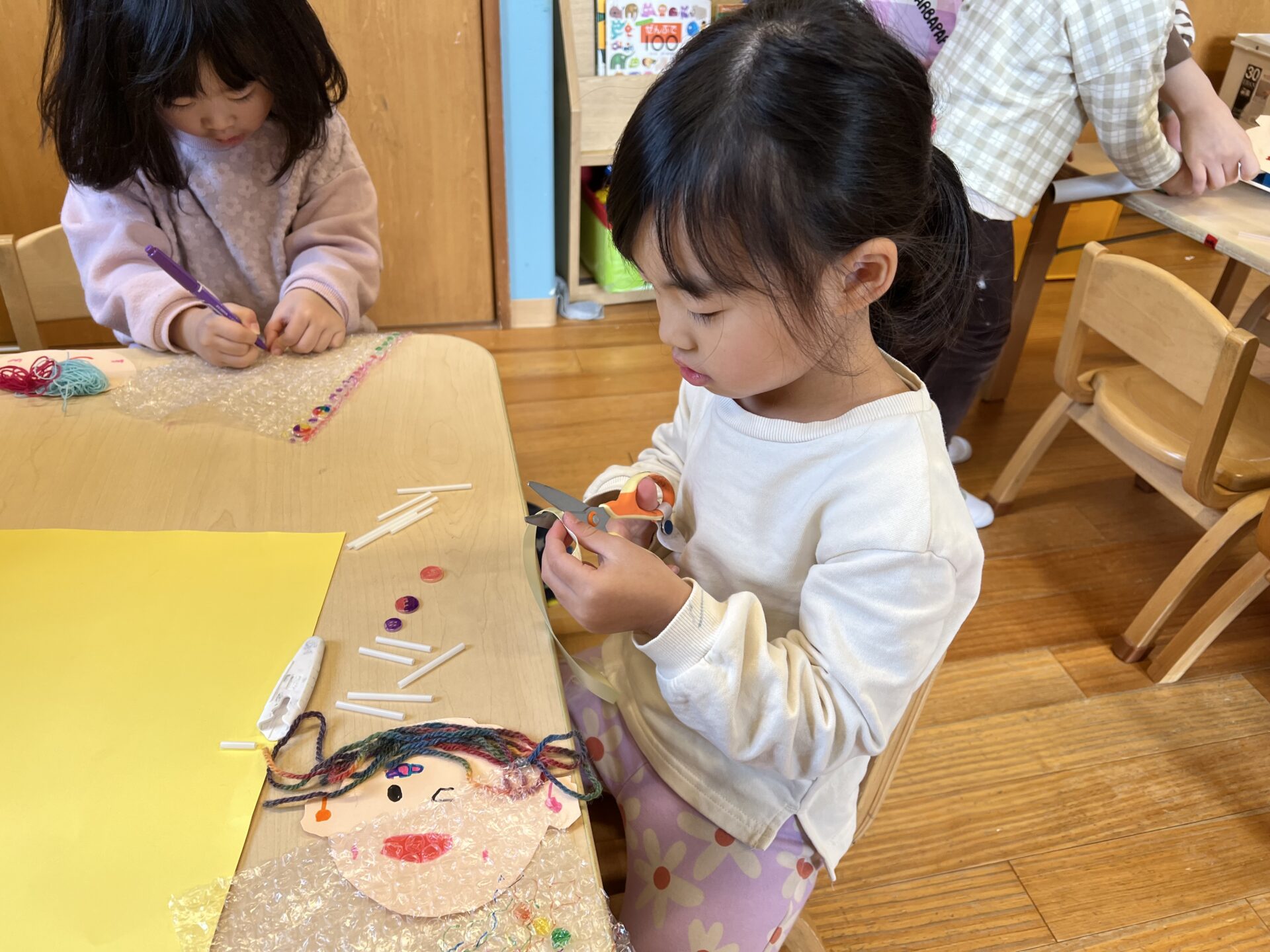 昨日は”じぶんのかお”を自由に作ったそうです😊一人ひとり工夫しながら作っていました。材料も好きなものを使って自由に作って良いということで、個性豊かな作品ができあがっていました。