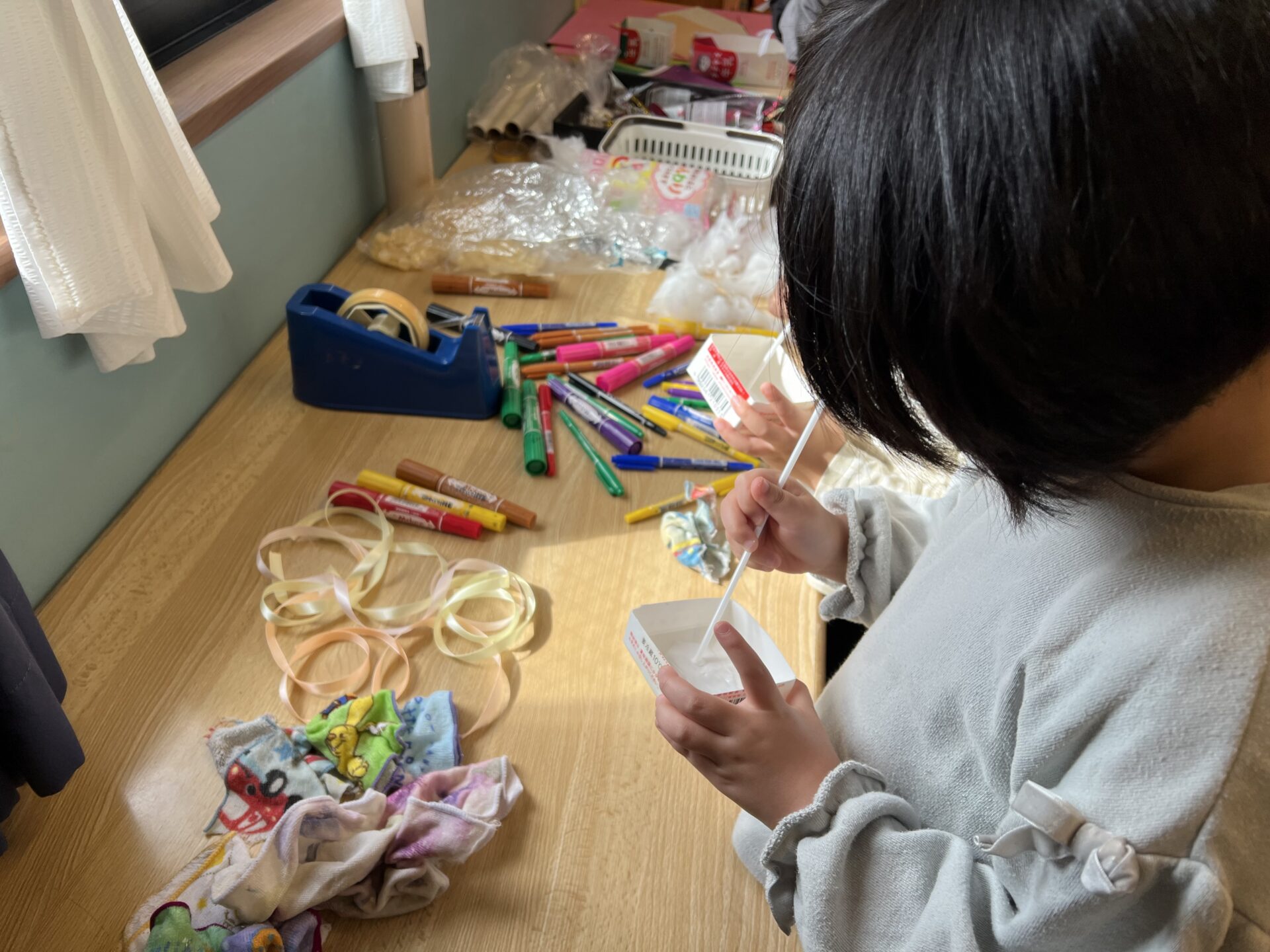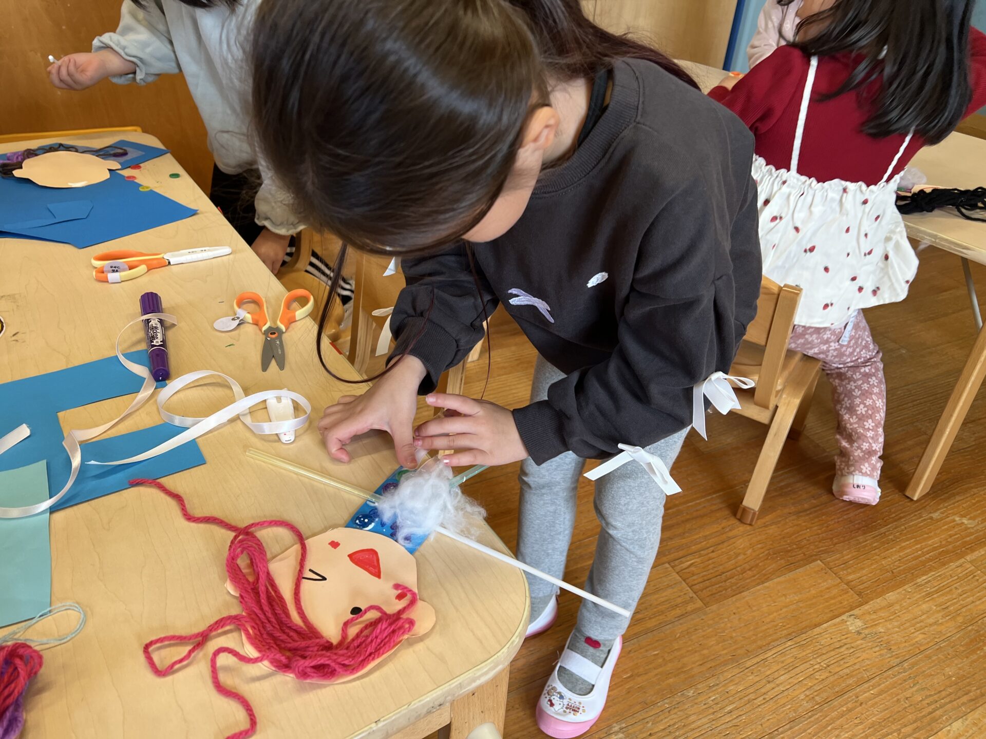 材料には、リボンや毛糸、ボタンにキラキラテープ、綿、マジックなどなど、魅力的なものがたくさん😊ボンドやセロテープもありました。担任のO先生は『どうやったらくっつくかな?』と自分で考えれるように、自由に使ってよい材料を準備していました。
