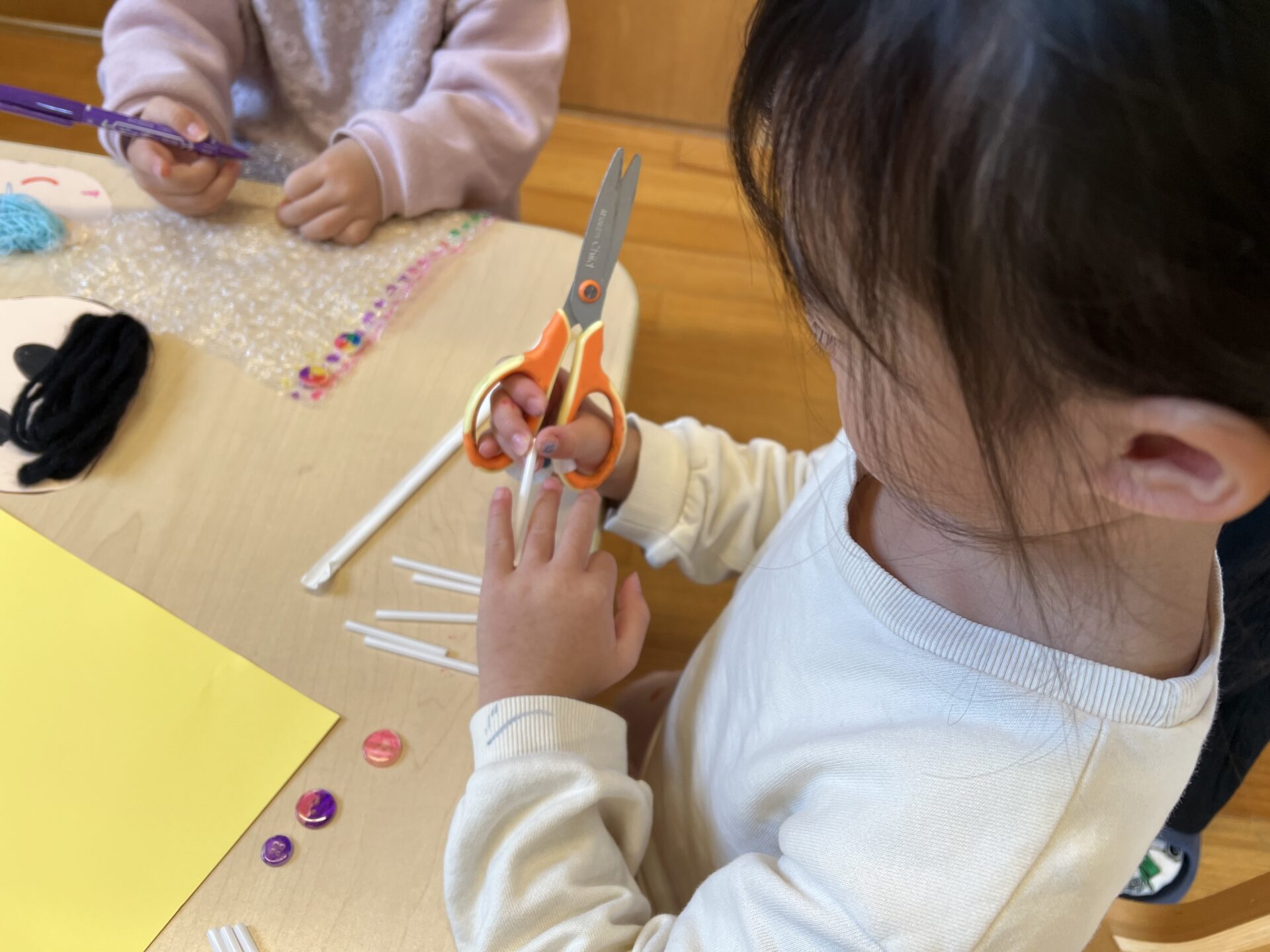 Kちゃんは、ひらめきました✨ちょっと危ないかな~💦と思いながら見ていると、Kちゃんは、ストローで指のサイズを一本一本丁寧に測っていました😊ナイスアイデアです!