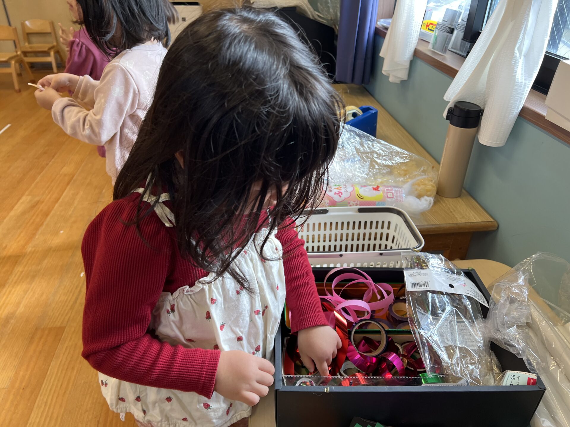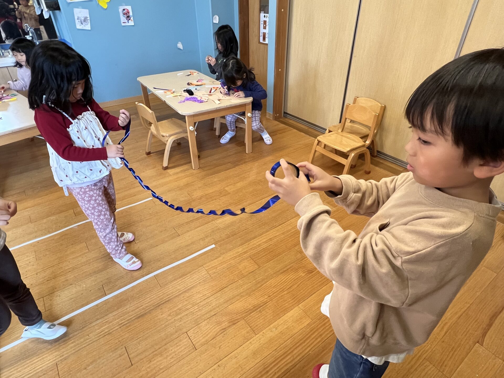 最後は、みんなで材料のお片付け。夢中になりすぎて、キラキラテープが大変なことになっていたので、きれいに巻き直していました😊