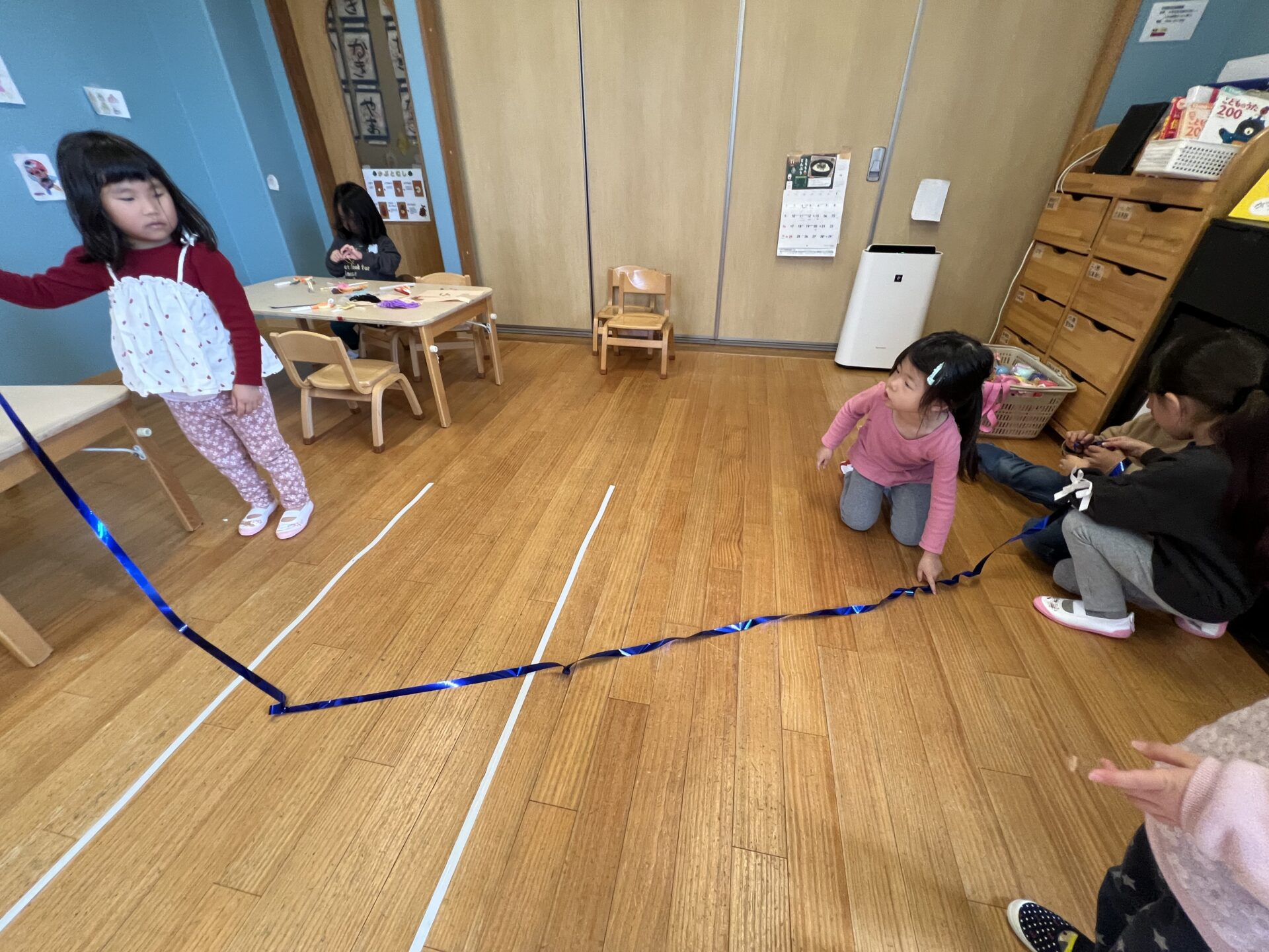 友だち同士で協力しながら「ちょっと、そっち持ってて!」「まっすぐのばして!」と一生懸命考えながら片付けていました😊