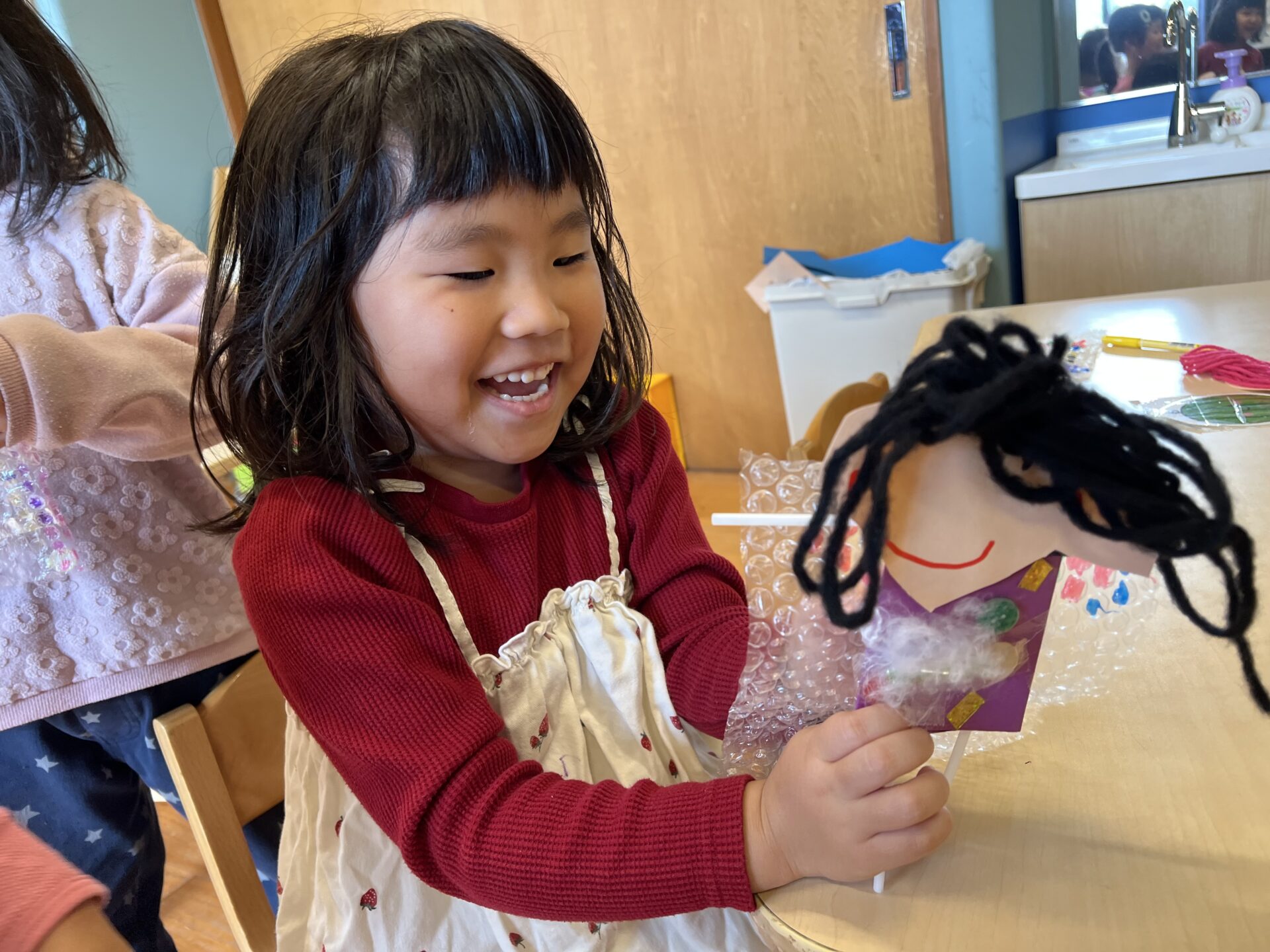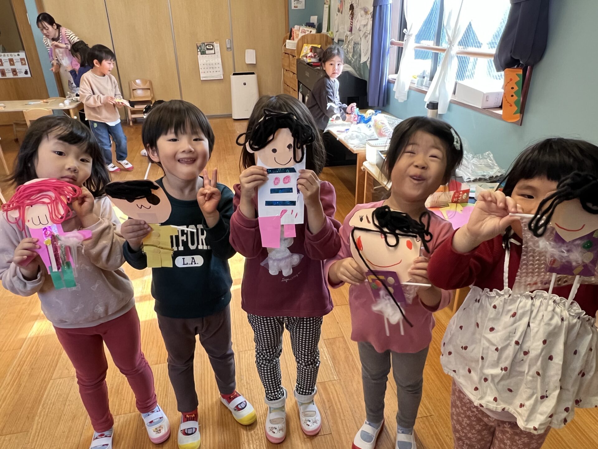 昨日は”じぶんのかお”を自由に作ったそうです😊一人ひとり工夫しながら作っていました。材料も好きなものを使って自由に作って良いということで、個性豊かな作品ができあがっていました。