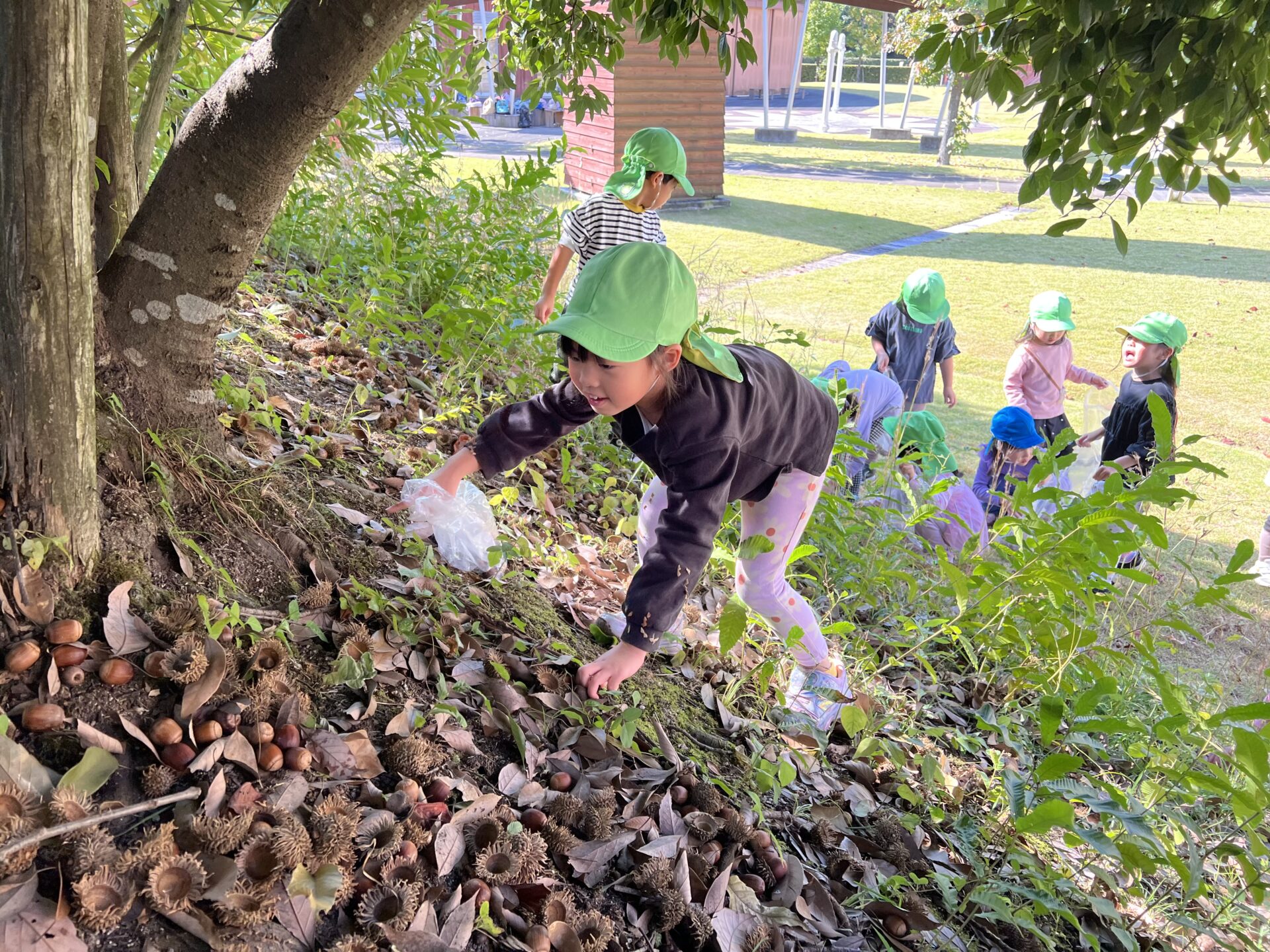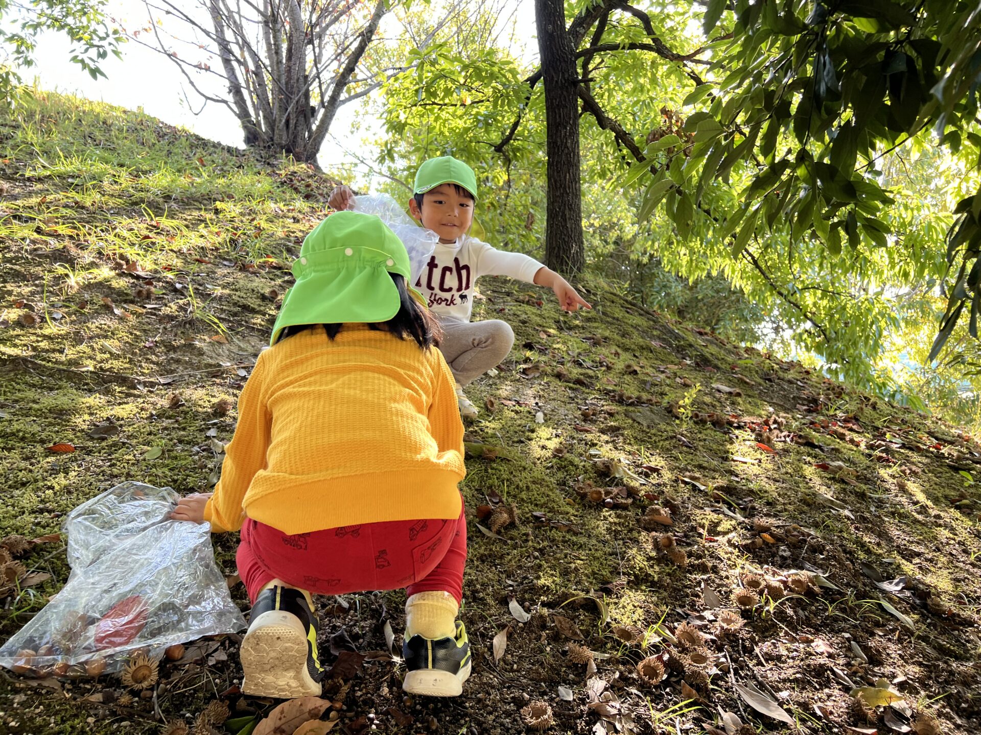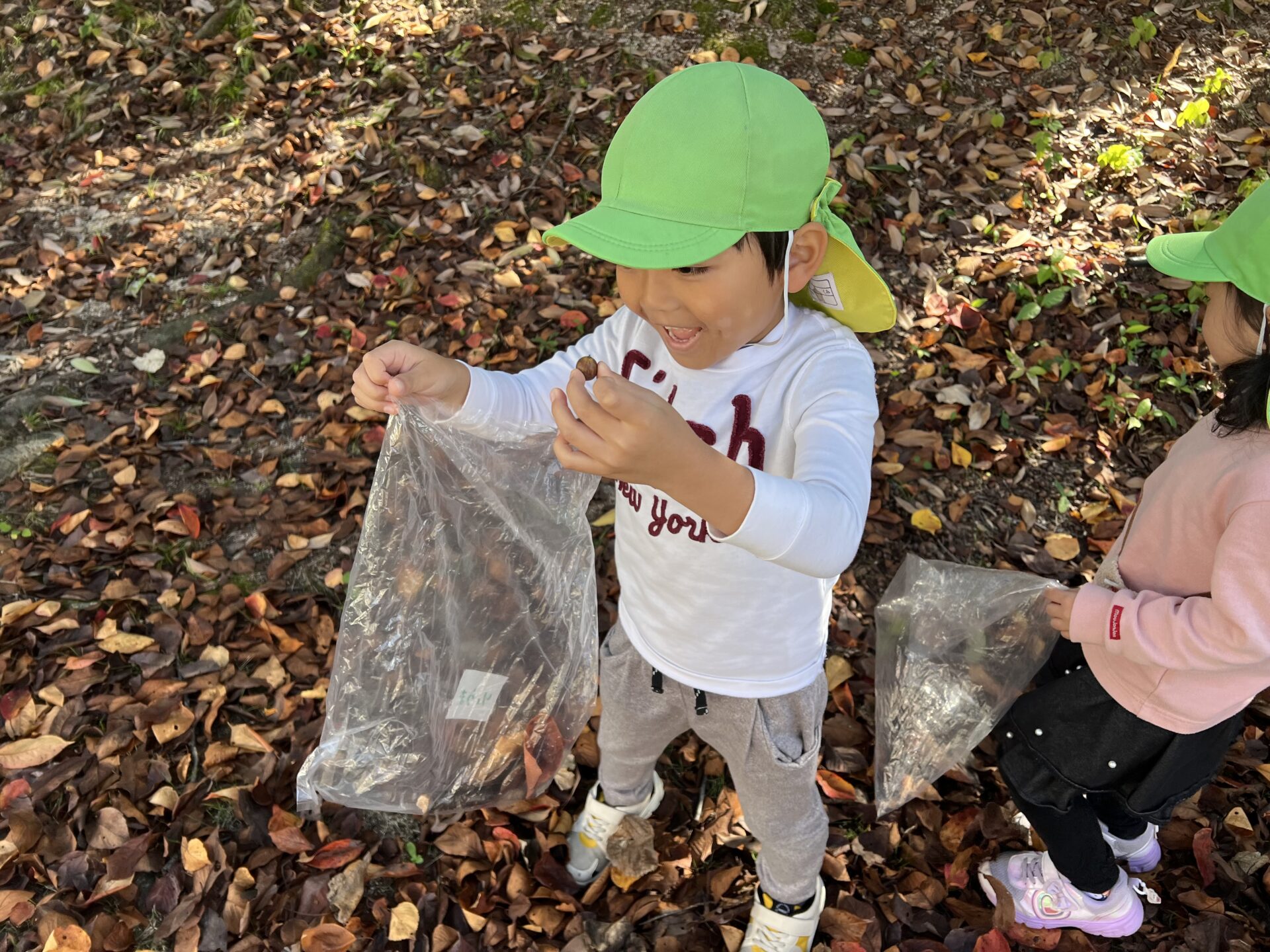 早速、みんなで【秋見つけ🍂】たくさん落ち葉がおちていて、よく見るとどんぐりもたくさんありました😊袋いっぱいに集めるぞー!!と子ども達は、一生懸命探しています。