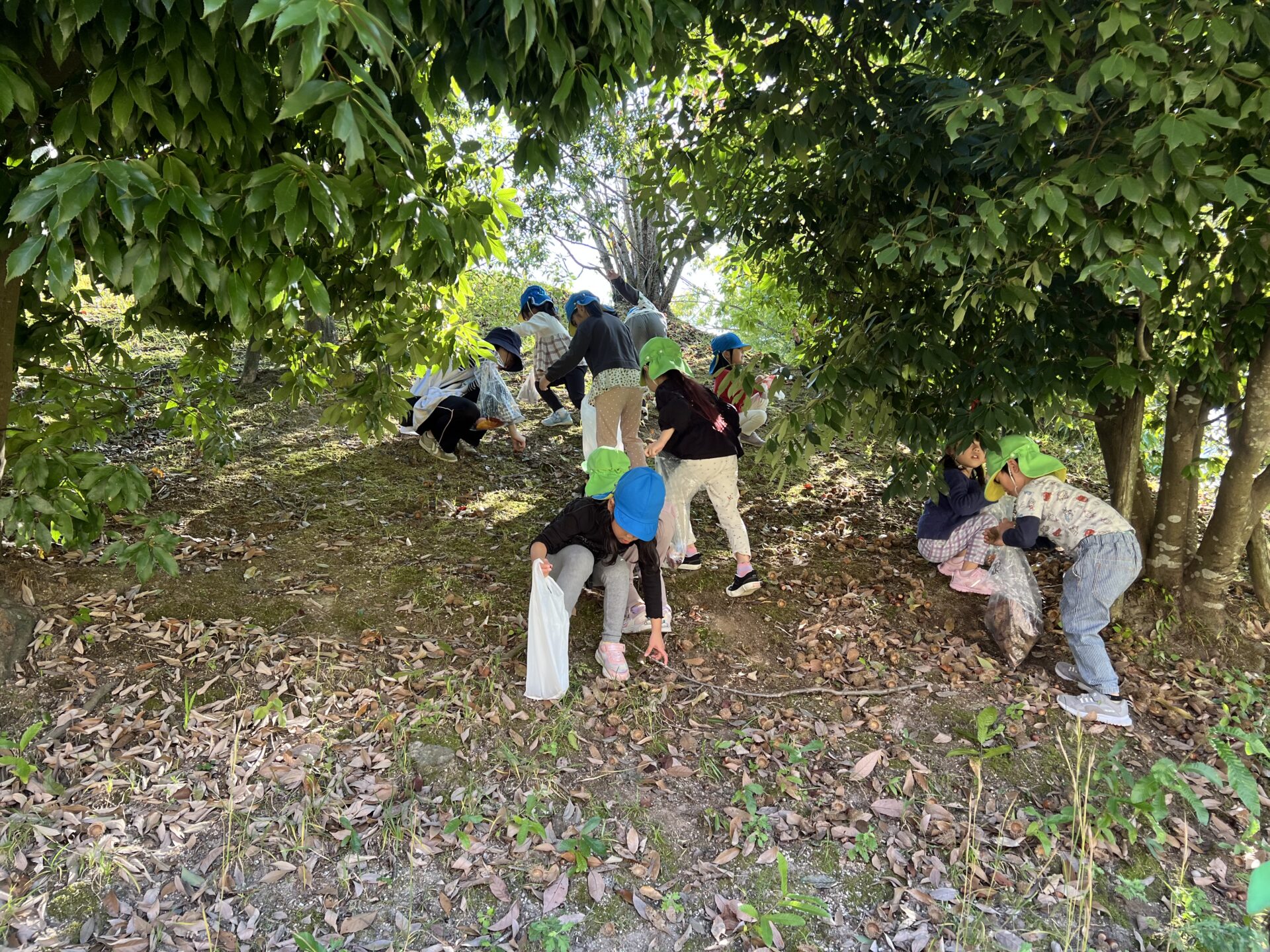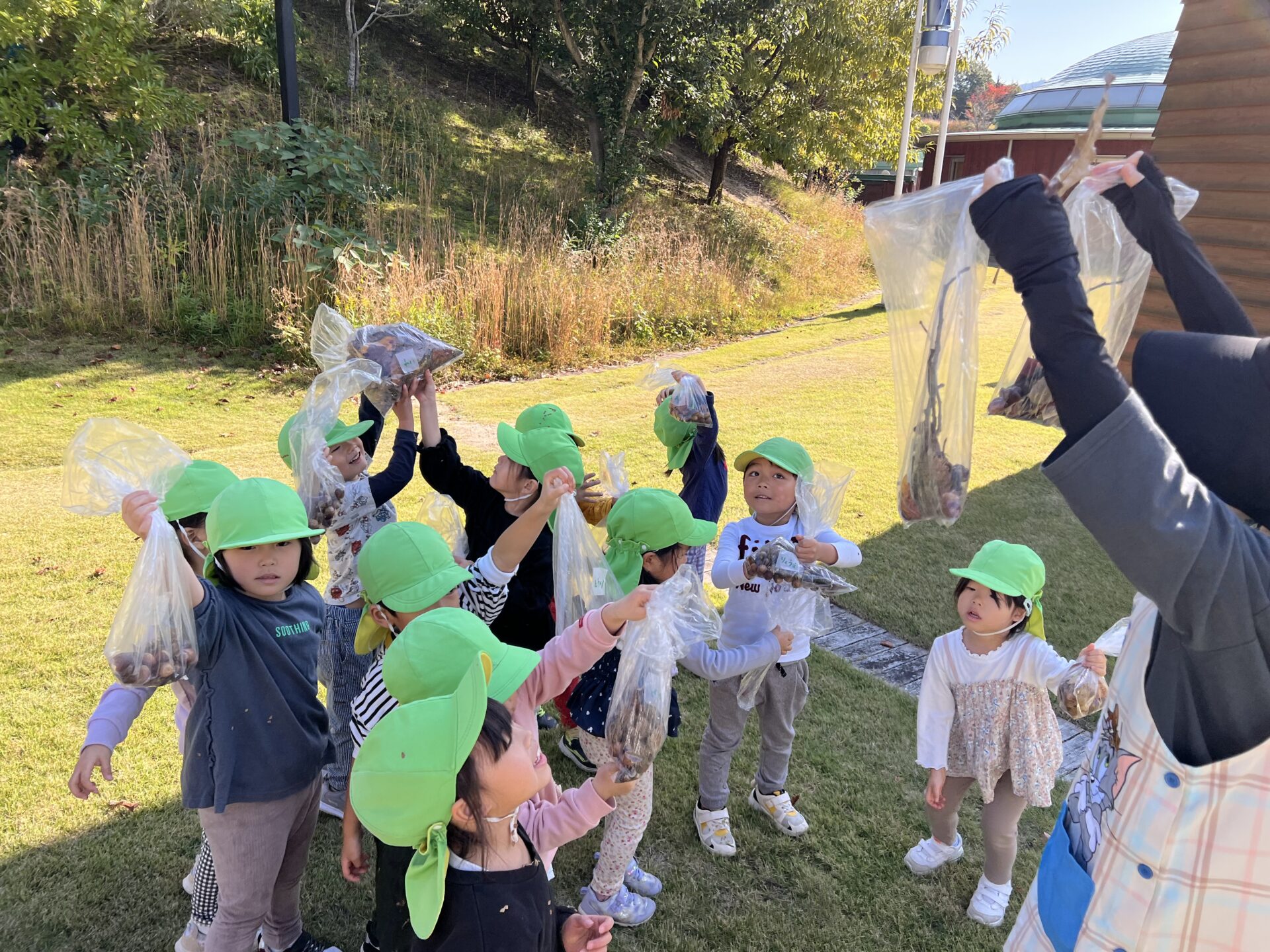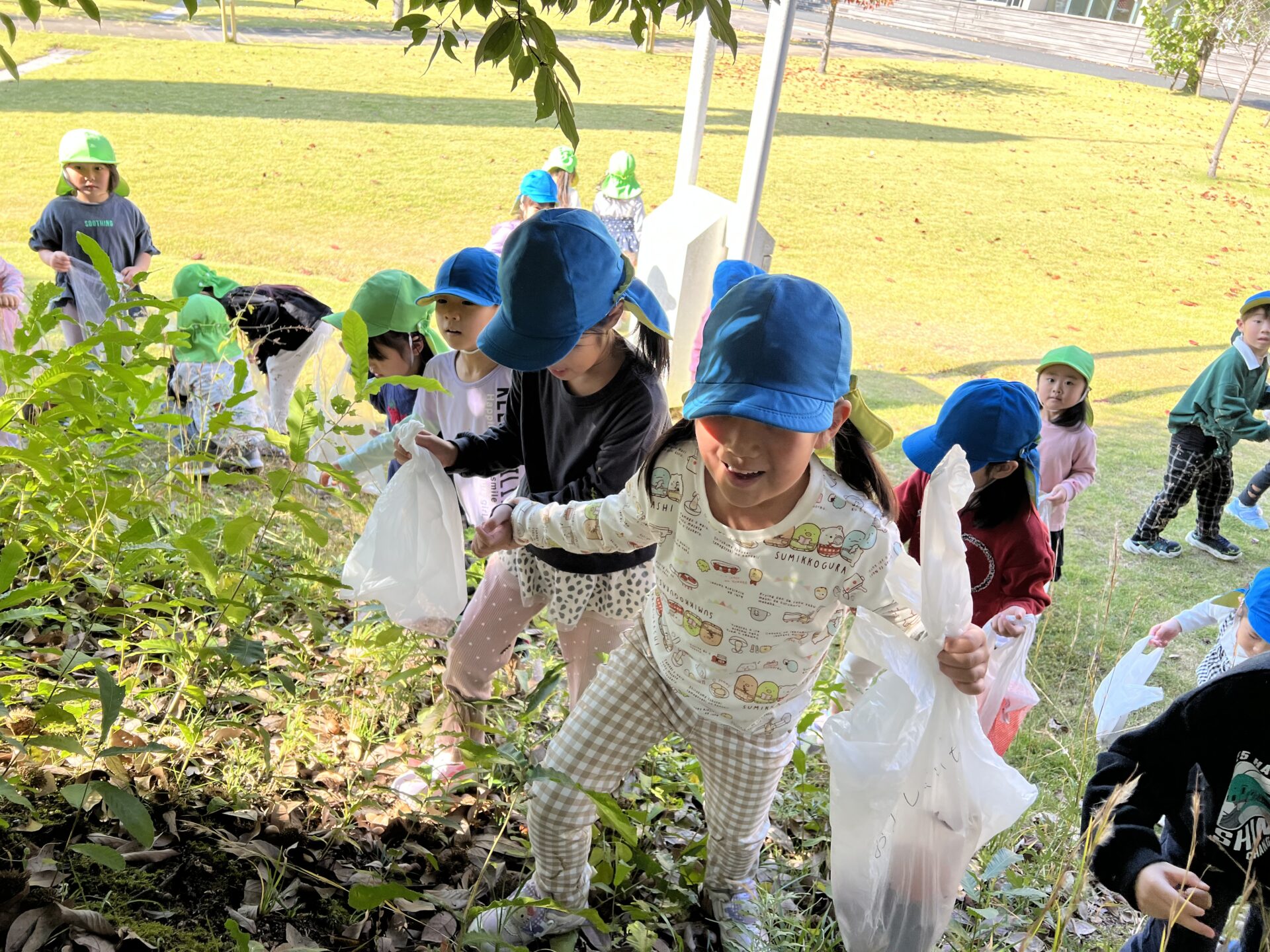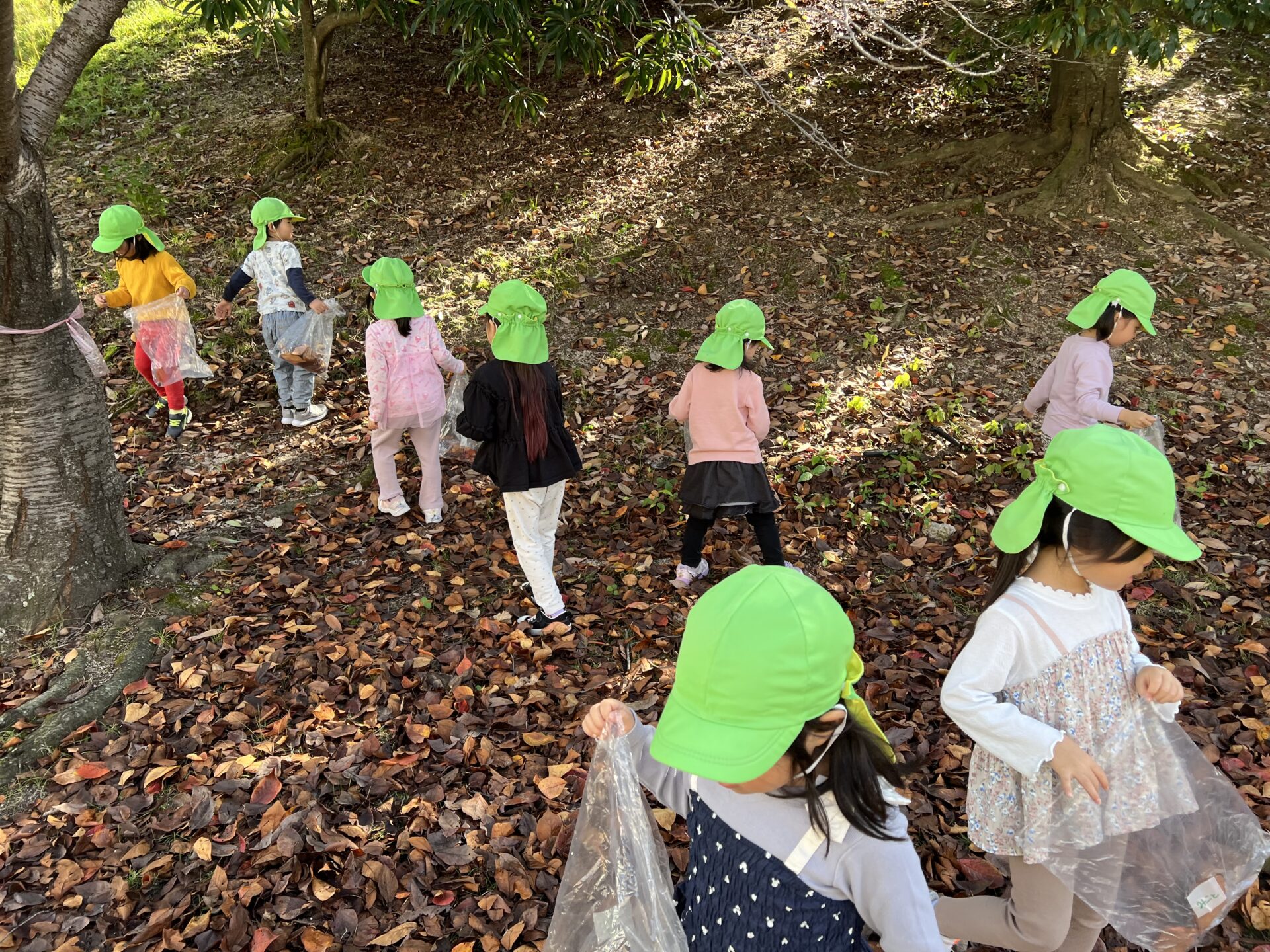 早速、みんなで【秋見つけ🍂】たくさん落ち葉がおちていて、よく見るとどんぐりもたくさんありました😊袋いっぱいに集めるぞー!!と子ども達は、一生懸命探しています。