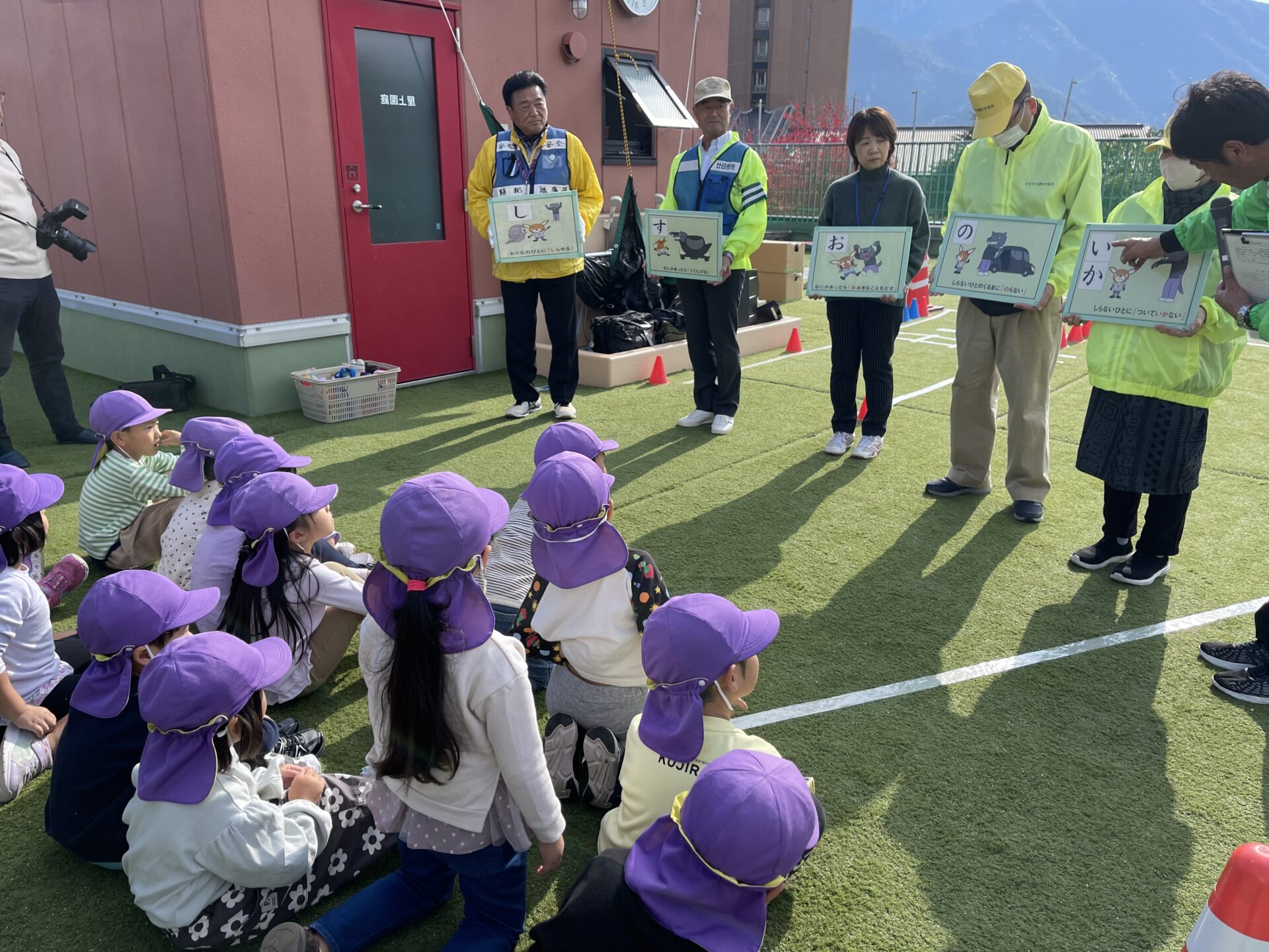 11月21日に交通安全教室を行い、4月から小学生になる年長くじらチームが、横断歩道や踏切の渡り方、怖い人に会ったときどうするかを教わりました。