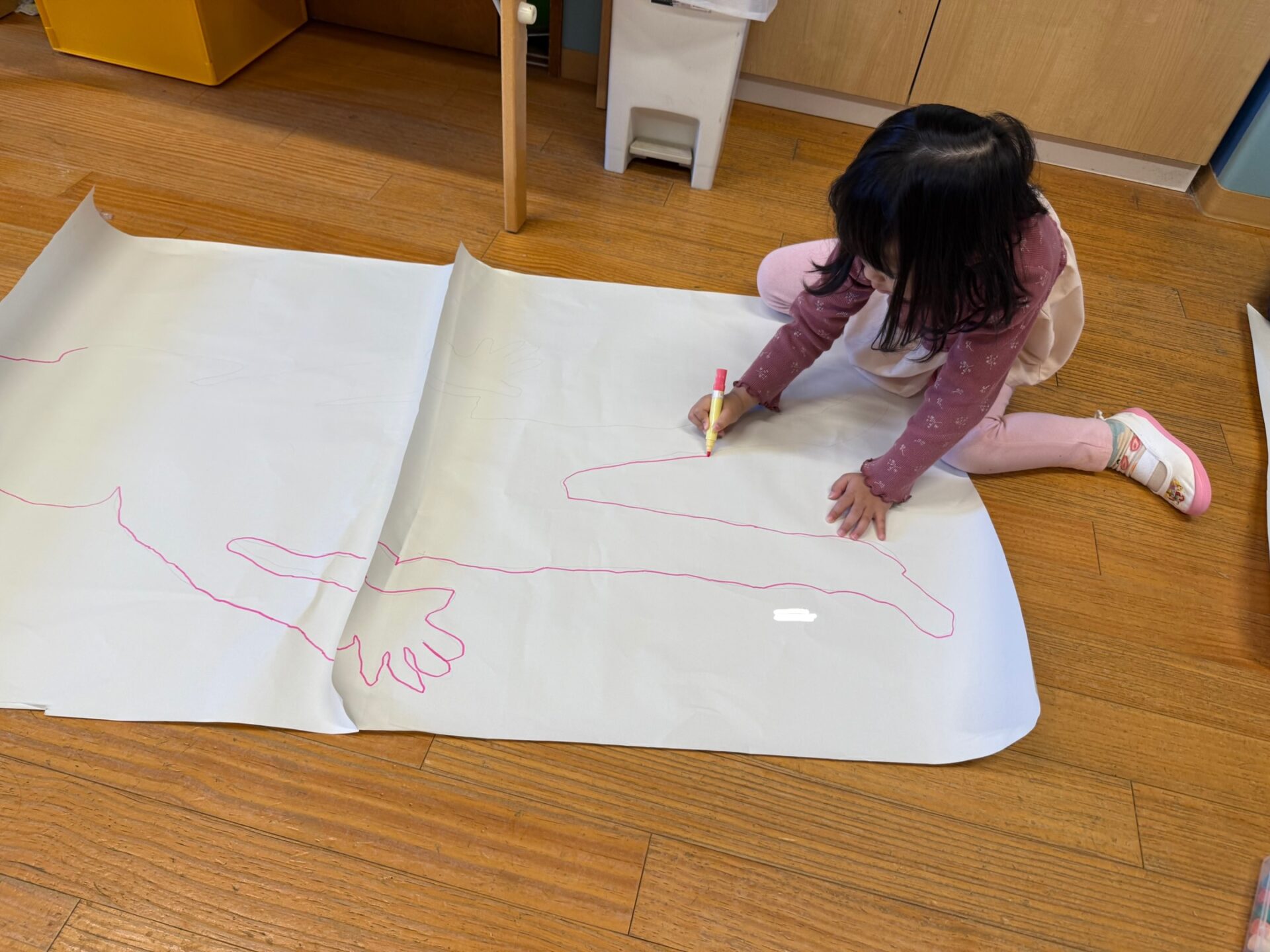 小さいサイズの自分作りを行いました。「大きい自分を作ったらどうなるのかな!」と声が上がり、等身大サイズの自分を作ることにしました!