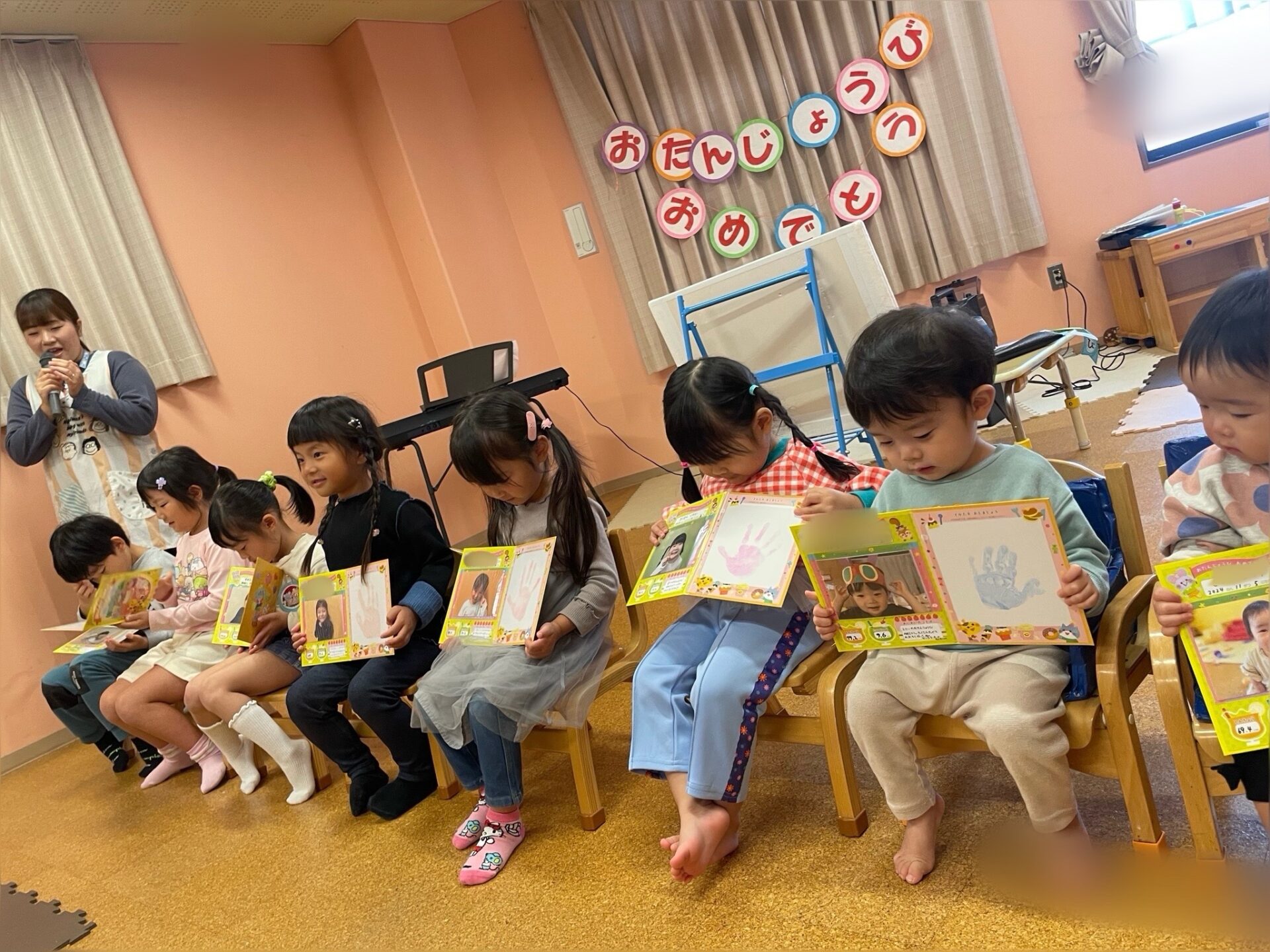 うみチームのお友達からくじらチームまで👀インタビューにもしっかり答えて誕生カードをもらい、