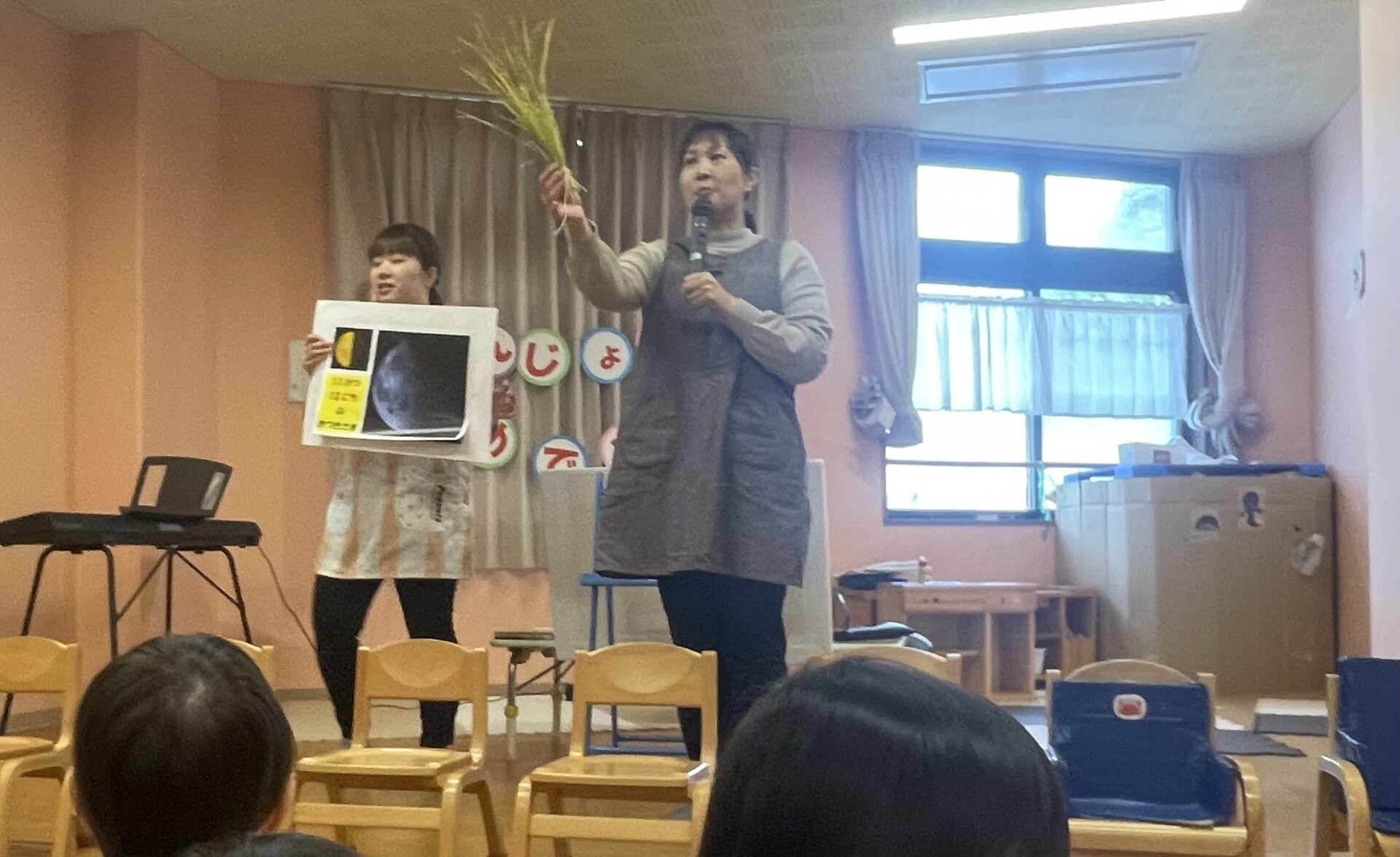 その日の月は半月で少し難しそうにしていた子ども達。保育園でとれたお米を園長先生が披露してくれ興味深々でした。