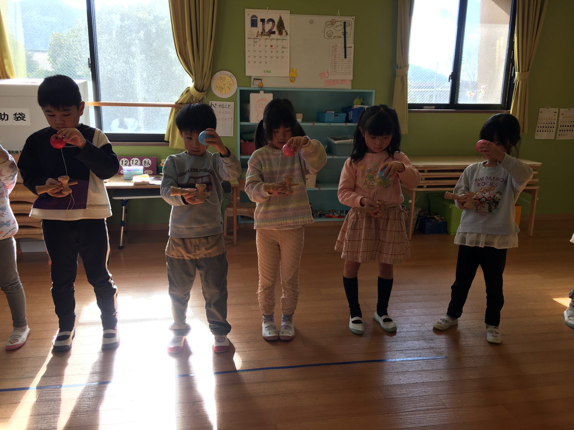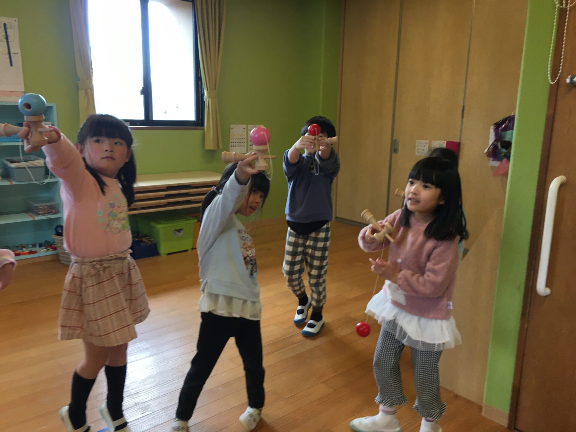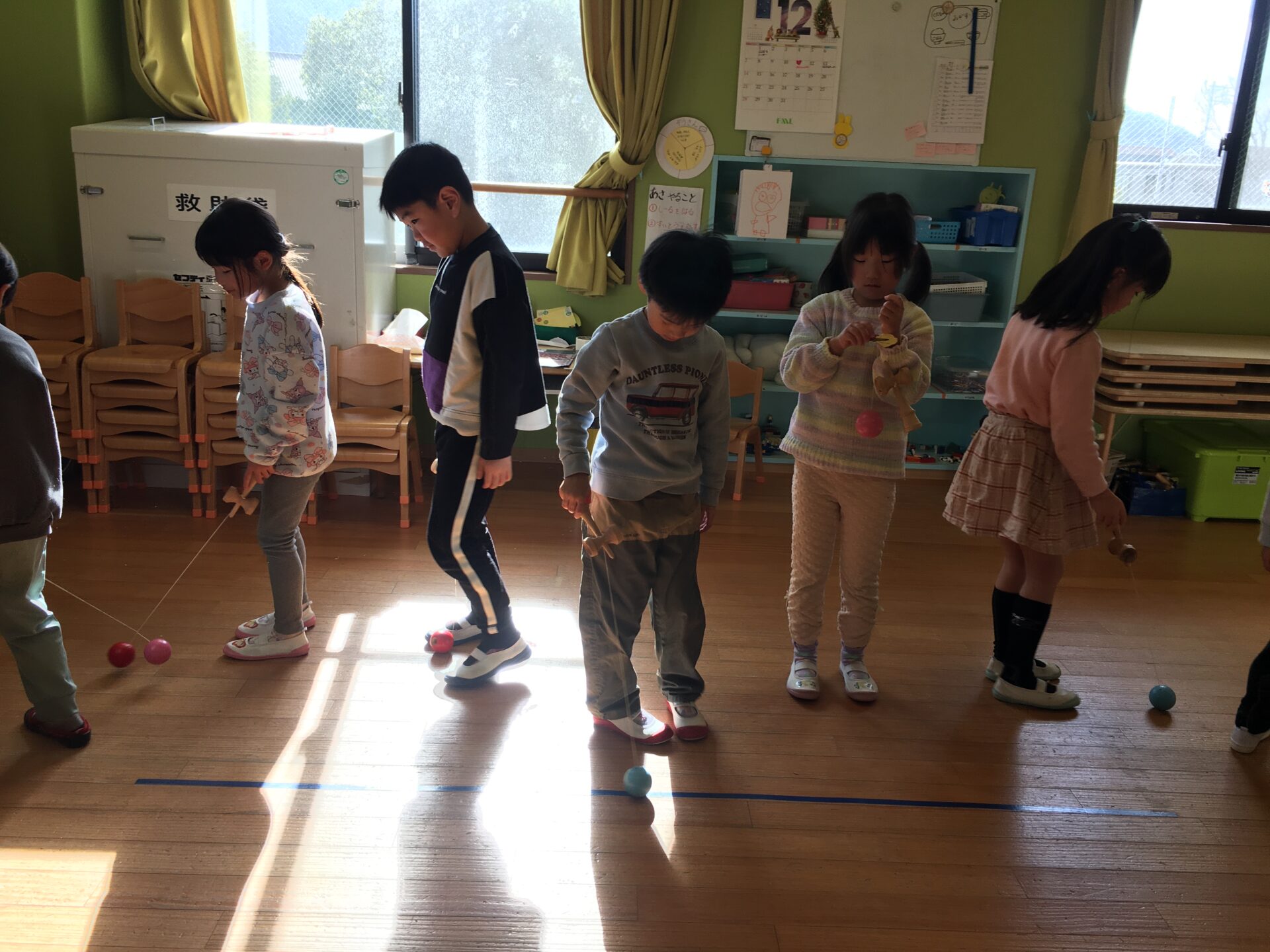 お部屋に行ってみると、明日の地域のけん玉まつりに参加するために、演目の練習を頑張っていました。