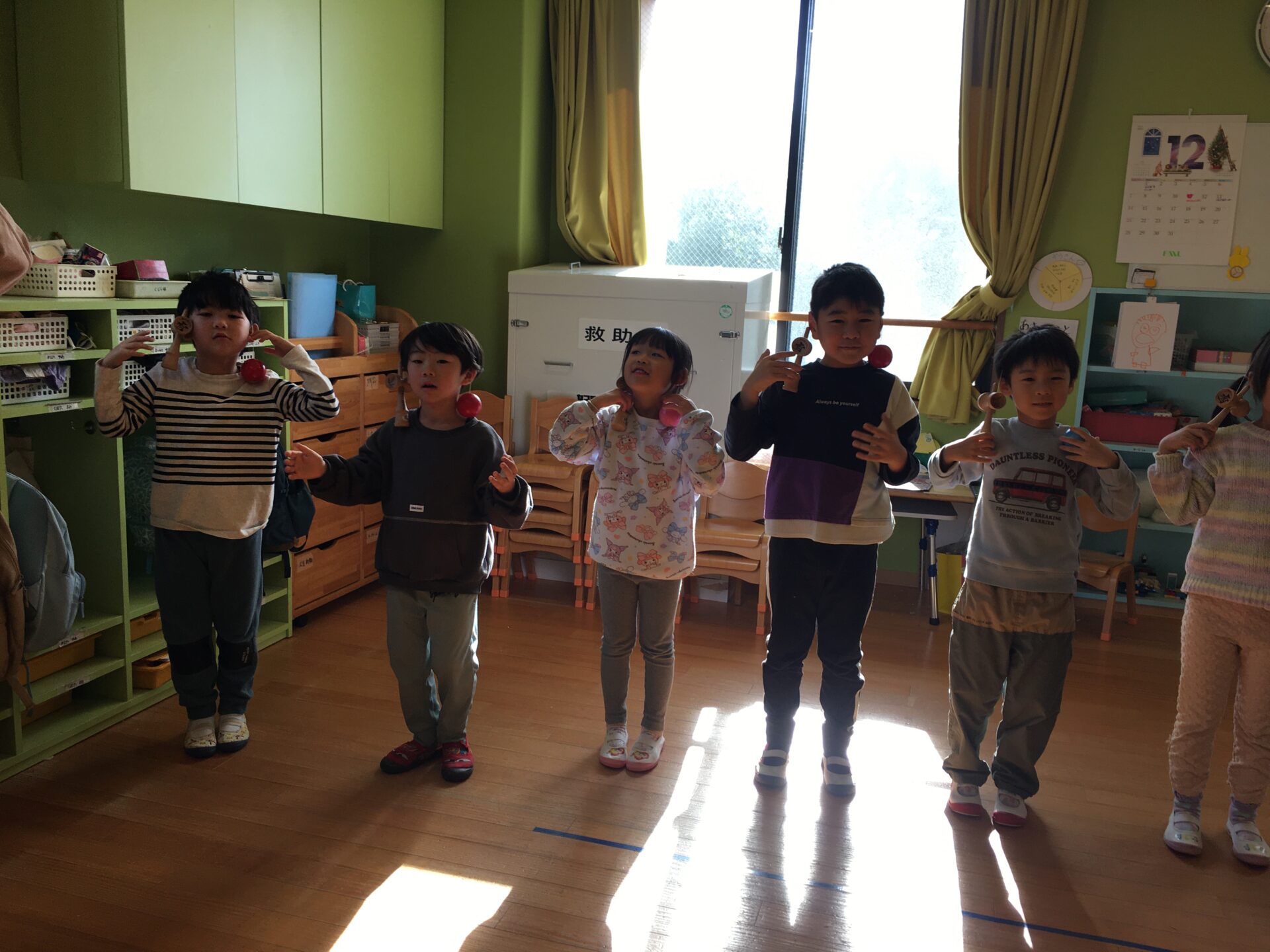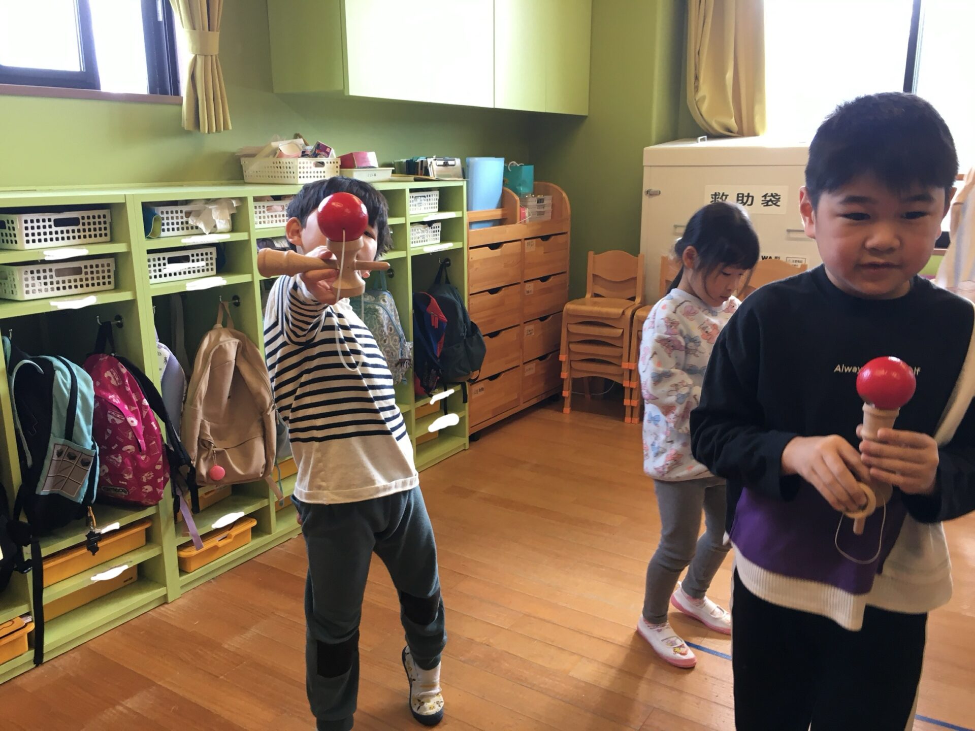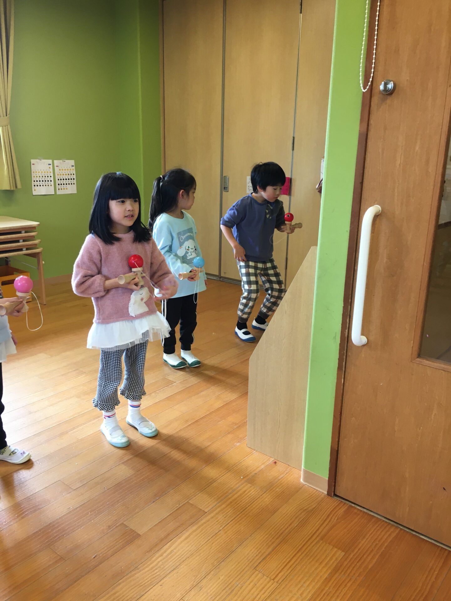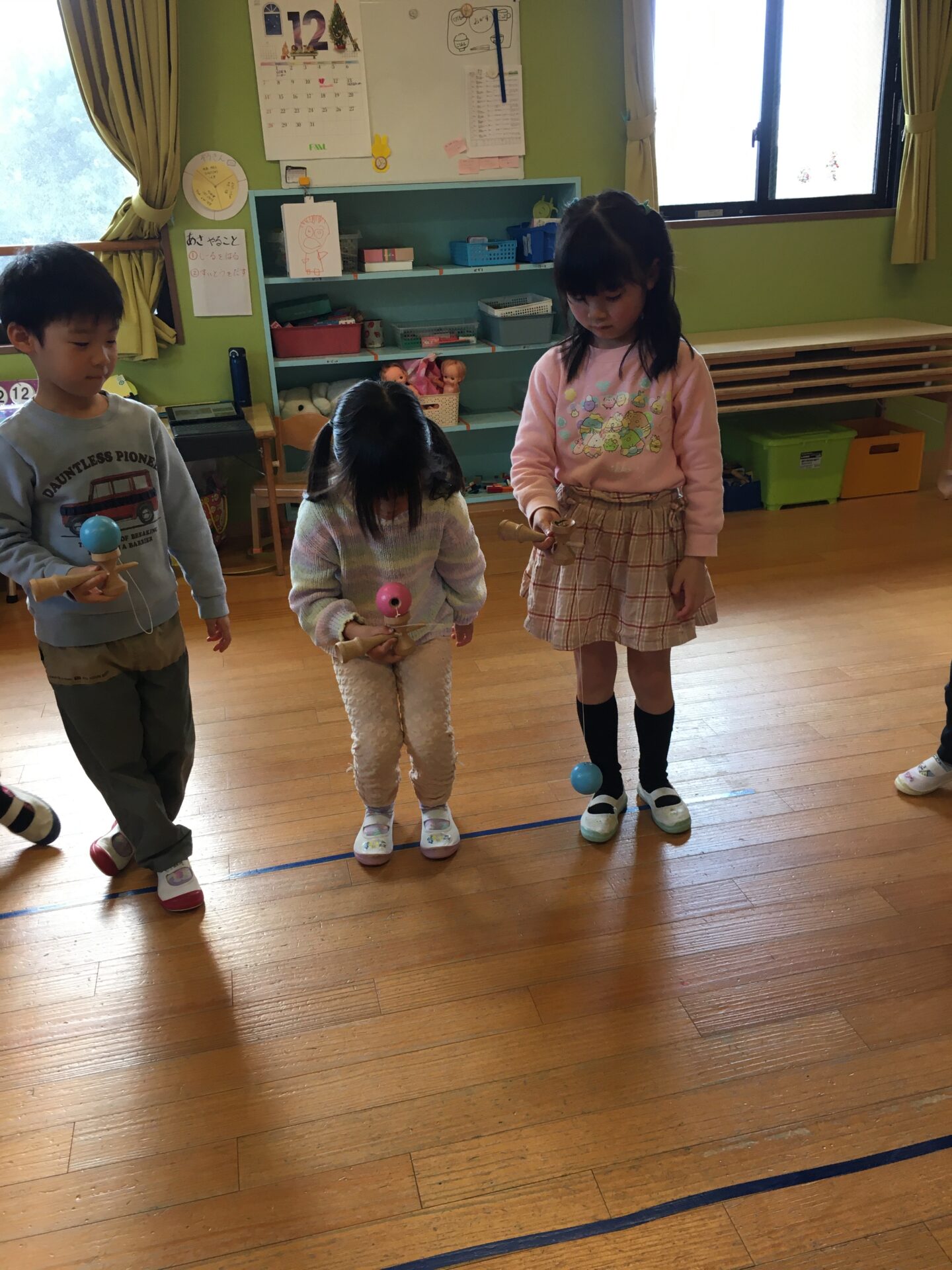 お部屋に行ってみると、明日の地域のけん玉まつりに参加するために、演目の練習を頑張っていました。