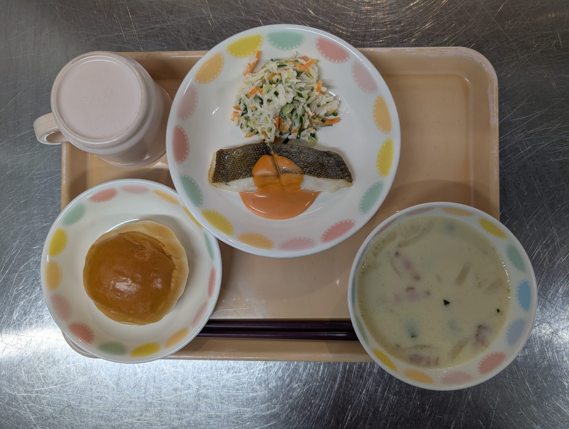 今日の給食は、ロールパン カレイのオーロラソース焼き 切り干し大根のサラダ 豆乳スープ