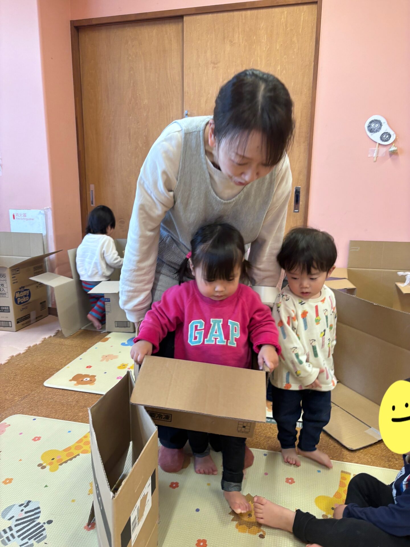 ダンボール遊びは回数を重ねる事に変化して行きました。初めは入ったり、出たりと感触を楽しんでいましたが、次第に汽車やお家に見立てて遊ぶ姿が見られるようになり、同じダンボールを囲む中で、自然と友だちと関わりながら遊ぶ姿も増えていきました。子ども達の「やってみたい」の気持ちからヒントをもらい、その時々の興味に合わせて遊びが広がっていったダンボール遊びでした。
