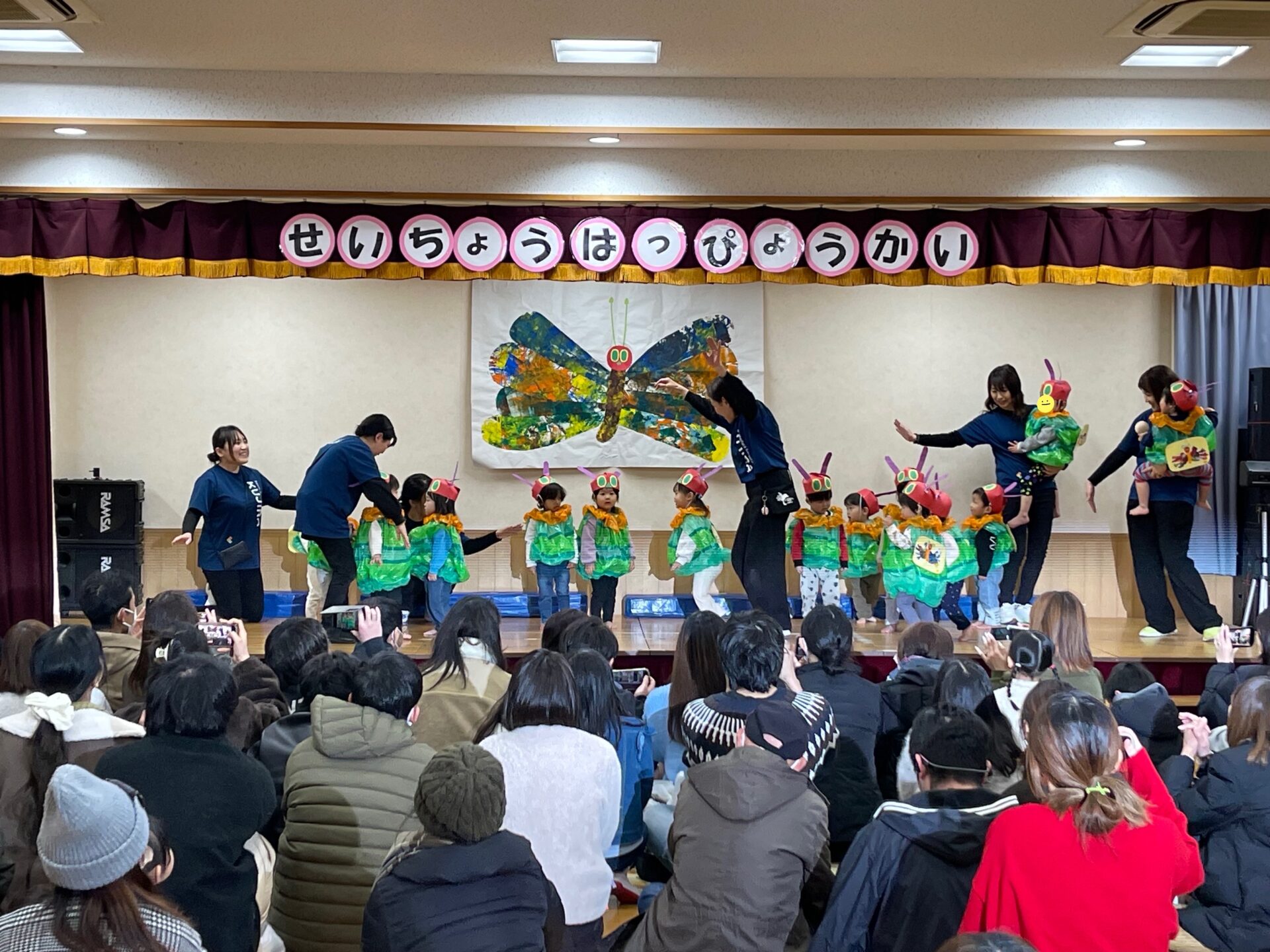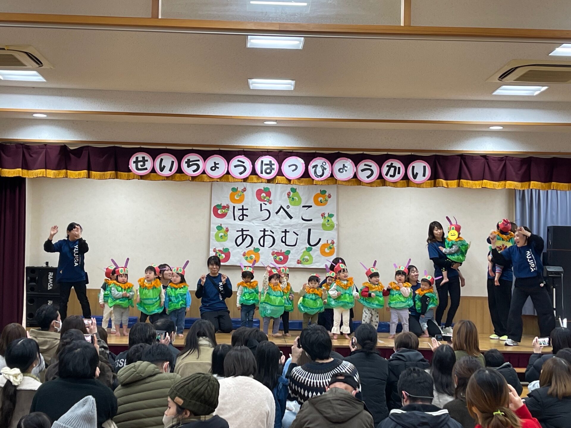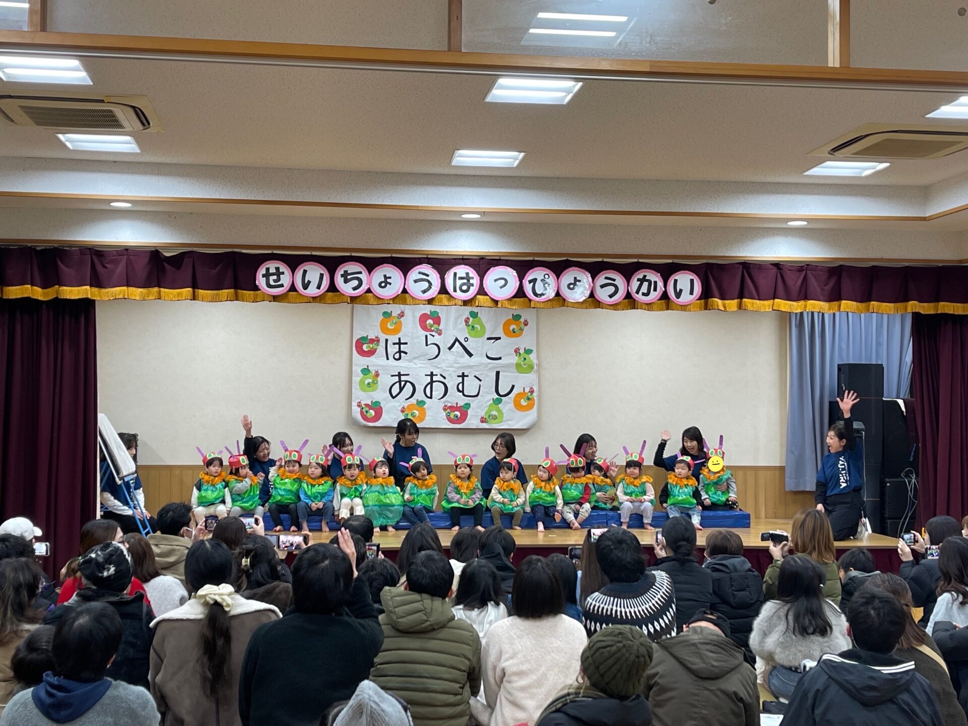 これまで、絵本「はらぺこあおむし」を繰り返し読んだり、体を動かして遊んだりしながら、発表会に向けて楽しく過ごしてきました。