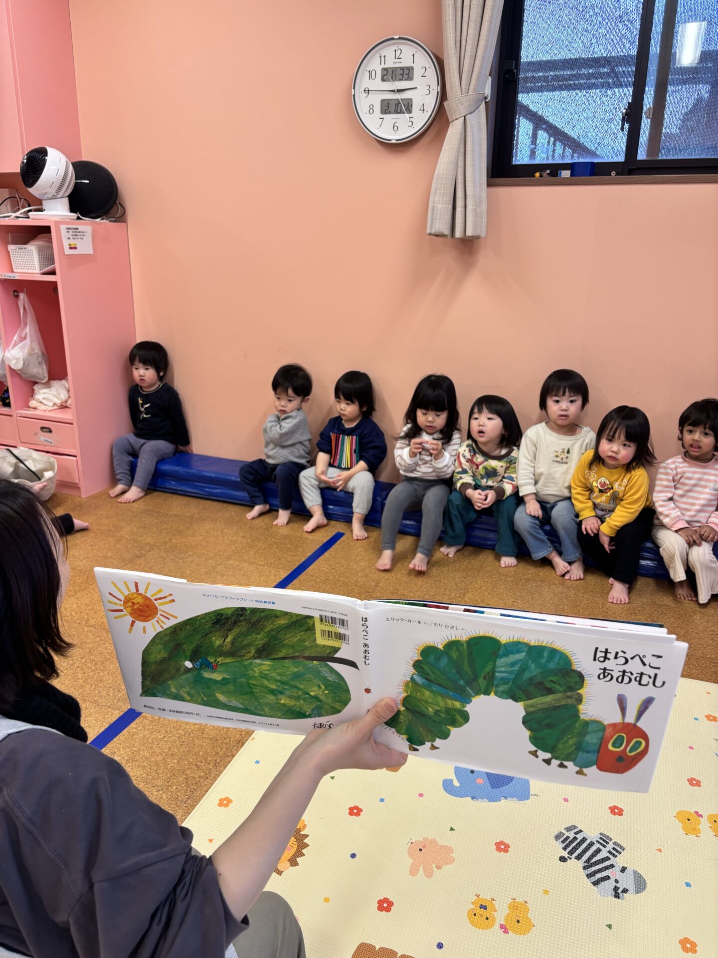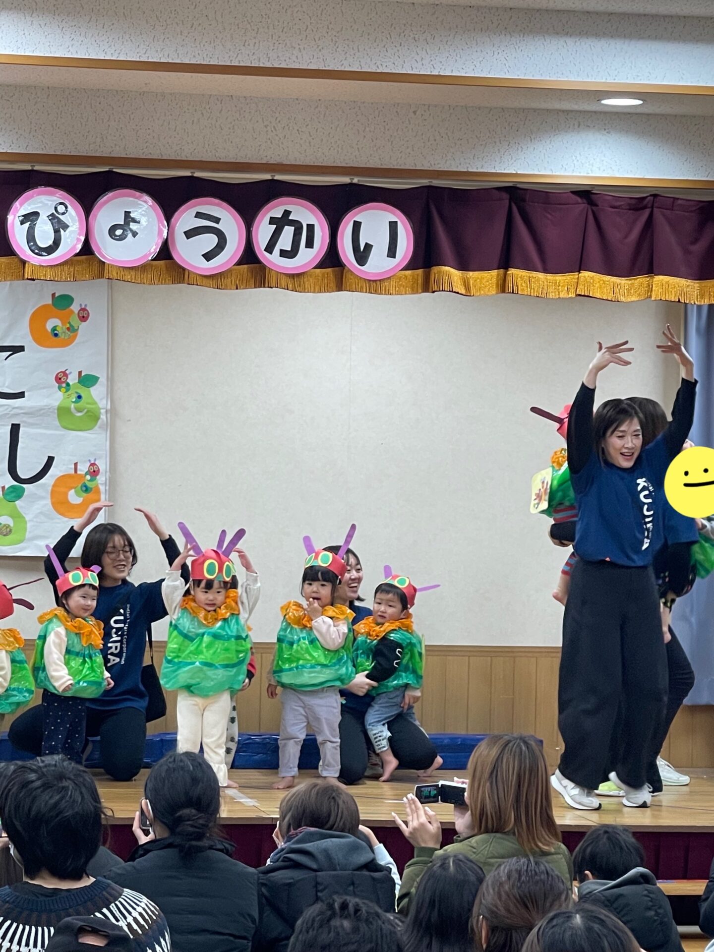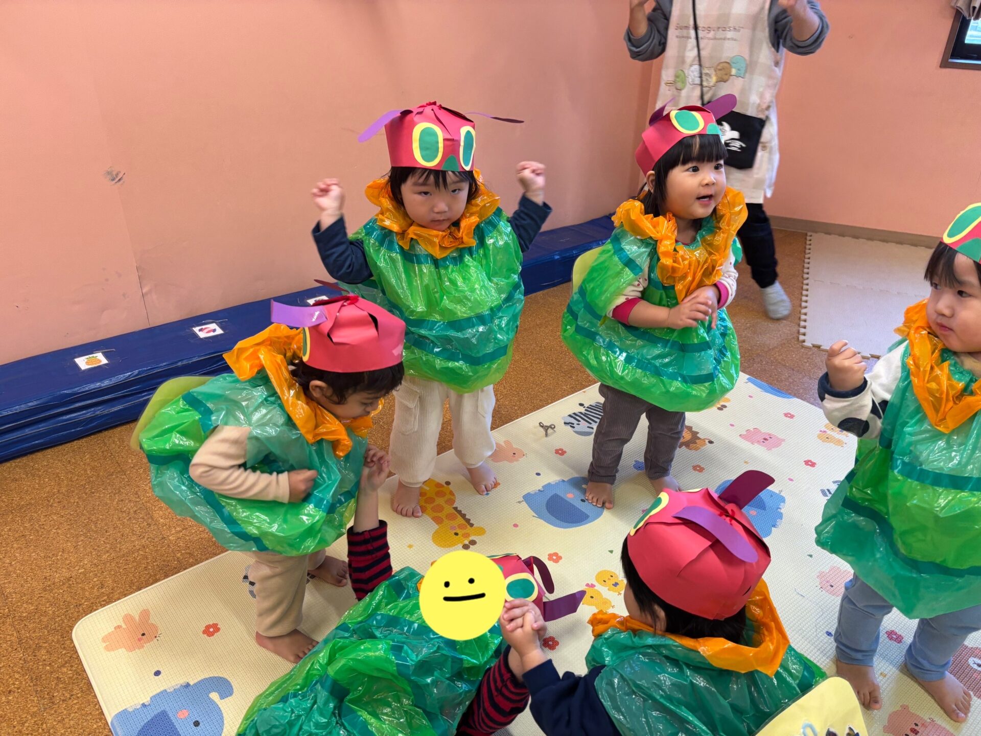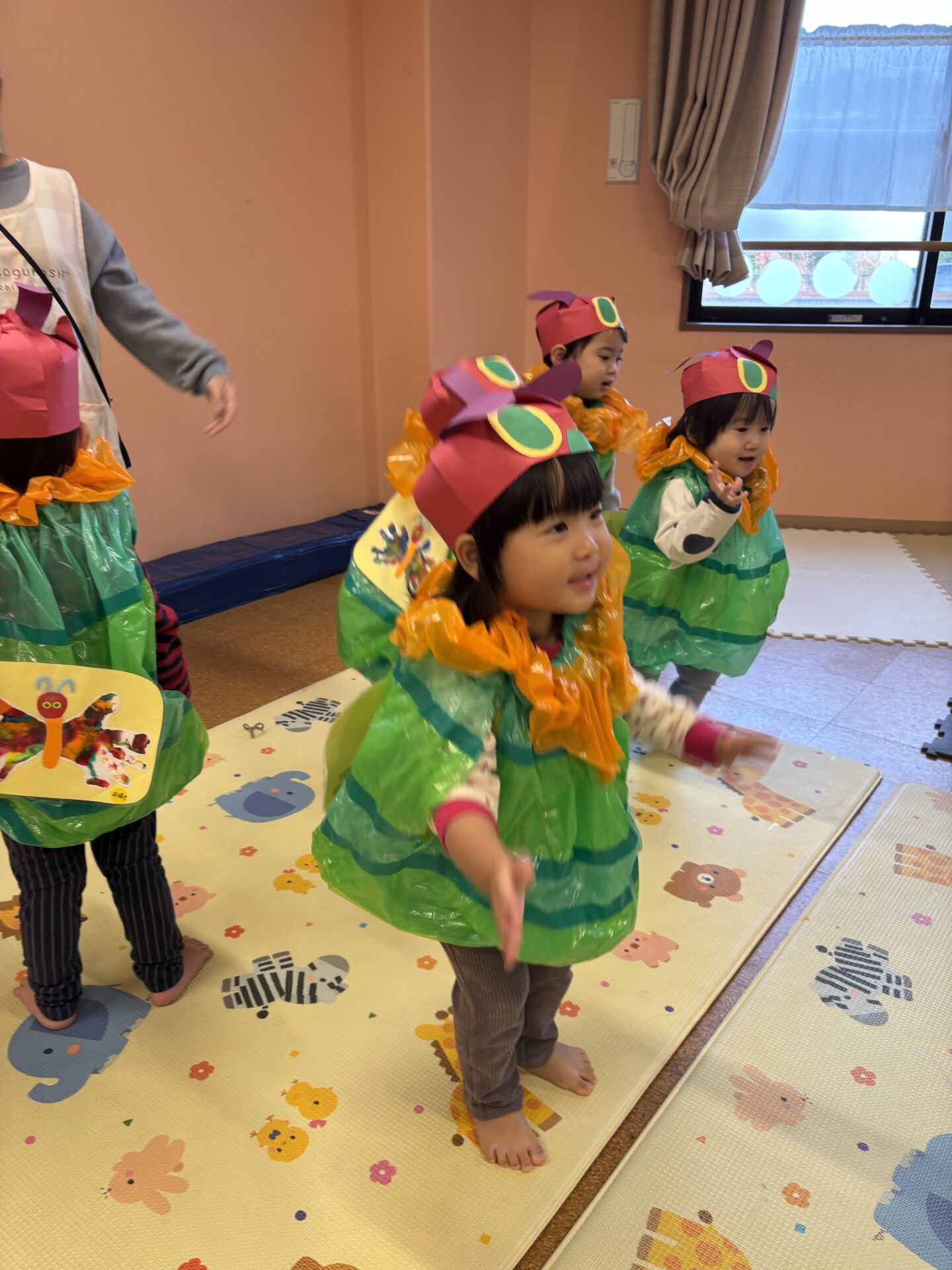 これまで、絵本「はらぺこあおむし」を繰り返し読んだり、体を動かして遊んだりしながら、発表会に向けて楽しく過ごしてきました。