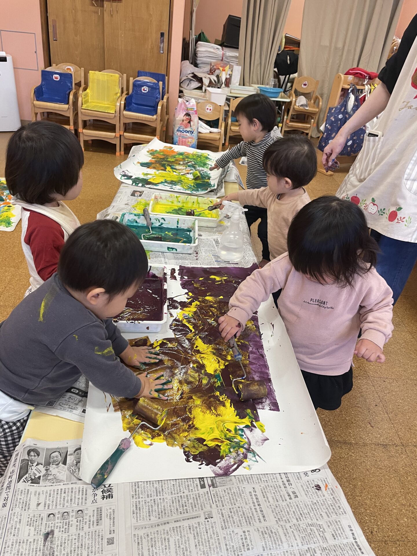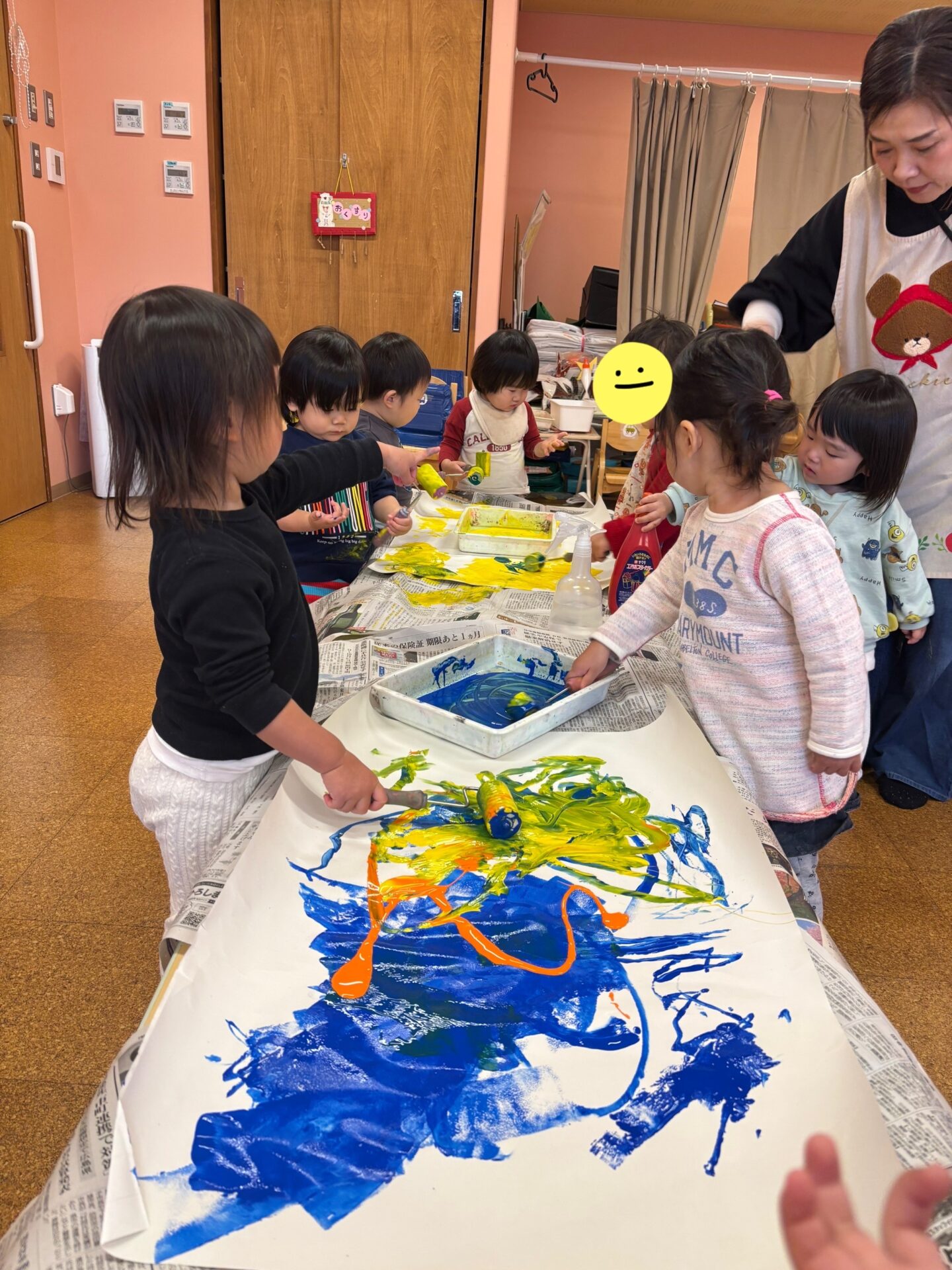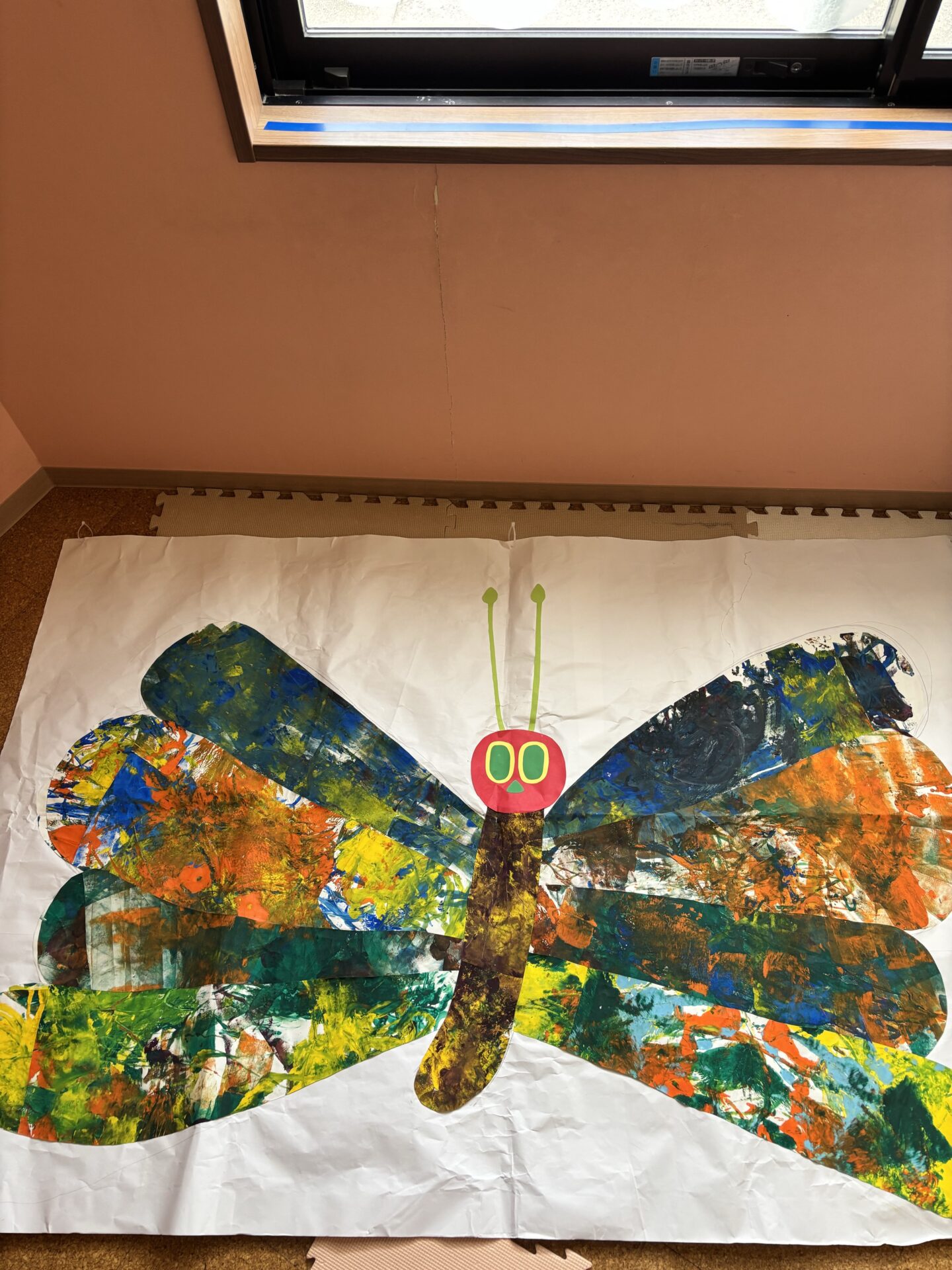 背景に飾ったちょうちょは、子どもたちみんなで作ったものです。色々な色に触れながら、世界にひとつだけのちょうちょが完成しました。