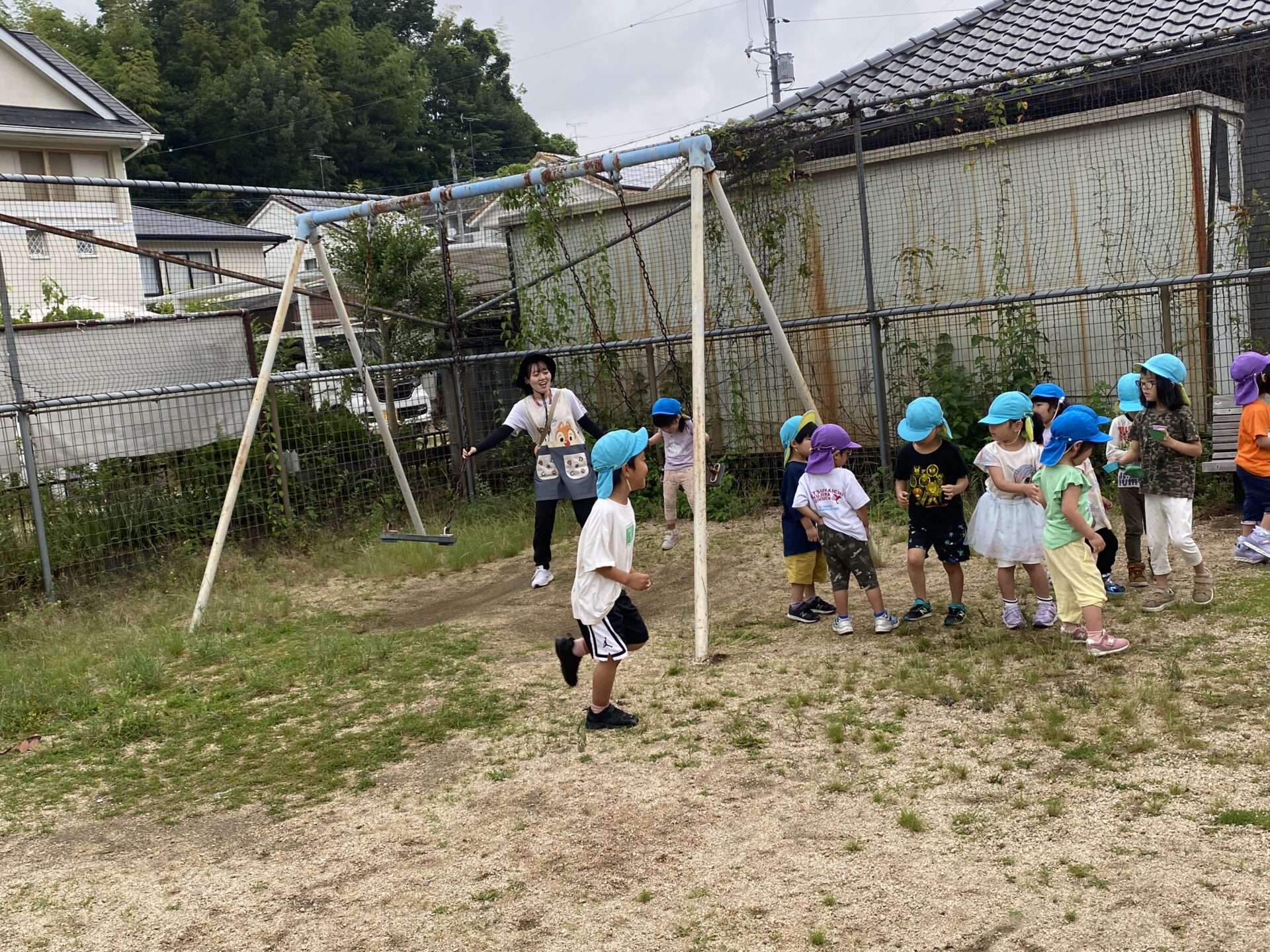 ブランコでは、順番を待つ・代わるが自然とできます。遊びたい!と思ったら、自然とルールが守れるようになるのですね。年長さんが年少さんに「ここに並ぶんよ」「あと10数えたら交代じゃけぇね」と教えている姿をみて、共に遊ぶ中で、代々とルールが受け継がれていくのだと思いました。