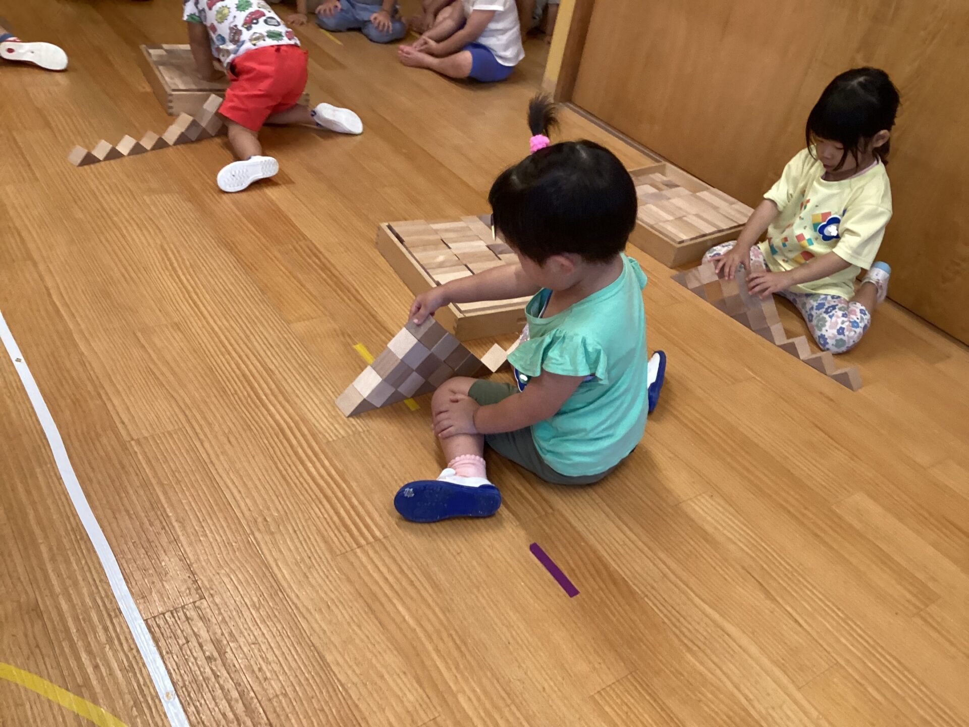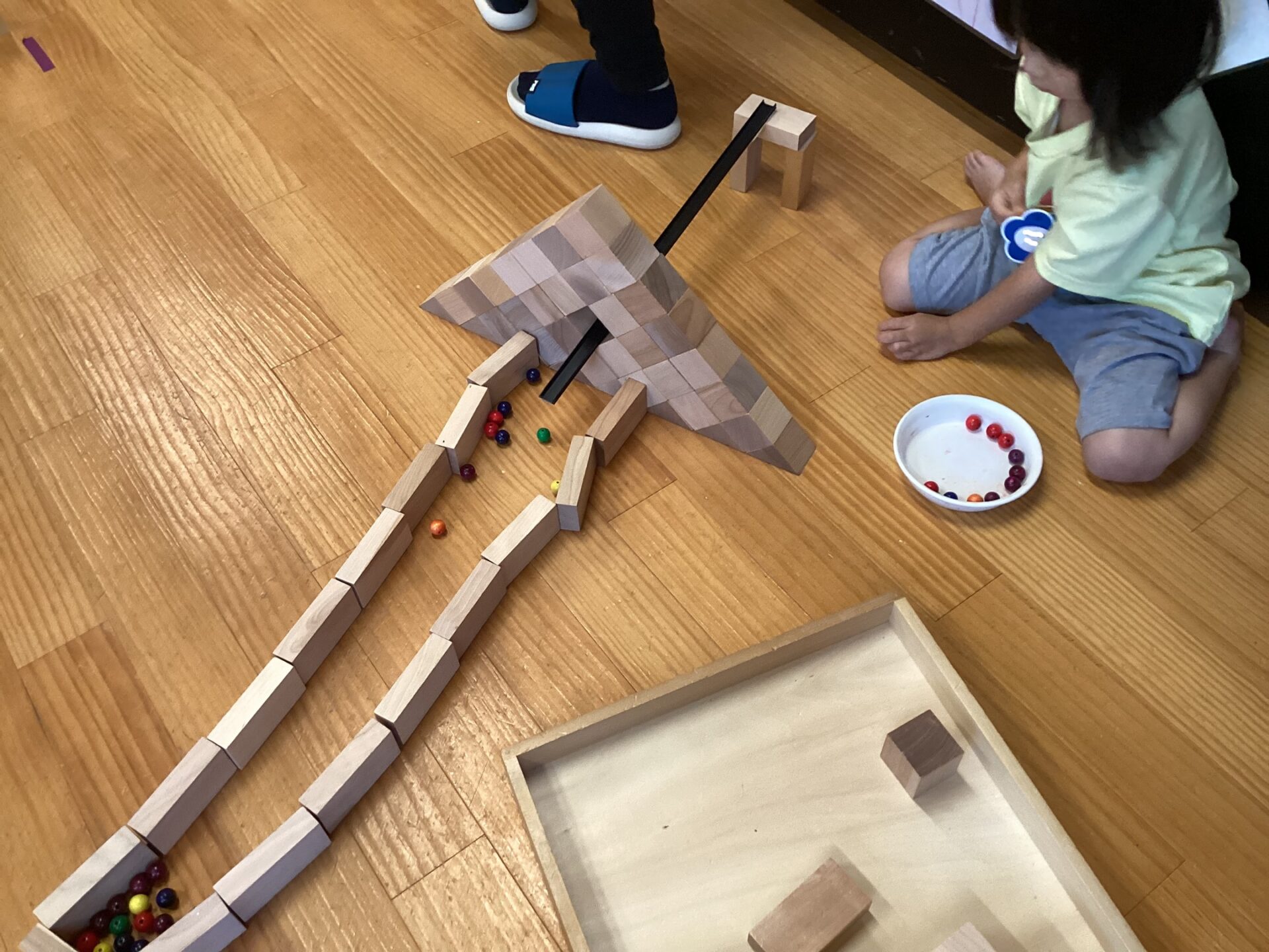 次は、積み木で大きな山を作り、穴をあけて棒を通してビーズが転がるのを楽しみます。