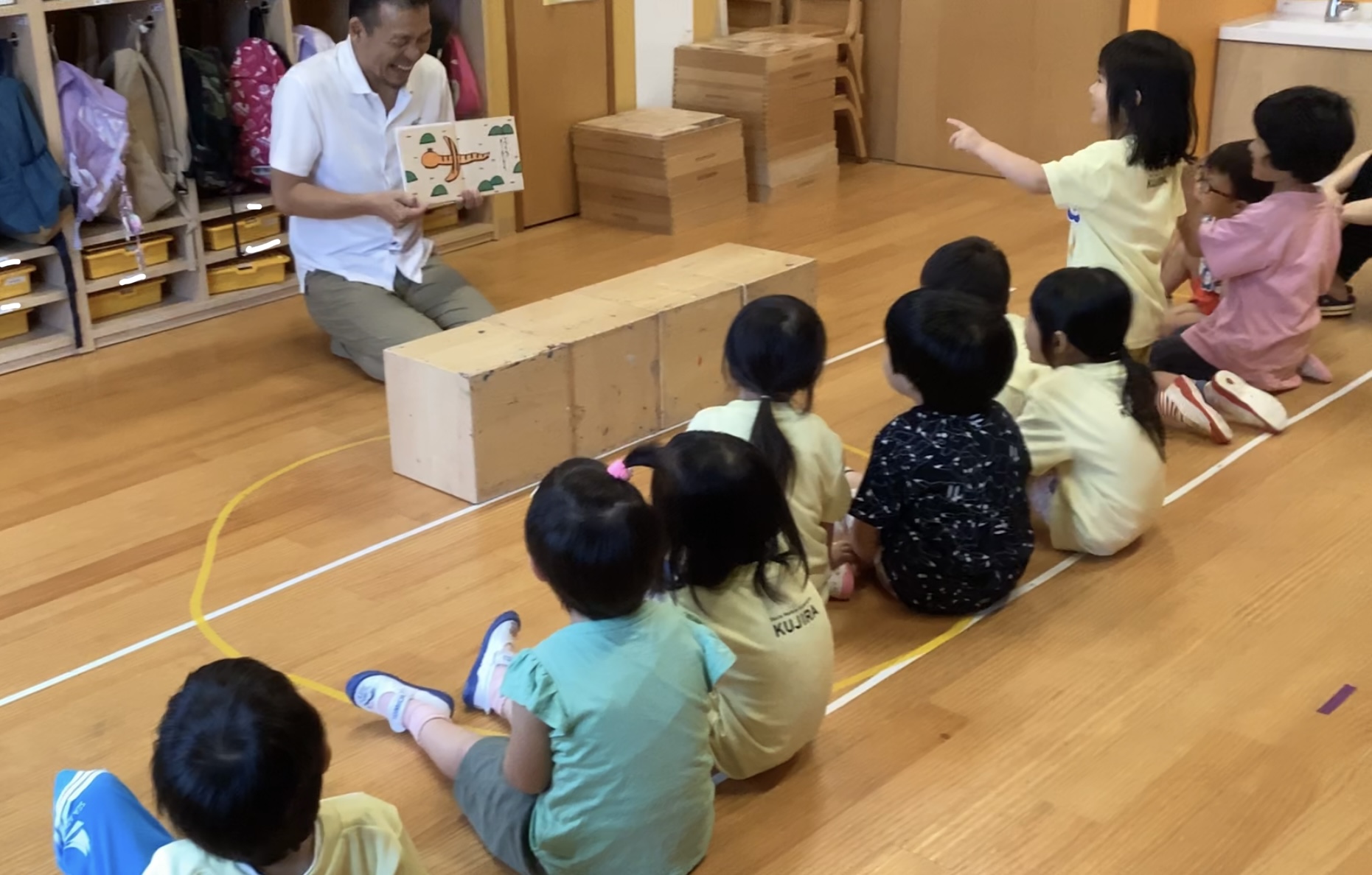 「はらぺこへびくん」の絵本では、りんごやおにぎりをペロリと丸呑みにするへびくんに大笑いのにじチームさん☺️わくわく創造アトリエの田上先生のニコニコ笑顔に、思わず保育士も笑顔になりました😄