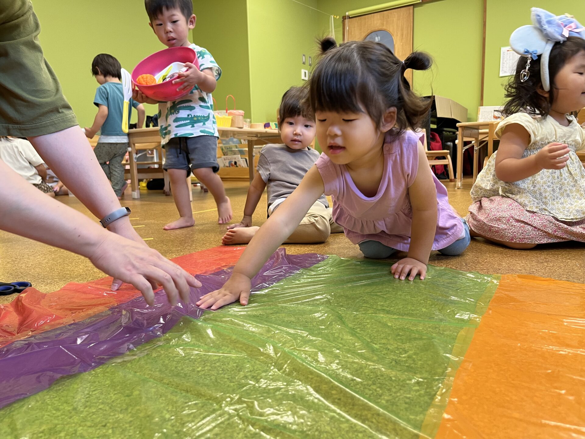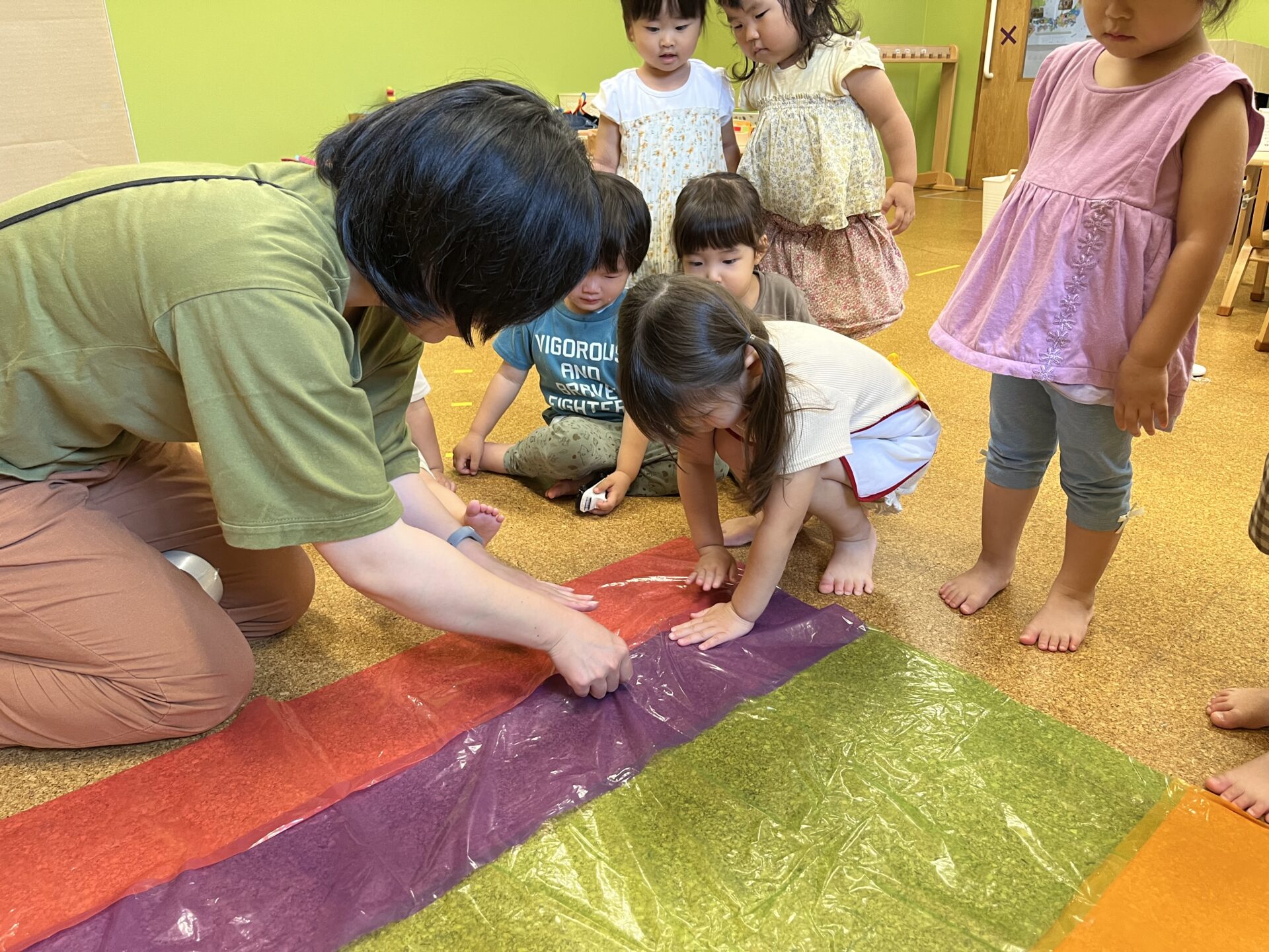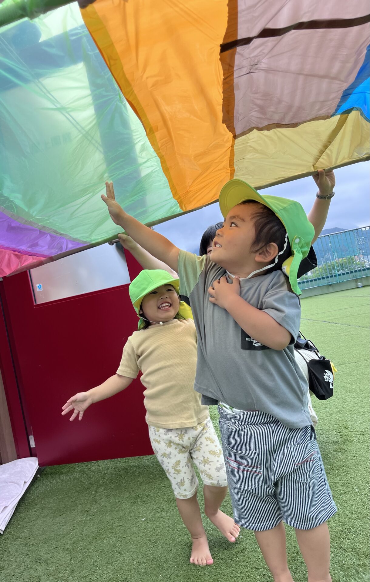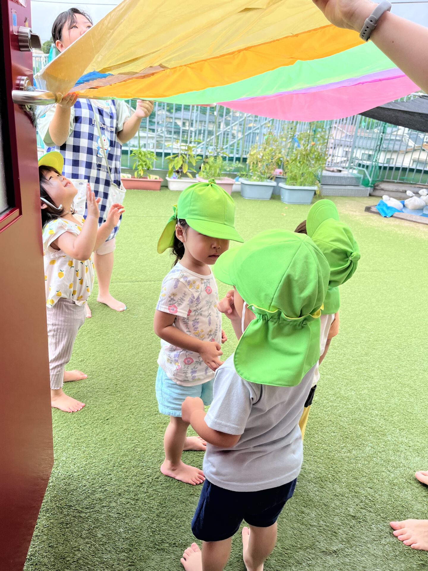 カラフルなテントでの雨の日遊び、雨の日の憂鬱さを吹き飛ばすような子どもたちの笑顔が見られました♡