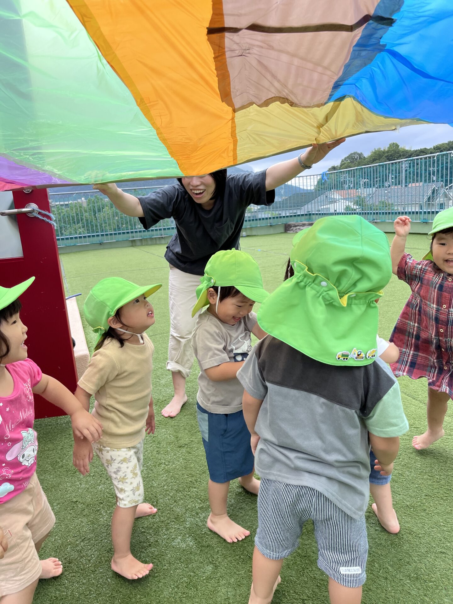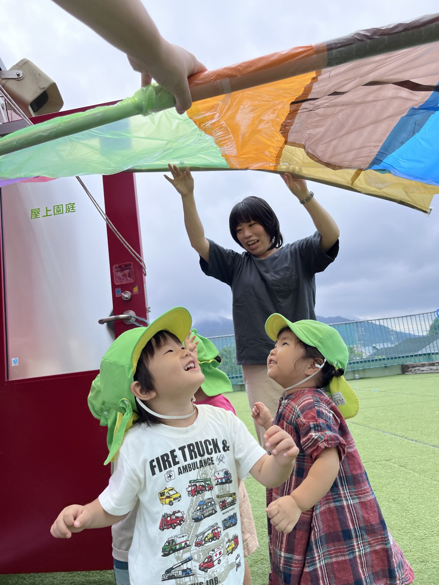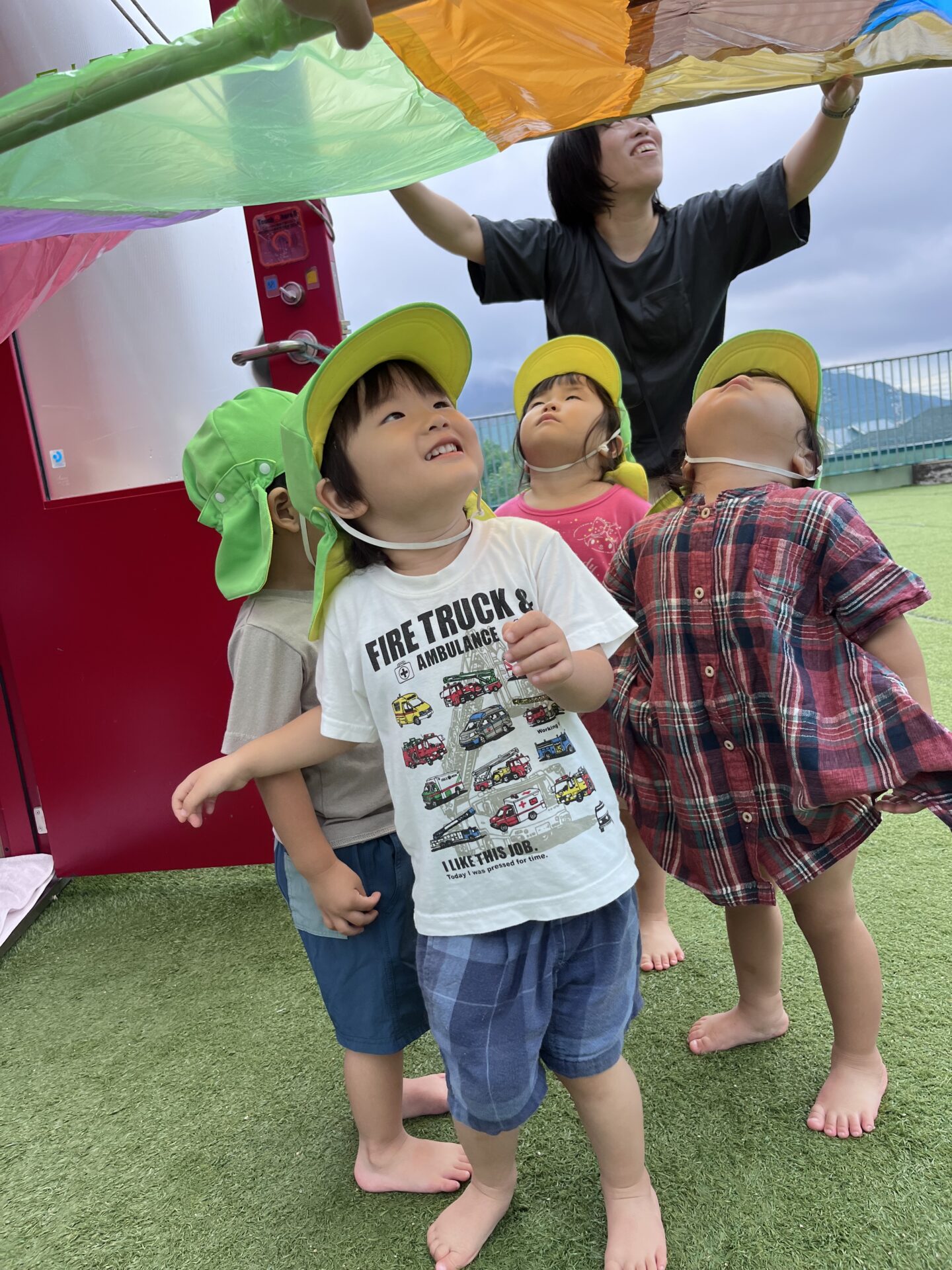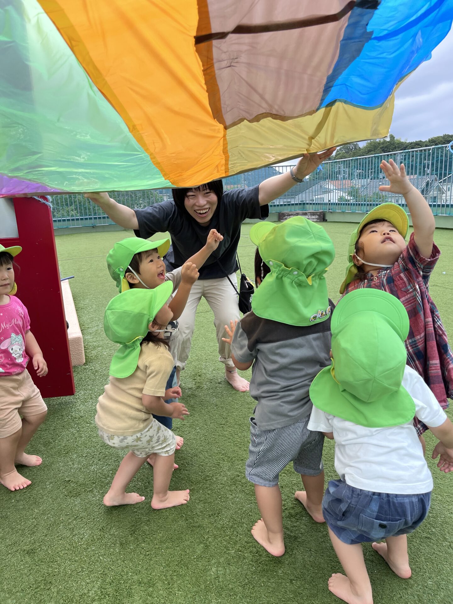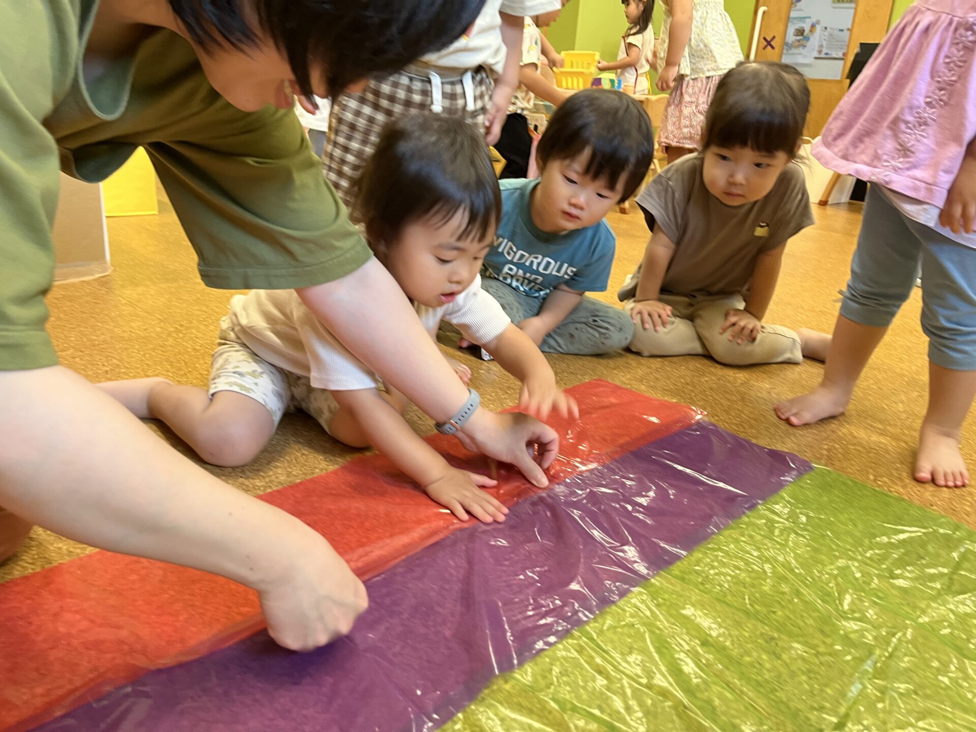 カラフルなテントでの雨の日遊び、雨の日の憂鬱さを吹き飛ばすような子どもたちの笑顔が見られました♡