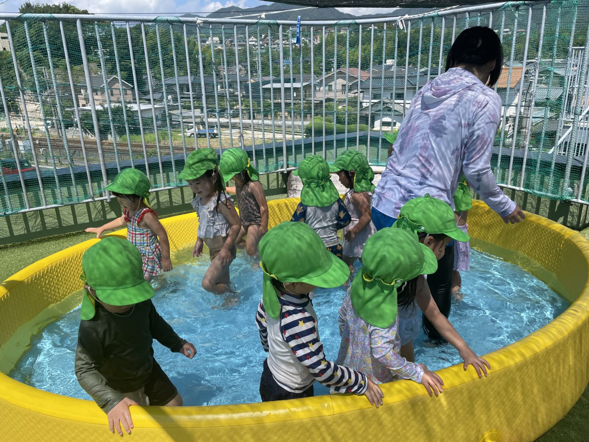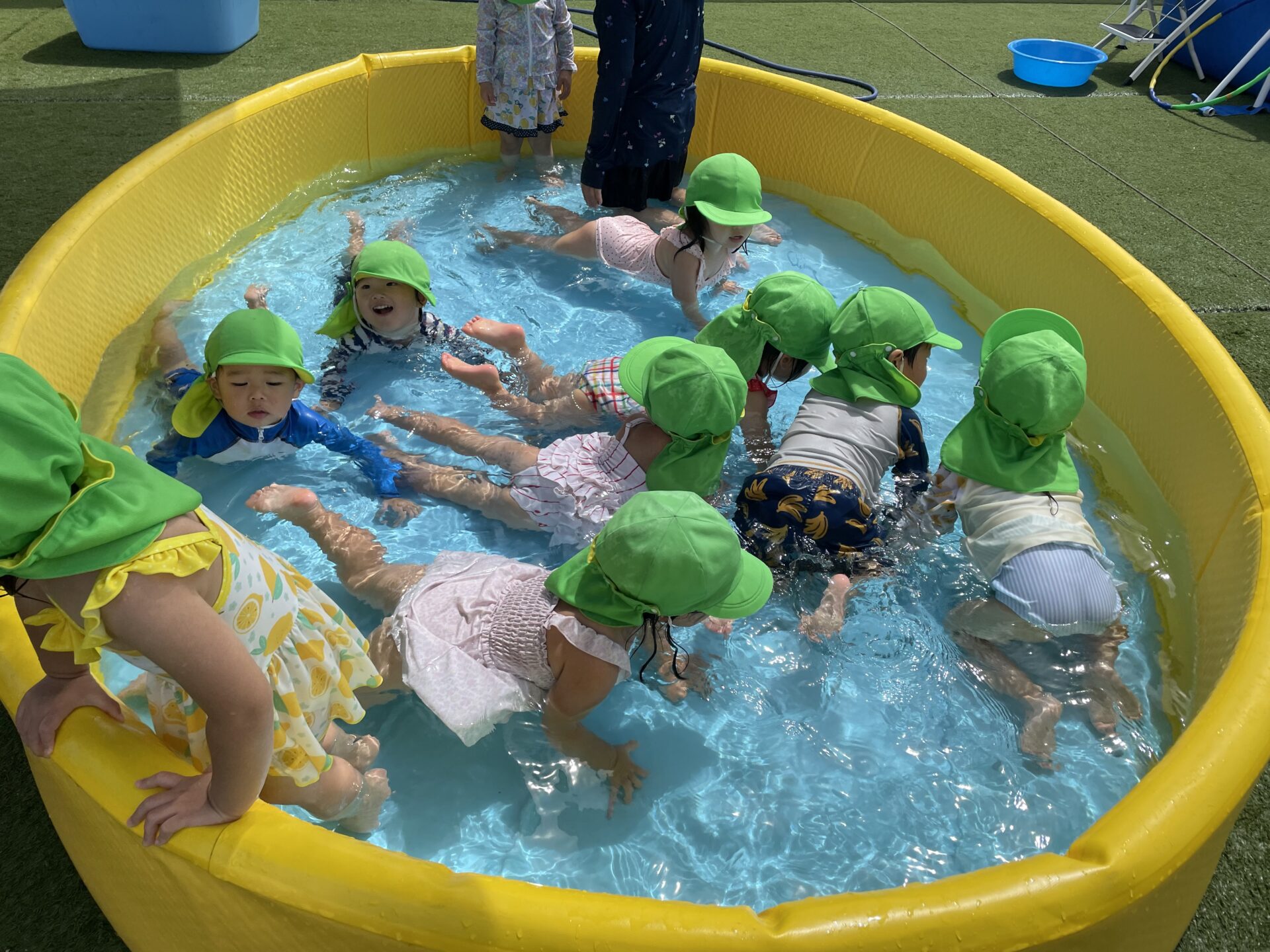2023.08.07 ブログ 2歳児 【あめ】♫待ちに待ったプール遊び♫ 屋上園庭で、プール遊びをしました。♪ 水遊びでも大はしゃぎのあめチームは、プール遊びとなるとお手のものです。😆 水を怖がり プールに入るのを躊躇う子どももいますが、水の中に入るとみんな嬉しそう。“‘水は、気持ちいいね〜👍“” 立ち上がって洗濯機のように“”ぐるぐる〜“” 上手に水の中を歩けるね♪ 今度は、ワニになって水面を泳ぐよ〜‼️“”す〜い す〜い“” まだまだ、暑い日が続きますので水分補給をしていきながら、水遊び・プール遊びを楽しみたいと思います。♫ 一覧へ戻る