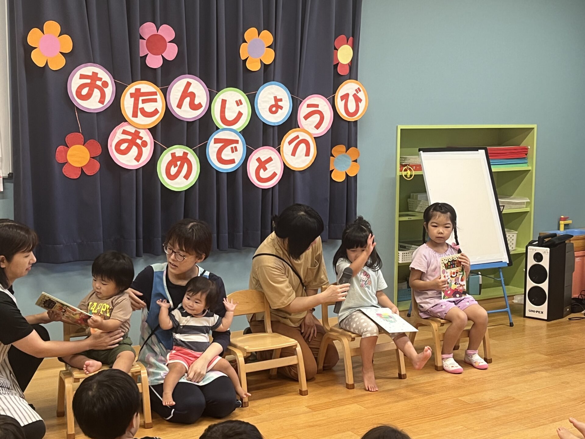 8月の誕生会をしました。8月生まれのお友達は、4人です。