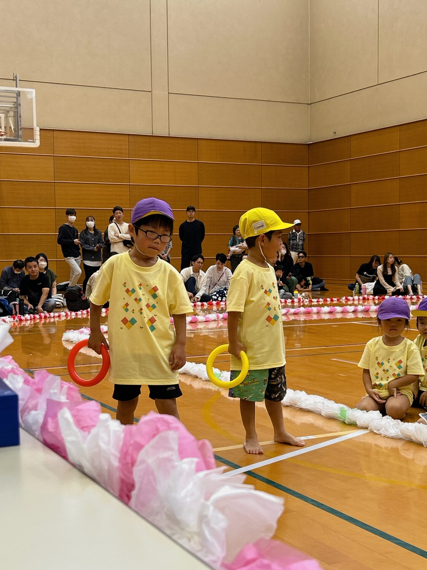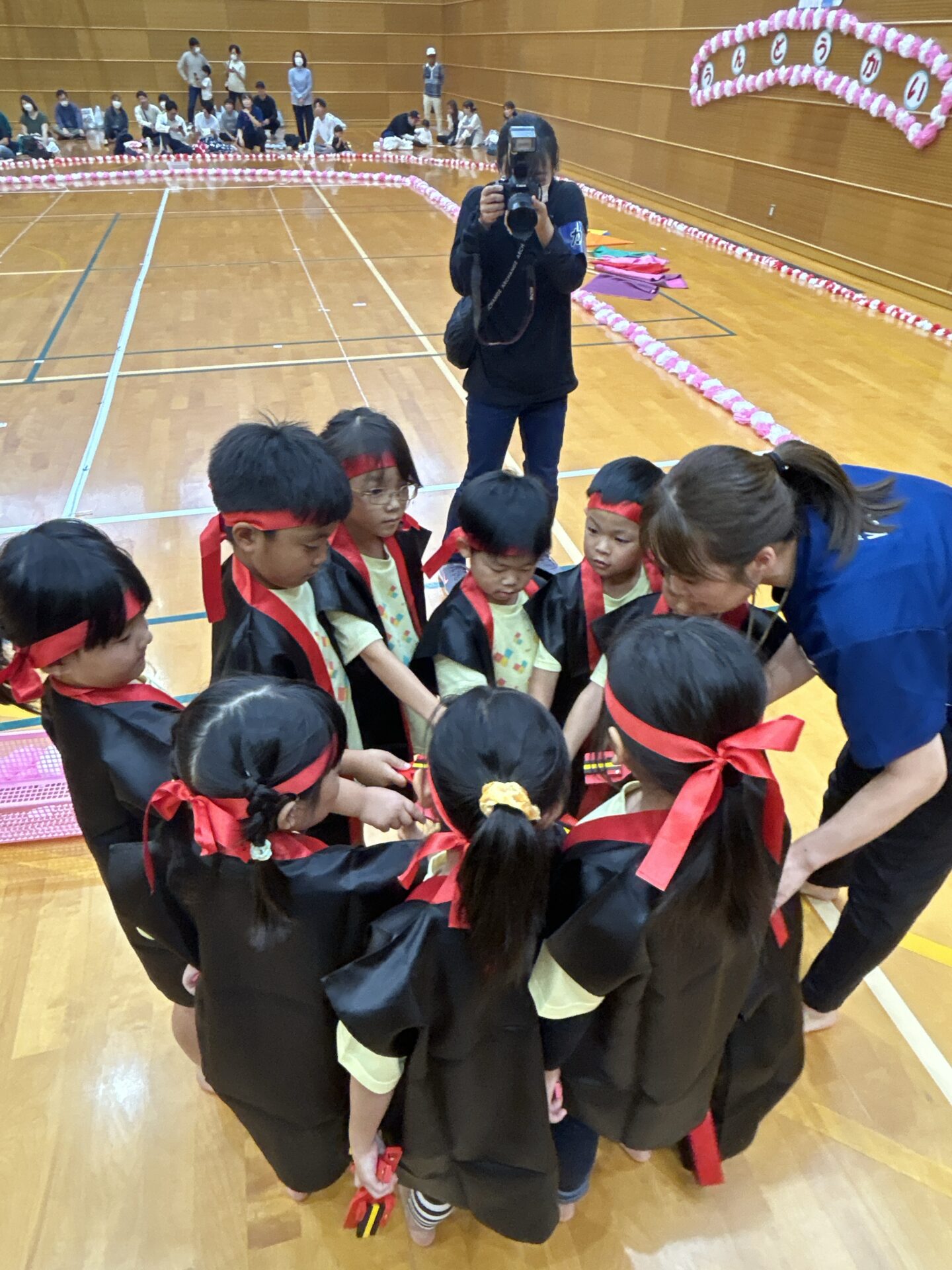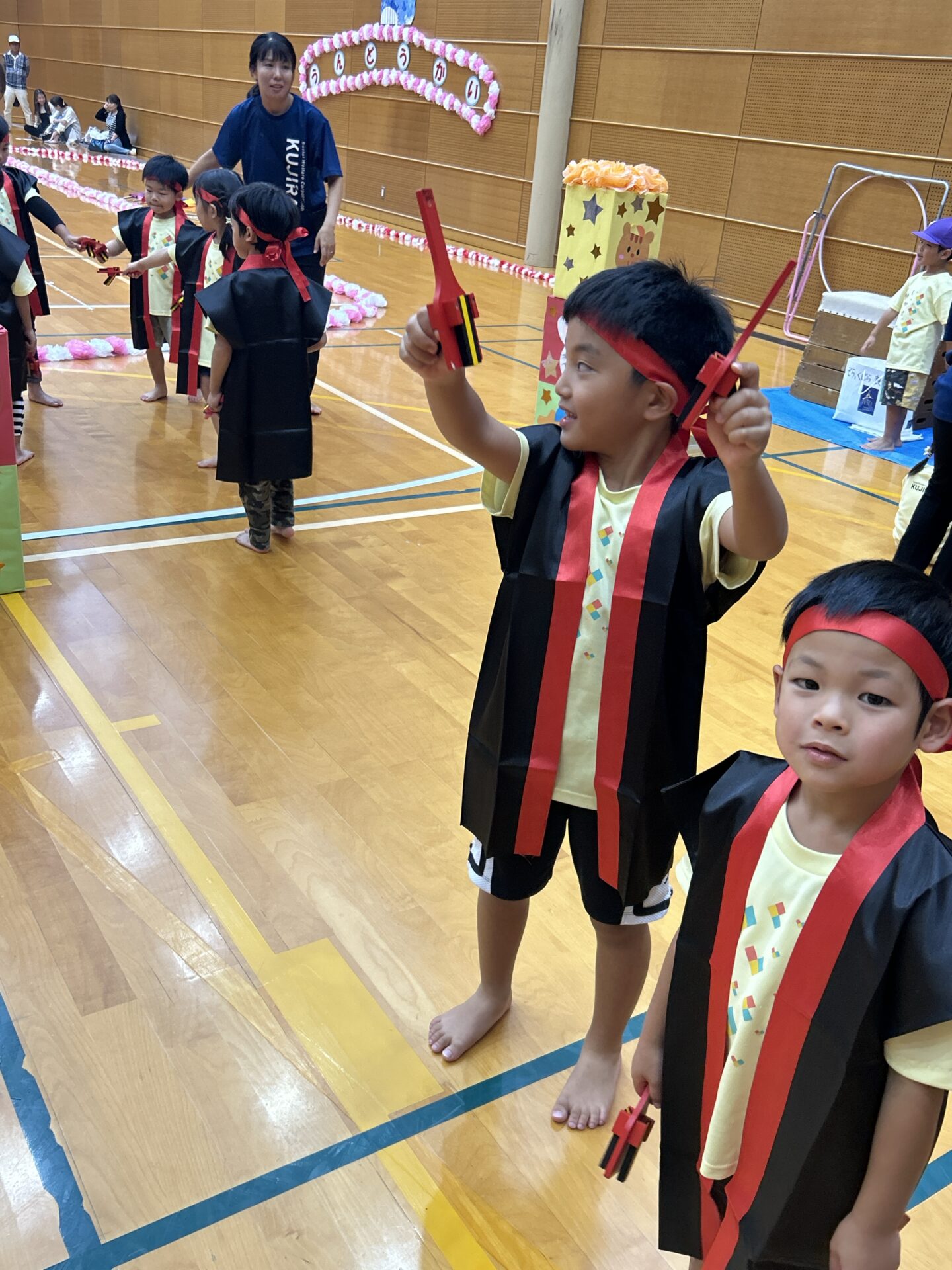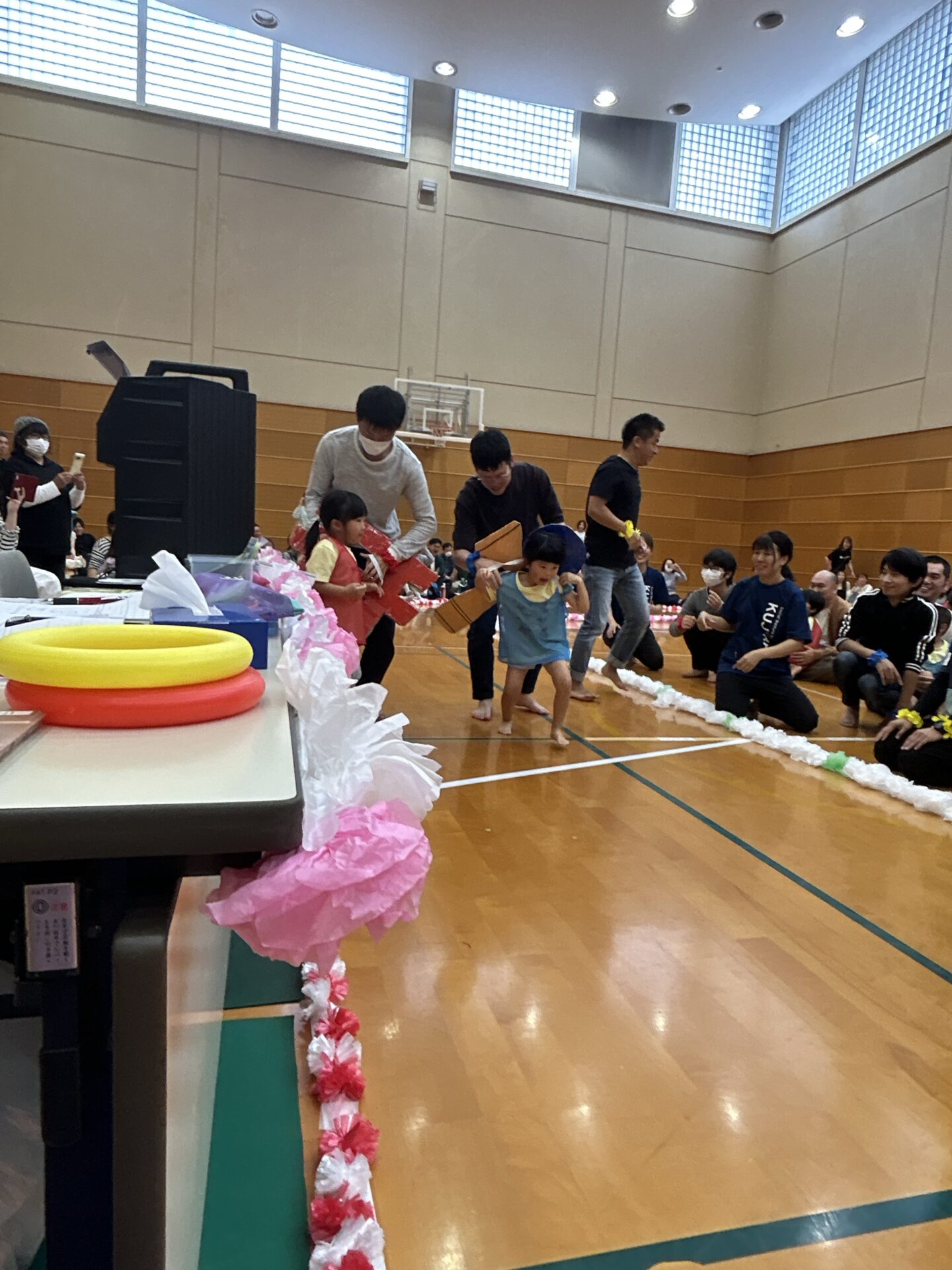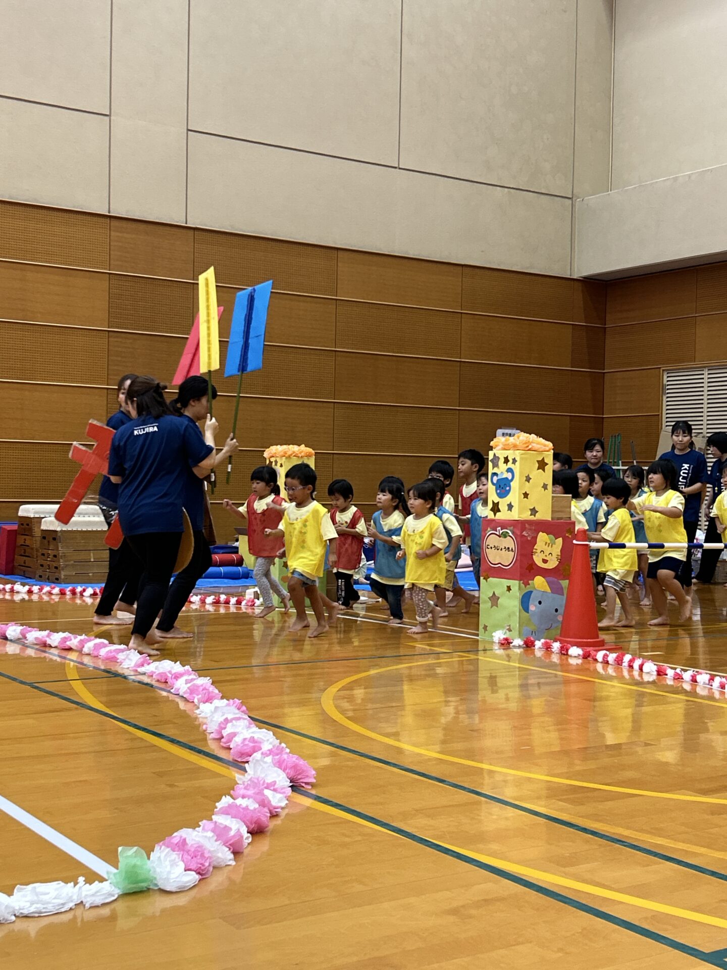 鳥居・けん玉・もみじ饅頭を段ボールで作り、バトン代わりにして、子どもは背負いお父さん・お母さんは手で持って走ります。子どもたちのリレーでは、暑い戦いを見せてくれた、そら・くじらチーム。お父さん・お母さんと力を合わせてバトンを繋ぎました。✨子どもたちのパワーに負けず頑張ってくださいました。😊
