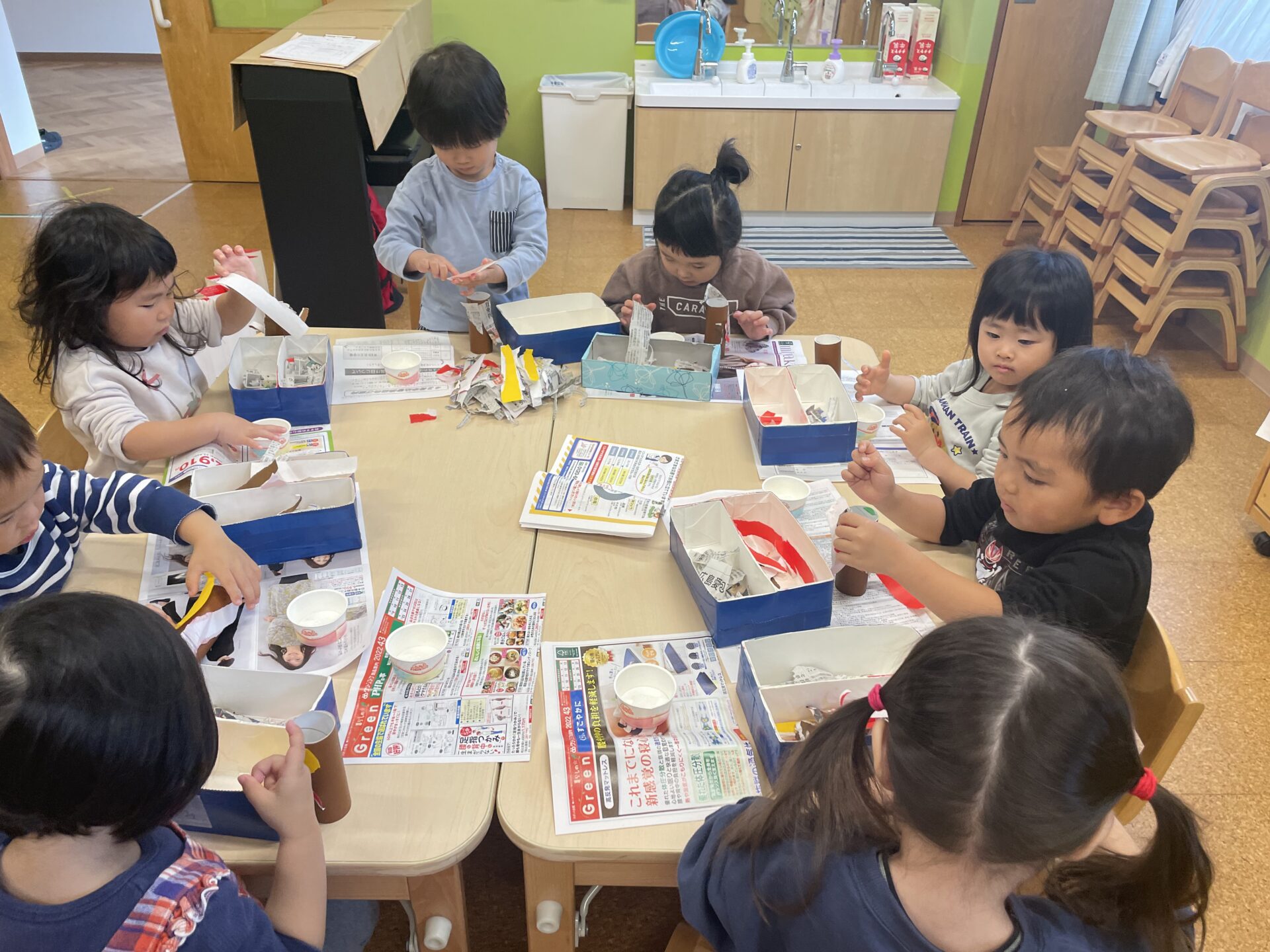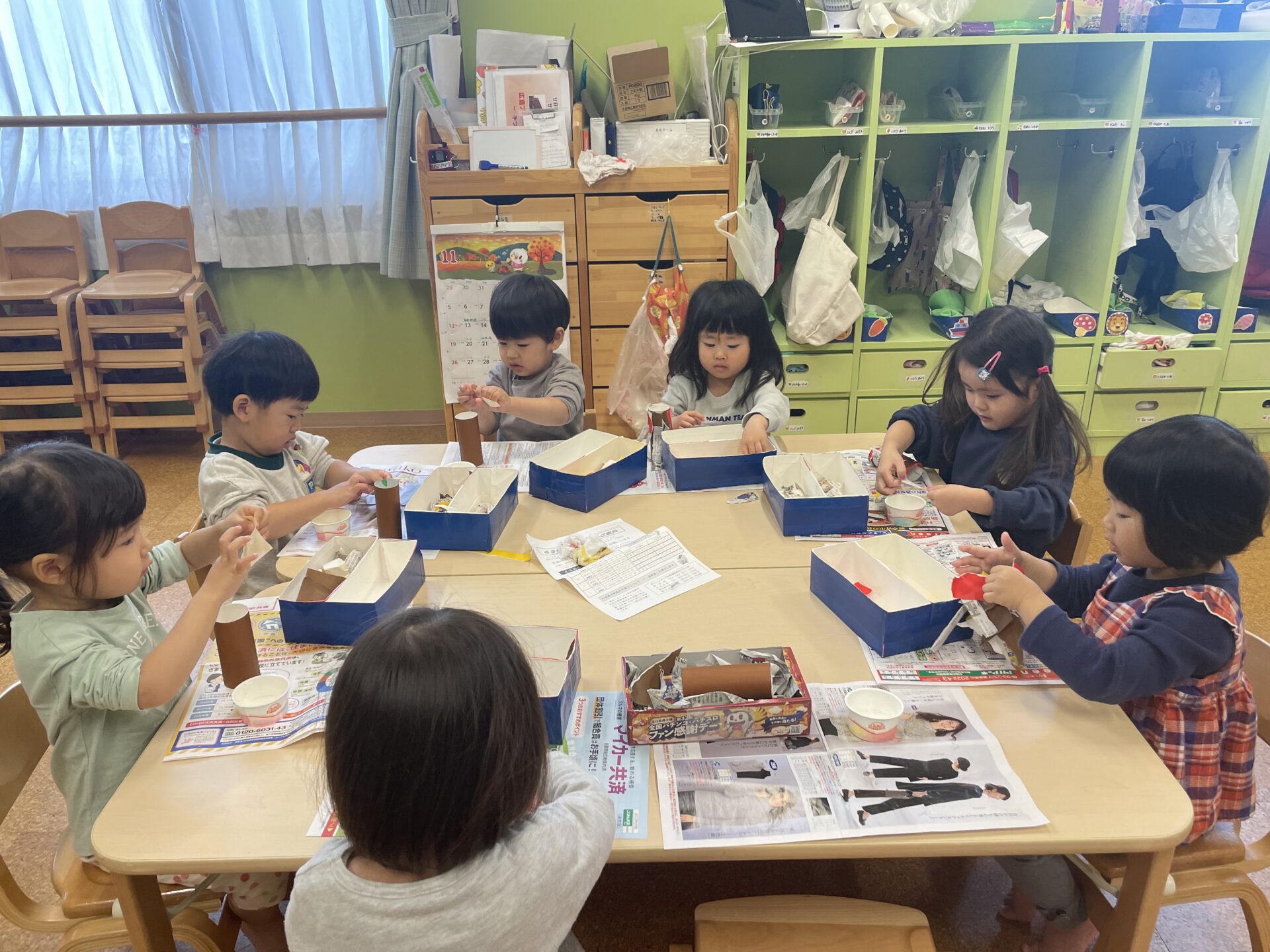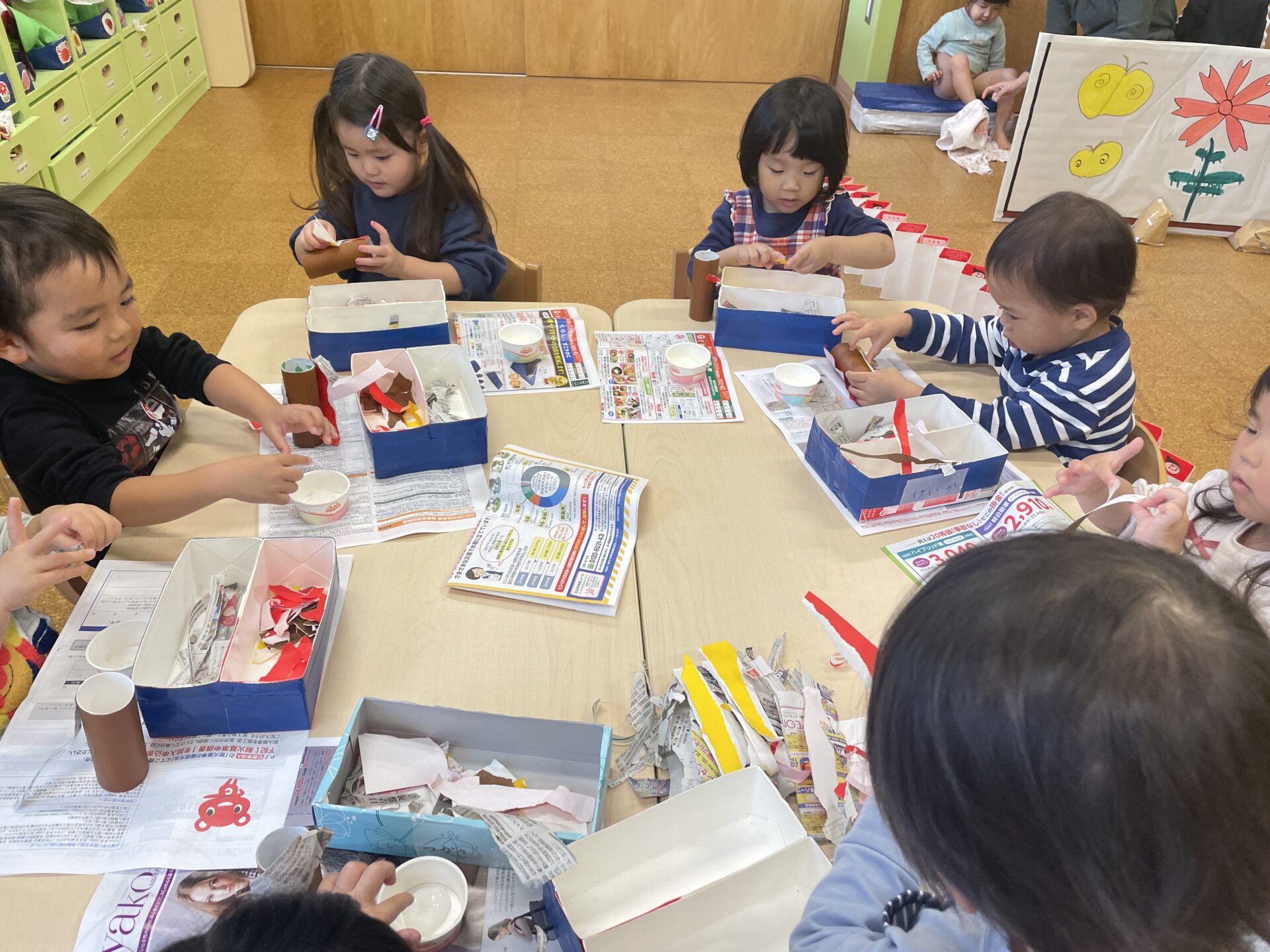 子どもたちも想像をするのが、難しそうにしていたので保育士が画像とお手本を見せました。すると、少し想像をすることが出来たようでお手本を見ながらみんな思い思いに洋服となる折り紙・新聞紙をちぎっていました。その後、のりを使ってミノムシの体につけていました。個性豊かなミノムシが完成しました。☺️